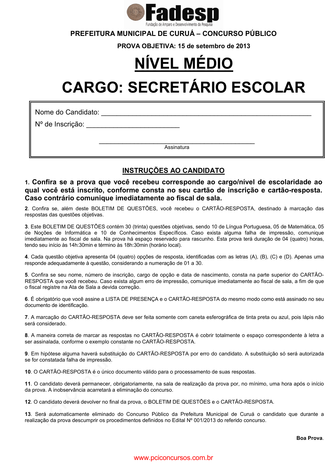 pcimarkpci MDAwMDowMDAwOjAwMDA6MDAwMDowMDAwOmZmZmY6YmZmMzo2ZTAx:VHVlLCAyMyBKdWwgMjAyNCAyMzoxNDoyNCAtMDMwMA== www.pciconcursos.com.br PREFEITURA MUNICIPAL DE CURUÁ – CONCURSO PÚBLICO PROVA OBJETIVA: 15 de setembro de 2013 NÍVEL MÉDIO CARGO: SECRETÁRIO ESCOLAR INSTRUÇÕES AO CANDIDATO 1. Confira se a prova que você recebeu corresponde ao cargo/nível de escolaridade ao qual você está inscrito, conforme consta no seu cartão de inscrição e cartão-resposta. Caso contrário comunique imediatamente ao fiscal de sala. 2. Confira se, além deste BOLETIM DE QUESTÕES, você recebeu o CARTÃO-RESPOSTA, destinado à marcação das respostas das questões objetivas. 3. Este BOLETIM DE QUESTÕES contém 30 (trinta) questões objetivas, sendo 10 de Língua Portuguesa, 05 de Matemática, 05 de Noções de Informática e 10 de Conhecimentos Específicos. Caso exista alguma falha de impressão, comunique imediatamente ao fiscal de sala. Na prova há espaço reservado para rascunho. Esta prova terá duração de 04 (quatro) horas, tendo seu início às 14h:30min e término às 18h:30min (horário local). 4. Cada questão objetiva apresenta 04 (quatro) opções de resposta, identificadas com as letras (A), (B), (C) e (D). Apenas uma responde adequadamente à questão, considerando a numeração de 01 a 30. 5. Confira se seu nome, número de inscrição, cargo de opção e data de nascimento, consta na parte superior do CARTÃO- RESPOSTA que você recebeu. Caso exista algum erro de impressão, comunique imediatamente ao fiscal de sala, a fim de que o fiscal registre na Ata de Sala a devida correção. 6. É obrigatório que você assine a LISTA DE PRESENÇA e o CARTÃO-RESPOSTA do mesmo modo como está assinado no seu documento de identificação. 7. A marcação do CARTÃO-RESPOSTA deve ser feita somente com caneta esferográfica de tinta preta ou azul, pois lápis não será considerado. 8. A maneira correta de marcar as respostas no CARTÃO-RESPOSTA é cobrir totalmente o espaço correspondente à letra a ser assinalada, conforme o exemplo constante no CARTÃO-RESPOSTA. 9. Em hipótese alguma haverá substituição do CARTÃO-RESPOSTA por erro do candidato. A substituição só será autorizada se for constatada falha de impressão. 10. O CARTÃO-RESPOSTA é o único documento válido para o processamento de suas respostas. 11. O candidato deverá permanecer, obrigatoriamente, na sala de realização da prova por, no mínimo, uma hora após o início da prova. A inobservância acarretará a eliminação do concurso. 12. O candidato deverá devolver no final da prova, o BOLETIM DE QUESTÕES e o CARTÃO-RESPOSTA. 13. Será automaticamente eliminado do Concurso Público da Prefeitura Municipal de Curuá o candidato que durante a realização da prova descumprir os procedimentos definidos no Edital Nº 001/2013 do referido concurso. Boa Prova. Nome do Candidato: ______________________________________________________ Nº de Inscrição: ________________________ ________________________________________ Assinatura www.pciconcursos.com.br pcimarkpci MDAwMDowMDAwOjAwMDA6MDAwMDowMDAwOmZmZmY6YmZmMzo2ZTAx:VHVlLCAyMyBKdWwgMjAyNCAyMzoxNDoyNCAtMDMwMA== www.pciconcursos.com.br 2 www.pciconcursos.com.br pcimarkpci MDAwMDowMDAwOjAwMDA6MDAwMDowMDAwOmZmZmY6YmZmMzo2ZTAx:VHVlLCAyMyBKdWwgMjAyNCAyMzoxNDoyNCAtMDMwMA== www.pciconcursos.com.br 3 LÍNGUA PORTUGUESA COM BASE NO TEXTO ABAIXO, ASSINALE A ALTERNATIVA QUE COMPLETA CORRETAMENTE AS QUESTÕES DE 01 A 10. Vamos ver se a gente se vê 1 2 3 4 5 6 7 8 9 10 11 12 13 14 15 16 17 18 19 20 21 22 23 24 25 26 27 28 29 30 31 32 33 Repeti mais uma vez a frase ao despedir-me de minha amiga na calçada. Nos esbarramos na rua e ficamos ali mesmo, entre abraços e beijos, lembrando o quanto gostamos uma da outra. Mas não havia tempo nem para um café. Ela corria pro trabalho, e eu, pra uma reunião. "Vamos ver se a gente se vê?" Frase esquisita. A instabilidade da concretização do encontro aparece na própria construção gramatical. É ridículo. Minha lista de amigos a encontrar só cresce na agenda. Sim, ainda uso agenda de papel, e é nela que meus compromissos de trabalho costumam ganhar dos de lazer. É natural que priorizemos o que precisamos ao que desejamos, mas inventamos uma vida tão louca que a velocidade dos dias aumentou descontroladamente o número de coisas que achamos que precisamos fazer. Tenho a sensação de que nossas escolhas estão sendo cada vez mais guiadas pela funcionalidade. Já deve ter muita gente trocando festinhas de aniversário por aulas de pilates. Adoro uma mesa com amigos, mas sinto que os que mais consigo encontrar são aqueles com quem estou trabalhando no momento. Não tomamos cuidado, e o capital vai metendo sorrateiramente o bedelho até em nosso ciclo de amizades. É a força caudalosa dos dias. Está todo mundo muito ocupado. Equalizar a agenda com um amigo para marcar um mero café já quase precisa de planilha. E aí nos é oferecido um pacote milagroso para encontrar amigos por atacado: o famigerado Facebook. Venci a resistência e abri uma conta. Fiquei três dias e fechei. Não aguentei rever tanta gente com quem tenho vontade de sentar para tomar uma cerveja. Imagina terminar cada conversa de cinco linhas com um "vamos ver se a gente se vê?". Não dou conta. Como vou ter 400 amigos se mal consigo encontrar minha melhor amiga, com quem passo horas conversando sem olhar uma vez sequer no visor do celular? Melhor continuar lutando por brechas de uma hora no ciclone dos dias para sentar numa mesa em gargalhadas cúmplices, nas quais o tempo pode parecer infinito. Disponível em: <http://www1.folha.uol.com.br/colunas/denisefraga/2013/08/1320147-vamos-ver-se-a-gente-se-ve.shtml> Acesso em: 15 ago. 2013 01. Outro título conveniente para o texto de Denise Fraga seria (A) O tempo infinito. (B) Amigos virtuais. (C) Entre abraços e beijos. (D) Sem tempo para os amigos. 02. A autora do texto, Denise Fraga, (A) acredita na amizade