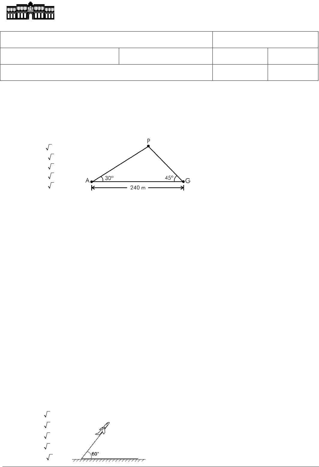 INSTITUTO FEDERAL DE EDUCAÇÃO, CIÊNCIA E TECNOLOGIA DO RIO GRANDE DO NORTE CAMPUS NATAL CIDADE ALTA 1 01. Abílio (A) e Gioconda (G) estão sobre uma superfície plana de uma mesma praia e, num dado instante, veem sob respectivos ângulos de 30º e 45º, um pássaro (P) voando, conforme é representado na planificação abaixo. Considerando desprezíveis as medidas das alturas de Abílio e Gioconda e sabendo que, naquele instante, a distância entre A e G era de 240 m, então a quantos metros de altura o pássaro distava da superfície da praia? a) )13(60 b) )13(120 c) )13(120 d) )13(180 e) )13(180 02. O Edifício Joelma tornou-se conhecido nacional e internacionalmente quando, em fevereiro de 1974, um incêndio provocou a morte de 188 pessoas. Foi inaugurado em 1971 e continha vinte e cinco andares, sendo dez de garagens. Hoje é denominado Edifício Praça da Bandeira. Suponha que cada andar tem 2 metros de altura e um carro de bombeiro tenha se posicionado em frente ao prédio incendiado. Se a inclinação máxima da escada é 30° e o seu tamanho máximo é 60m, qual será o último andar alcançado pela escada? a) 5º Andar. b) 7º Andar. c) 8º Andar. d) 10º Andar. e) 15º Andar. 03. Queremos encostar uma escada de sete metros de comprimento em uma parede de modo que ela forme um ângulo de 30° com a parede. A que distância da parede devemos apoiar a escada no solo? a) 1 m b) 2 m c) 2,5 m d) 3,5 m e) 5 m 04. Se um avião decola formando um ângulo de 60° com a horizontal e viaja em linha reta a uma velocidade de 400 km/h, então, após meia hora de voo, a altitude desse avião é de a) km350 b) km360 c) km375 d) km390 e) km3100 CURSO: Técnico Integrado em Multimídia TURMA: 1.20151.12807.__M COMPONENTE CURRICULAR: Matemática I PROFESSORES: Thiago Pardo/Kaline Andreza AVALIAÇÃO: Exercícios ETAPA: 2º bim DISCENTE: MATRÍCULA: NOTA: [Sem nota] 2 05. Uma estação E, de produção de energia elétrica, e uma fábrica F estão situadas nas margens opostas de um rio de largura 3 1 km. Para fornecer energia a F, dois fios elétricos a ligam a E, um por terra e outro por água, conforme a figura. Supondo-se que o preço do metro do fio de ligação por terra é R$ 12,00 e que o metro do fio de ligação pela água é R$ 30,00, o custo total, em reais, dos fios utilizados é: a) 28 000 b) 24 000 c) 15 800 d) 18 600 e) 25 000 06. Em uma rua plana, uma torre AT é vista por dois observadores X e Y sob ângulos de 30° e 60° com a horizontal, como mostra a figura abaixo. Se a distância entre os observadores é de 40m, qual é aproximadamente a altura da torre? (Se necessário, utilize 4,12 e 7,13 ). a) 30m b) 32m c) 34m d) 36m e) 38m 07. Duas rodovias A e B encontram–se em O, formando um ângulo de 30°. Na rodovia A existe um posto de gasolina que dista 5 km de O. O posto dista da rodovia B: a) 5 km b) 10 km c) 2,5 km d) 15 km e) 1,25 km 08. Na figura abaixo determinar o valor AB. A 5 0 3 0 ° 6 0 ° B