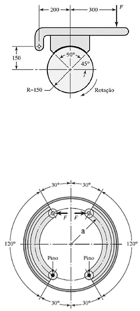 Lista de exercícios 1) O freio de mão de tipo bloco mostrado na figura abaixo (dimensões em mm) tem uma largura de face de 30 mm e um coeficiente de atrito de 0,25. A pressão máxima do freio é de 200 kPa. a) Encontre a força de acionamento e o torque de frenagem utilizando a teoria de sapata curta. b) Refaça os cálculos com a teoria de sapata longa. c) Verifique se por alguma das teorias há auto-acionamento. 2) A figura mostra um freio do tipo de tambor com sapatas, tendo um diâmetro interno de aro de 300 mm e uma dimensão a = 125 mm. As sapatas têm uma largura de face de 40 mm e são ambas acionadas por uma força de 2,0 kN. O tambor rotaciona no sentido horário. O coeficiente médio de atrito é 0,28. a) Encontre a pressão máxima e indique a sapata na qual ela ocorre. b) Calcule o torque de frenagem executado por cada sapata e encontre o torque total de frenagem. Utilize a teoria de sapata longa. 3) As sapatas rotuladas do freio da figura abaixo possuem 190 mm de largura e fazem um arco de 90° ao redor do tambor. A rotação do tambor é anti-horário e o atrito das sapatas é 0,35. As lonas são feitas de asbesto rígido moldado seco. Calcule a dimensão e para que haja desgaste constante. Calcule a força de acionamento P e torque de frenagem. 4) A pressão máxima da cinta da figura abaixo é de 620 kPa. O tambor possui 350 mm de diâmetro, largura de cinta de 100 mm, coeficiente de atrito de 0,25 e ângulo de contato de 215°. Encontre as forças na cinta e capacidade de torque. 5) O freio mostrado na figura abaixo possui coeficiente de atrito de 0,3, largura de 50 mm e é operado por uma força máxima F de 400 N. Encontre as forças na cinta e o torque de frenagem. 6) A figura abaixo mostra um freio de cinta com um oscilador que previne choques durante a frenagem. O ângulo de contato é 270°, o diâmetro do tambor é 210 mm, a largura da cinta é 54 mm e o coeficiente de atrito é 0,2. O acionamento do freio é feito ao girar o oscilador no sentido anti-horário. a) Calcule o valor mínimo de c1 para que o freio tenha auto-acionamento. b) Se o torque de frenagem for 200 Nm, calcule a pressão máxima na cinta. 7) Um motor possui uma potência de 13,7 kW e gira a 1000 rpm. Encontre a força de acionamento para um freio de disco com duas pastilhas para esse motor. O ângulo de pastilhas é de 60°, com o diâmetro interno sendo 90 mm e diâmetro externo sendo 160 mm. O coeficiente de atrito é 0,35. Considere que ocorre desgaste uniforme. 8) Um freio de disco com duas pastilhas deve fornecer um torque de frenagem de 90 Nm. As pastilhas devem possuir um ângulo de 90° e uma razão entre raios interno e externo de 0,6. Considerando que as pastilhas devem ser novas e as menores possíveis, quais devem ser suas dimensões? (obs: é necessário utilizar a tabela de materiais de freio para esse exercício) 9) Um freio de disco como na figura abaixo à esquerda com 2 pastilhas circulares de cada lado possui diâmetro de f = 0,3 e Pmax = 1,4 MPa. a) Encontre o torque de frenagem. b) Um novo par de pastilhas de mesmo diâmetro será acoplado na metade de baixo do disco (uma de cada lado). Qual o maior aumento possível para o torque? 10) Uma mola helicoidal suporta uma carga estática de 1110 N com deslocamento de 50 mm. O número de espiras ativas é 10 e o diâmetro médio de espira é 50 mm. Se a mola é feita de aço (E = 207 GPa, ν = 0,3), encontre o diâmetro do arame e a tensão para essa carga. 11) Uma mola helicoidal é utilizada para auxiliar no acionamento de um freio de um caminhão. A mola é de aço, onde E = 207 GPa, ν = 0,3, Su = 1,08 GPa e possui pré- deformação. O diâmetro médio da mola é de 30 mm, o arame possui diâmetro de 7,94 mm e o número de espiras ativas é igual a 5. Qual deve ser a força necessária para que a mola acione o sistema de freios em seu deslocamento máximo de projeto? Sabendo que a mola possui extremidades em ponta e planificadas, com uma delas livre para girar, verifique se ela flamba. 12) Uma mola helicoidal deve exercer uma força de 10 N após ter sido liberada 2,5 mm da condição de carga no comprimento sólido. O arame utilizado possui d = 1,05 mm e o índice de mola é igual a 6. Encontre a carga estática para a tensão admissível de 415 MPa. Encontre também o número de espiras ativas. Considere G = 79,6 GPa 13) Cada uma das molas da figura abaixo tem 10 espiras ativas e possuem d = 2,7 mm. O raio médio da espira é de 7,62 mm. A mola da direita tem um comprimento livre 12,7 mm maior que a mola da esquerda. Quando a carga de 450 N está atuando, a barra fica nivelada. Encontre a distância de x. Considere G = 79,6 GPa 14) Uma mola helicoidal é fabricada por aço ASTM A230 temperado ao óleo sem plastificação (G = 79,6 GPa), com diâmetro de arame de 4,5 mm. O índice de mola é igual a 5,78. Uma carga atuante varia de 260 N a 400 N, provocando um deslocamento de 8 mm. Considerando Sn = 301,4 MPa, calcule o número de espiras ativas e o fator de segurança para fadiga. 15) Um sistema necessita de uma mola que não ocorra flambagem e possua vida infinita com fator de segurança de 1,1 e confiabilidade de 90%. Três molas de aço A232 jateado (G = 80 GPa) e sem pré-deformação estão disponíveis para o projeto. A primeira com d = 6 mm, D = 30 mm e N = 12, a segunda com d = 8 mm, D = 50 mm e N = 8 e a terceira com d = 9 mm, D = 45 mm e N = 10. A mola sofre uma força de projeto que varia de 1,5 ± 1,0 kN. Todas as molas possuem extremidades em esquadro restritas e paralelas. Qual a mola adequada para o projeto? 16) Um eixo de cames gira a 650 rpm, fazendo com que o seguidor suba e desça uma vez por volta, como mostrado na figura abaixo. O seguidor é mantido em contato com o came por meio de uma mola helicoidal de compressão sujeita a uma força que varia de um mínimo de 300 N até a força máxima de projeto de 600 N; o comprimento da mola varia dentro de uma faixa de 25 mm. As extremidades são esquad