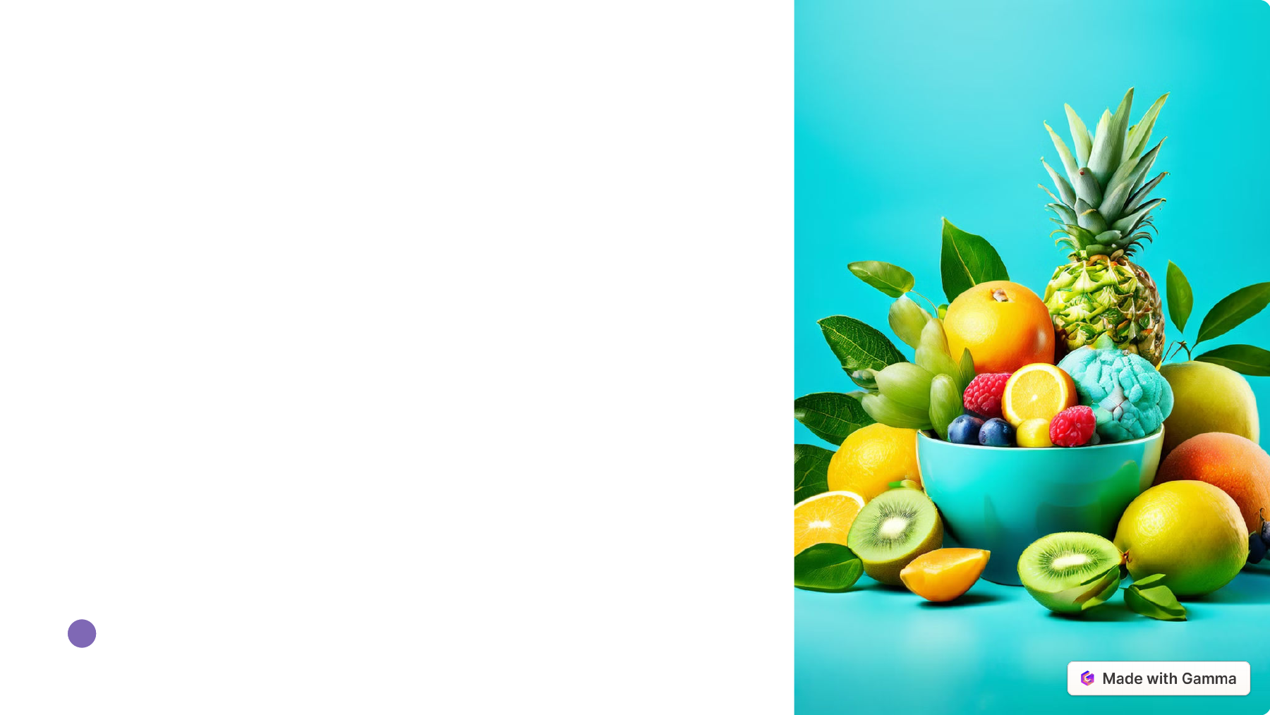 Introdução: A importância de uma alimentação saudável Uma alimentação saudável é fundamental para a manutenção da saúde e do bem-estar. Ao escolher alimentos nutritivos, podemos obter os nutrientes essenciais para o nosso corpo e prevenir doenças. by Gustavo de Castro FabriniGF https://gamma.app Macronutrientes: Carboidratos, proteínas e gorduras Carboidratos Os carboidratos fornecem energia ao nosso organismo. Devem ser consumidos em sua forma integral, como grãos, legumes e frutas. Proteínas As proteínas são essenciais para a construção e reparação de tecidos. Fontes saudáveis incluem carnes magras, ovos, legumes e laticínios. Gorduras As gorduras saudáveis, como as encontradas em peixes, castanhas e azeite, são importantes para a absorção de vitaminas e a saúde do coração. https://gamma.app Micronutrientes: Vitaminas e minerais essenciais 1 Vitaminas Essenciais para o funcionamento do organismo, como a vitamina C para o sistema imunológico e a vitamina A para a visão. 2 Minerais Incluem o cálcio para os ossos, o ferro para a produção de hemoglobina e o magnésio para a regulação do sistema nervoso. 3 Fontes Naturais Frutas, verduras, grãos integrais e laticínios são ótimas fontes desses micronutrientes essenciais. https://gamma.app Alimentos saudáveis: Frutas, vegetais, grãos integrais e proteínas magras Frutas e Verduras Ricos em fibras, vitaminas e minerais. Devem compor a maior parte da nossa alimentação. Grãos Integrais Fornecem carboidratos complexos, fibras e nutrientes. Prefira o arroz, pão e massas integrais. Proteínas Magras Carnes, peixes, ovos e legumes são boas fontes de proteínas com baixo teor de gordura. Laticínios Desnatados Opções como leite, iogurte e queijo desnatados são fontes ricas em proteínas e cálcio. https://gamma.app Dicas para uma alimentação equilibrada Porções Adequadas Respeite os tamanhos de porção recomendados para cada alimento. Hidratação Beba água regularmente para manter o corpo hidratado. Variedade Escolha diferentes alimentos em cada refeição para obter uma dieta equilibrada. Atividade Física Pratique exercícios regularmente para complementar uma alimentação saudável. https://gamma.app Planejamento de refeições e preparação de alimentos 1 Planejamento Faça uma lista de compras e crie um cardápio semanal para facilitar a escolha de refeições saudáveis. 2 Compras Dê preferência a alimentos frescos, minimamente processados e de boa qualidade. 3 Preparo Utilize técnicas de cozimento saudáveis, como assar, cozinhar no vapor ou grelhar. https://gamma.app Mitos e verdades sobre alimentação saudável Mito Verdade Dietas restritivas são a melhor forma de perder peso. Uma alimentação balanceada e a prática regular de exercícios são mais eficazes e saudáveis a longo prazo. Gorduras são sempre ruins para a saúde. Gorduras saudáveis, como as encontradas em peixes, nozes e azeite, são importantes para o organismo. Alimentos light são sempre mais saudáveis. É preciso analisar o valor nutricional do produto, não apenas a redução de calorias. https://gamma.app Conclusão: Adotando um estilo de vida saudável 1 Conscientização Entender a importância de uma alimentação saudável é o primeiro passo. 2 Mudança de Hábitos Substituir gradualmente alimentos processados por opções mais naturais. 3 Estilo de Vida Adotar uma dieta equilibrada e praticar atividades físicas regularmente. https://gamma.app