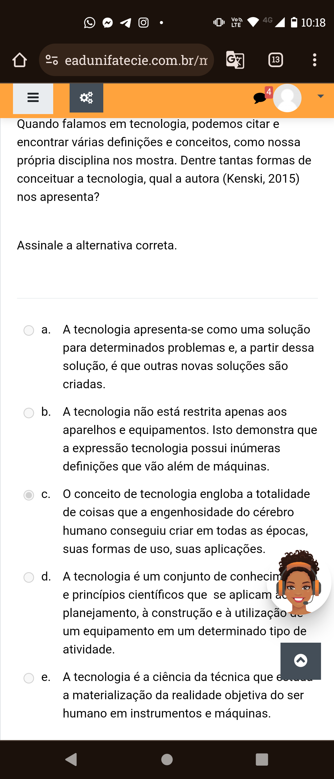 4G LTE F 10:18 eadunifatecie.com.br/n 13 4 Quando falamos em tecnologia, podemos citar e encontrar várias definições e conceitos, como nossa própria disciplina nos mostra. Dentre tantas formas de conceituar a tecnologia, qual a autora (Kenski, 2015) nos apresenta? Assinale a alternativa correta. a. A tecnologia apresenta-se como uma solução para determinados problemas e, a partir dessa solução, é que outras novas soluções são criadas. b. A tecnologia não está restrita apenas aos aparelhos e equipamentos. Isto demonstra que a expressão tecnologia possui inúmeras definições que vão além de máquinas. C. conceito de tecnologia engloba a totalidade de coisas que a engenhosidade do cérebro humano conseguiu criar em todas as épocas, suas formas de uso, suas aplicações. d. A tecnologia é um conjunto de conhecim e princípios científicos que se aplicam planejamento, à construção e à utilização um equipamento em um determinado tipo de atividade. e. A tecnologia é a ciência da técnica que a materialização da realidade objetiva do ser humano em instrumentos e máquinas.