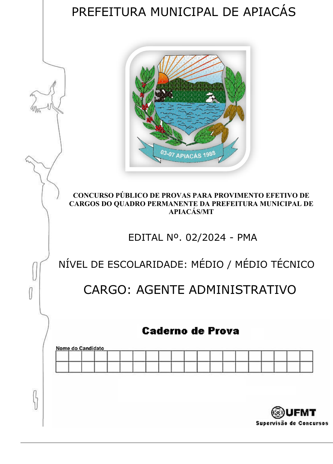pcimarkpci MDAwMDowMDAwOjAwMDA6MDAwMDowMDAwOmZmZmY6YjM4Mjo1M2Jl:VHVlLCAzMCBKdWwgMjAyNCAxMTo1MDoxNiAtMDMwMA== www.pciconcursos.com.br PREFEITURA MUNICIPAL DE APIACÁS EDITAL Nº. 02/2024 - PMA CARGO: AGENTE ADMINISTRATIVO CONCURSO PÚBLICO DE PROVAS PARA PROVIMENTO EFETIVO DE CARGOS DO QUADRO PERMANENTE DA PREFEITURA MUNICIPAL DE APIACÁS/MT NÍVEL DE ESCOLARIDADE: MÉDIO / MÉDIO TÉCNICO pcimarkpci MDAwMDowMDAwOjAwMDA6MDAwMDowMDAwOmZmZmY6YjM4Mjo1M2Jl:VHVlLCAzMCBKdWwgMjAyNCAxMTo1MDoxNiAtMDMwMA== www.pciconcursos.com.br I N S T R U Ç Õ E S LEIA COM ATENÇÃO 1. Este Caderno de Prova, com páginas numeradas de 1 a 17, é constituído de 40 (quarenta) questões objetivas, cada uma com 4 (quatro) alternativas, assim distribuídas: 01 a 10 – Língua Portuguesa 11 a 20 – Informática Básica 21 a 30 – Legislação Básica 31 a 40 – Conhecimentos Específicos 2. Caso o Caderno de Prova esteja incompleto ou tenha qualquer defeito de impressão, solicite ao fiscal que o substitua. 3. Sobre a Marcação do Cartão de Respostas As respostas deverão ser, obrigatoriamente, transcritas com caneta esferográfica de tinta azul ou preta não porosa, fabricada em material transparente, para o Cartão de Respostas, que será o único documento válido para correção. Não haverá substituição do Cartão de Respostas por erro do candidato. 3.1. Para cada questão existe apenas uma alternativa que a responde acertadamente. Para a marcação da alternativa escolhida no CARTÃO DE RESPOSTAS, pinte completamente o círculo correspondente. Exemplo: Suponha que para determinada questão a alternativa C seja a escolhida. Nº da Questão A B C D 3.2. Marque apenas uma alternativa para cada questão. 3.3. Será invalidada a questão em que houver mais de uma marcação, marcação rasurada ou emendada, ou não houver marcação. 3.4. Não rasure nem amasse o CARTÃO DE RESPOSTAS. 4. Todos os espaços em branco, neste caderno, podem ser utilizados para rascunho. 5. A duração da prova é 4 (quatro) horas, já incluído o tempo destinado ao preenchimento do CARTÃO DE RESPOSTAS. 6. Somente após decorridas 2 horas e 30 minutos do início da prova, o candidato, depois de entregar seu Caderno de Prova e seu Cartão de Respostas, poderá retirar-se da sala de prova. O candidato que insistir em sair da sala de prova antes desse tempo deverá assinar Termo de Ocorrência declarando sua desistência do concurso. 7. Na página 17 deste Caderno de Prova, encontra-se a Folha de Anotação do Candidato, a qual poderá ser utilizada para a transcrição das respostas das questões objetivas. Essa folha poderá ser levada pelo candidato para posterior conferência com o gabarito somente após decorridas 2 horas e 30 minutos do início da prova. 8. Será permitida a saída de candidatos levando o Caderno de Prova somente na última meia hora de prova. 9. Após o término da prova, o candidato deverá, obrigatoriamente, entregar ao fiscal o CARTÃO DE RESPOSTAS devidamente assinado (no espaço próprio) e preenchido. pcimarkpci MDAwMDowMDAwOjAwMDA6MDAwMDowMDAwOmZmZmY6YjM4Mjo1M2Jl:VHVlLCAzMCBKdWwgMjAyNCAxMTo1MDoxNiAtMDMwMA== www.pciconcursos.com.br 1 de 17 – Prefeitura Municipal de Apiacás – Agente Administrativo LÍNGUA PORTUGUESA Instrução: Leia atentamente o texto a seguir para responder às questões de 01 a 03. Desafios do crescimento urbano no Brasil No momento em que se discute novo pacto federativo para o país, é importante avaliar os desafios inerentes ao desenvolvimento dos municípios, a começar pela informação de que, a cada semana, 1,4 milhão de pessoas, em todo o mundo, migram para o meio urbano. Isso significa dizer que, a cada sete dias, a civilização global precisa prover alimentação, moradia, transportes, empregos, serviços de saúde e educação para uma nova Porto Alegre (população da capital gaúcha é de 1,48 milhão de habitantes — IBGE/2019). O fulminante ritmo da urbanização e crescimento populacional, que acontece nas cidades, além dos problemas intrínsecos à dificuldade de atender às necessidades básicas dos indivíduos e famílias, pode sobrecarregar as capacidades locais, contribuindo para aumentar o risco de ocupações desordenadas e desastres naturais. Invasões, loteamentos clandestinos sem nenhum tipo de infraestrutura de saneamento básico, queimadas, obstrução e poluição de rios e córregos e desmatamento sem compensações são alguns dos efeitos colaterais da incapacidade de resposta do Estado que provocam graves danos urbano-ambientais. Os problemas inerentes ao acelerado crescimento das populações urbanas são mais graves nos países em desenvolvimento, entre eles o Brasil. Aqui, como em outras nações, a demanda mais premente refere-se ao deficit habitacional. Trata-se de prioridade, pois habitação digna é o portal da cidadania. Sua ausência agrava a exclusão, gera a ocupação irregular do solo e provoca graves consequências socioambientais. O deficit habitacional brasileiro, de 7 milhões de moradias, tem múltiplas causas, sendo as principais: falta de planejamento de longo prazo; restrições ambientais; dependência de verbas públicas; crédito caro; legislações urbanísticas elitistas; judicialização de projetos aprovados; leniência com ocupações irregulares; inexistência de políticas públicas que incentivem investimentos privados; e aversão ao adensamento e verticalização. (Disponível em: https://www.correiobraziliense.com.br/app/noticia/opiniao/2020/01/11/. Acesso em: 27/02/2024.) QUESTÃO 01 Acerca dos elementos linguísticos usados nesse texto, marque V para as afirmativas verdadeiras e F para as falsas. ( ) Em “Trata-se de prioridade, pois habitação digna é o portal da cidadania.”, todas as palavras estão empregadas no sentido denotativo. ( ) Em “O fulminante ritmo da urbanização”, a anteposição do adjetivo ao substantivo sugere um posicionamento subjetivo do autor em relação ao tema abordado 