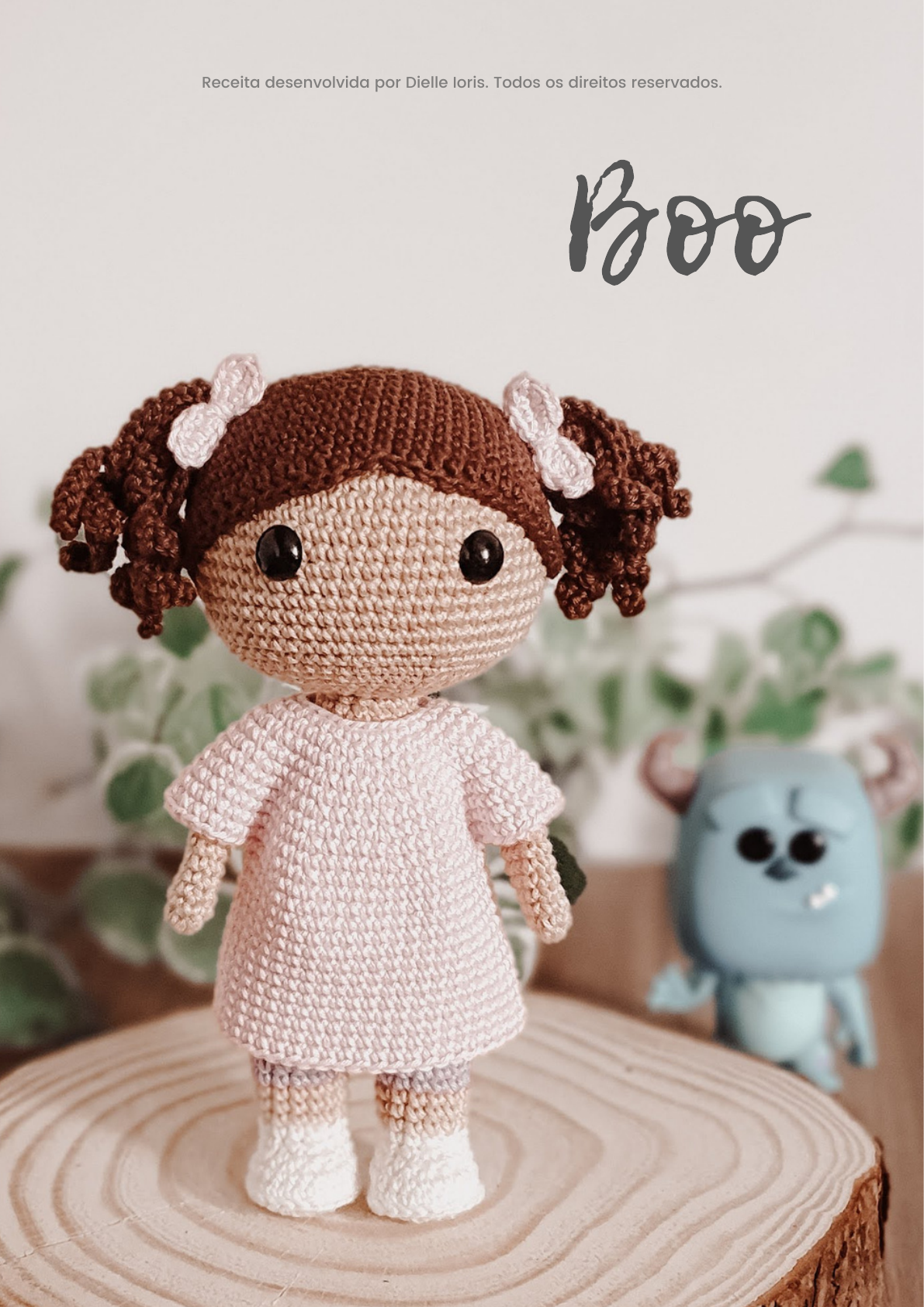 Receita desenvolvida por Dielle Ioris. Todos os direitos reservados. Muito obrigada por acreditar e apoiar meu trabalho! Você está apoiando um trabalho manual e independente. Seu apoio é de extrema importância para que eu continue trazendo novos conteúdos, técnicas e dicas que podem facilitar e, até mesmo, melhorar o seu trabalho. Atenção! Receita desenvolvida por Dielle Ioris. Todos os direitos reservados. Esta receita foi desenvolvida por Dielle Ioris (@ellescrochet). Receita de caráter exclusivo para apoiadores da Ordem dos Amigurumis. Proibido o compartilhamento deste arquivo em outras plataformas, drives e qualquer tipo de rede social ou de mensagens e de maneira impressa! Os amigurumis feitos a partir desta receita podem ser vendidos. O arquivo é de uso pessoal e intransferível! Não colabore com a pirataria! Receita desenvolvida por Dielle Ioris. Todos os direitos reservados. Oi, me chamo Dielle Ioris, e sou a criaturinha por trás do @ellescrochet, e sempre fui uma pessoa apaixonada por artes manuais. Eu conheci a técnica amigurumi através de uma amiga que ganhou um gatinho feito em crochê, e fiquei muito interessada em aprender mais sobre. Mas na época, infelizmente, estava em reta final de faculdade e sem tempo algum para me dedicar a qualquer tipo de artesanato ou qualquer outro hobby. Ao final da faculdade, fiquei meio que com um vazio, sem ter o que fazer, além de crises de ansiedade terríveis e ataques de pânico, o que me faziam perder a vontade de sair de casa ou fazer qualquer coisa, até mesmo ir ao cinema sozinha (uma das minhas atividades de lazer preferida). Mas, em um dia "bom", eu coloquei na minha cabeça que iria aprender a fazer amigurumis, e fui atrás de aprender! Comprei materiais e comecei aprender por conta, somente assistindo vídeos no Youtube. Após terminar a minha primeira peça, criei a minha página no Instagram e coloquei o nome de Elle's Crochet. E o que começou como um hobby, hoje em dia, é meu trabalho! Hoje já temos quatro anos de página, e eu espero que muitos outros venham pela frente! Sobre a artesã am: anel mágico aum: aumento dim: diminuição pb: ponto baixo mpa: meio ponto alto pa: ponto alto pbx: ponto baixíssimo corr: correntinha (): numero de pontos ao finalizar cada carreira []: sequência de repetições dentro da mesma carreira - Fio Amigurumi nas cores amêndoa (7650), off-white (8176), malva lilás (6802), quartzo rosa (3077) e brigadeiro (7569). - Agulha de crochê nº 2.2mm - Agulha de tapeçaria - Agulha de boneca - Olhos com trava de segurança nº 13 - Enchimento Nível de dificuldade: Intermediário/avançado Tempo de execução: de 6 a 8 horas Tamanho: com os materiais utilizados, a Boo ficou com 20 centímetros. (variações do tamanho podem ocorrer de acordo com a tensão de seu ponto, tamanho da agulha, e materiais escolhidos para a confecção da peça). Lista de Materiais Informações sobre a receita Abreviações Atenção: recomendo que você siga a sequência do passo a passo como descrito neste arquivo para tecer sua Boo! Cabeça - use o fio amigurumi na cor amêndoa 1) 6pb em um anel mágico (6) 2) 6 aumentos (12) 3) [1pb, aum] x6 (18) 4) [2pb, aum] x6 (24) 5) [3pb, aum] x6 (30) 6) [4pb, aum] x6 (36) 7) [5pb, aum] x6 (42) 8) [6pb, aum] x6 (48) 9) [7pb, aum] x6 (54) 10) [8pb, aum] x6 (60) 11 a 21) pb em toda a volta (60) - 11 carreiras Posição dos olhos: Os olhos devem ser posicionados entre as carreiras 15 e 16 com 12 pontos de distância entre eles. Use alfinetes para encontrar a posição correta dos olhos. Agora é só colocar seus olhos com trava de segurança. 22) [8pb, dim] x6 (54) 23) [7pb, dim] x6 (48) 24) [6pb, dim] x6 (42) 25) [5pb, dim] x6 (36) 26) [4pb, dim] x6 (30) 27) [3pb, dim] x6 (24) 28) [2pb, dim] x6 (18) Preencha a cabeça com fibra siliconada. 29) faça pontos baixos pegando somente as alças de trás do ponto (18) 30 a 36) pb em toda a volta (18) - 7 carreiras Não coloque mais enchimento depois da carreira 28; Arremate e esconda a sobra de fio. Agora você deve empurrar essa sobra de carreiras para dentro da cabeça da Boo, pois ela que possibilitará a articulação da mesma. Obs: A cabeça ficará aberta, mas fique tranquila, na hora de montar a articulação do pescoço esse buraco será fechado impedindo que a fibra saia pela abertura. Sobra que possibilitará a articulação da cabeça. Ao terminar de tecer, a cabeça ficará com este aspecto. Essa sobra criada a partir da carreira 29 é o que possibilitará a articulação da cabeça. Agora, empurre essa sobra para dentro da cabeça. Se necessário, tire um pouco do enchimento para facilitar. A cabeça ficará desta maneira ao final. Braços Faça duas peças. 1) 5pb em um anel mágico (5) 2) 5 aumentos (10) 3 a 16) pb em toda a volta (10) - 14 carreiras 17) dobre a abertura dos braços ao meio e trabalhe pontos baixos pegando os dois lados da carreira (5) Arremate o fio; estas peças não necessitam de enchimento. - use o fio amigurumi na cor amêndoa Corpo Iremos tecer o corpo da Boo de baixo para cima, portanto, começaremos a trabalhar a partir das pernas para posterior união e formação do corpo. Primeira perna Comece com fio amigurumi na cor off-white 1) 6pb em um anel mágico (6) 2) 6 aumentos (12) 3) [1pb, aum] x6 (18) Terceira alça As alças do ponto que trabalhamos normalmente ficam projetadas para "fora". Sua peça ficará com esta textura ao final. 6) pb em toda a volta (24) - 1 carreira 7) 6pb, 6dim, 6pb (18) 8) 6pb, 3dim, 6pb (15) 9) pb em toda a volta (15) - 1 carreira Troque para o fio amigurumi na cor amêndoa. 10 a 12) pb em toda a volta (15) - 3 carreiras Troque para o fio amigurumi na cor malva lilás. 13 a 18) pb em toda a volta (15) - 6 carreiras Arremate a primeira perna e esconda a sobra de fio; preencha a perna com fibra siliconada. Segunda perna Repita os passos de 1 a 18 da primeira perna mas, desta vez, você NÃO DEVE arrematar o fio. Iremos fazer a união das pernas para a for