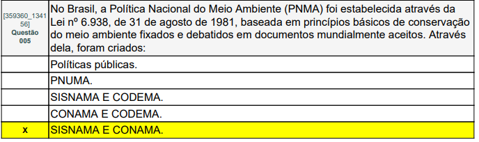 No Brasil, a Política Nacional do Meio Ambiente (PNMA) foi estabelecida através da [359360_1341 56] Lei 6.938, de 31 de agosto de 1981, baseada em princípios básicos de conservação Questão do meio ambiente fixados e debatidos em documentos mundialmente Através 005 dela, foram criados: Políticas públicas. PNUMA. SISNAMA E CODEMA. CONAMA E X SISNAMA E