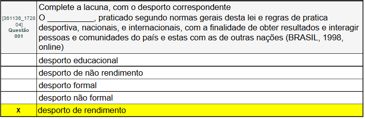 Complete a lacuna, com desporto correspondente [361136_1728 o , praticado segundo normas gerais desta lei e regras de pratica 04] Questão desportiva, nacionais, e internacionais, com a finalidade de obter resultados e interagir 001 pessoas e comunidades do país e estas com as de outras nações (BRASIL, 1998, online) desporto educacional desporto de não rendimento desporto formal desporto não formal X desporto de rendimento