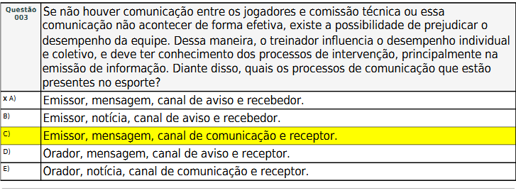 Questão Se não comunicação entre os jogadores e comissão técnica ou essa 003 comunicação não acontecer de forma efetiva, existe a possibilidade de prejudicar o desempenho da equipe. Dessa maneira, treinador influencia o desempenho individual e coletivo, e deve ter conhecimento dos processos de intervenção, principalmente na emissão de informação. Diante disso, quais os processos de comunicação que estão presentes no esporte? Emissor, mensagem, canal de aviso e recebedor. B) Emissor, notícia, canal de aviso e recebedor. C) Emissor, mensagem, canal de comunicação e receptor. D) Orador, mensagem, canal de aviso e receptor. E) Orador, notícia, canal de comunicação e receptor.