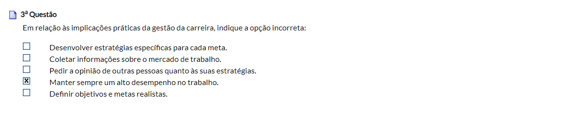 Questão Em relação às implicações práticas da gestão da indique a opção incorreta: Desenvolver estratégias específicas para cada meta. Coletar informações sobre mercado de trabalho. Pedir a opinião de outras pessoas quanto às suas estratégias. Manter sempre um alto desempenho no trabalho. Definir objetivos e metas realistas.