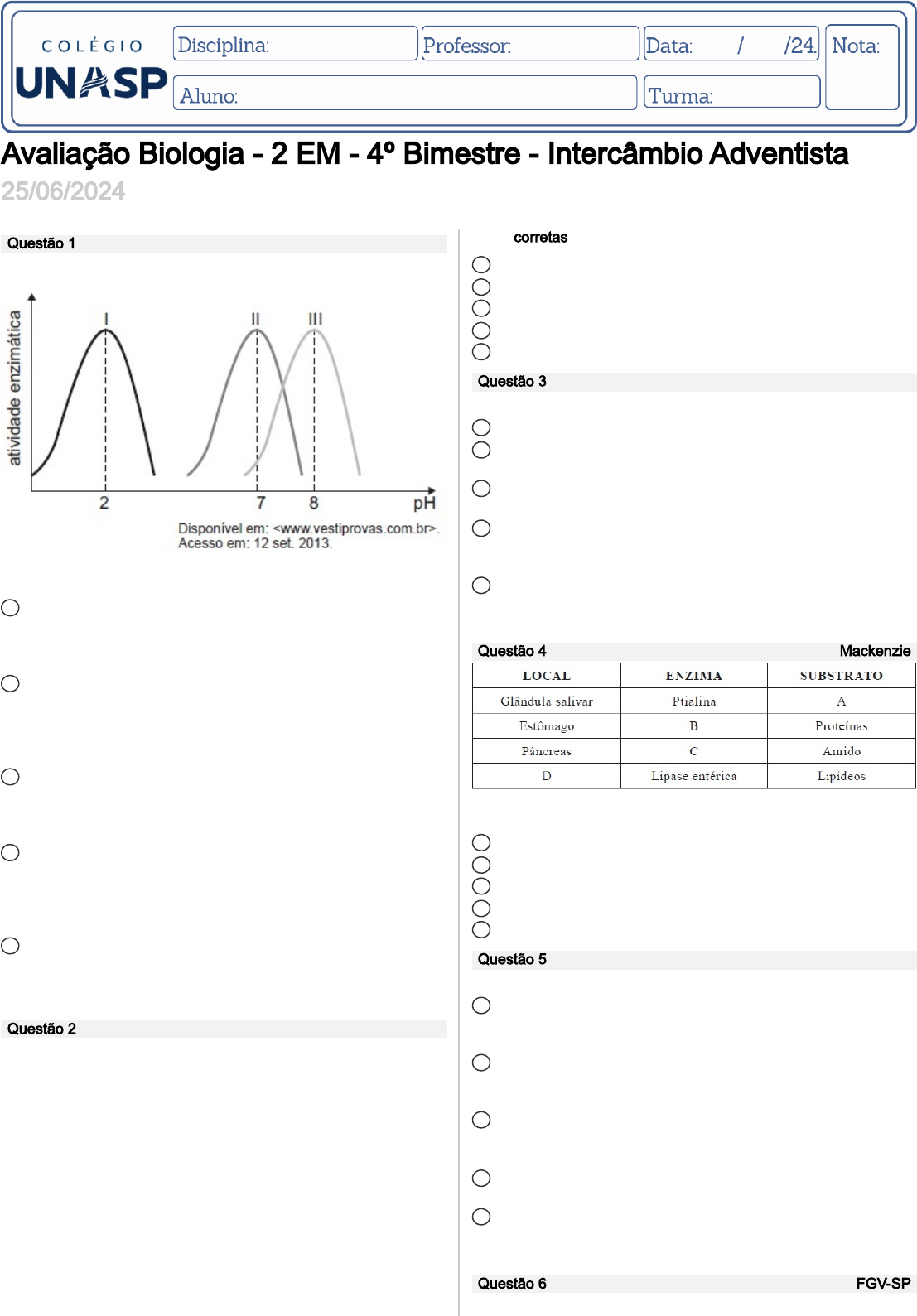 Avaliação Biologia - 2 EM - 4º Bimestre - Intercâmbio Adventista 25/06/2024 Questão 1 O gráfico abaixo mostra a atividade de algumas enzimas digestivas humanas em diferentes valores de pH. Com base nessa informação, assinale a afirmativa correta com relação às enzimas que estão atuando nas curvas I, II e III. a I corresponde à atividade da pepsina, que é a principal enzima do suco pancreático; II corresponde à atividade da ptialina, que inicia a digestão do amido e do glicogênio na boca; III corresponde à atividade da tripsina, que é a principal enzima do suco gástrico. b I corresponde à atividade do pepsinogênio, que é a principal enzima do suco gástrico; II corresponde à atividade da ptialina, que inicia a digestão da proteína e do glicogênio na boca; III corresponde à atividade da tripsina, que é produzida pelo pâncreas e age no intestino delgado. c I corresponde à atividade da pepsina, que é a principal enzima do suco gástrico; II corresponde à atividade da alfa amilase, que inicia a digestão do amido na boca; III corresponde à atividade da lipase, que é produzida pelo pâncreas e age no intestino delgado. d I corresponde à atividade da tripsina, que é a principal enzima do suco gástrico; II corresponde à atividade da pepsina, que inicia a digestão do amido e do glicogênio na boca; III corresponde à atividade da ptialina, que é produzida pelo pâncreas e age no intestino delgado. e I corresponde à atividade da pepsina, que é a principal enzima salivar; II corresponde à atividade da ptialina, que é a principal enzima do suco gástrico; III corresponde à atividade da tripsina, que é produzida pelo pâncreas e age no intestino delgado. Questão 2 As proteínas são polímeros de aminoácidos muito grandes para serem absorvidas pelo intestino e, sendo assim, devem ser hidrolisadas até seus aminoácidos que são moléculas mais simples, os quais serão absorvidos. Sobre a digestão das proteínas pode-se afirmar: I. São digeridas no duodeno pela ação da enzima proteolítica lipase que é ativada pelo ácido clorídrico produzido no estômago. II. A digestão das proteínas inicia-se no estômago pela ação da enzima pepsina que atua no meio de pH ácido mantido pelo ácido clorídrico. III. A tripsina é sintetizada no pâncreas e atua no intestino delgado metabolizando as proteínas da dieta. IV. A ação proteolítica das enzimas digestivas ocorrem nas ligações peptídicas existentes entre os aminoácidos. Elas são quebradas pelas pepsinas. Estão corretas as sentenças: a I e II, somente. b II, III e IV, somente. c III e IV somente. d I, II e IV, somente. e II e III, somente. Questão 3 A respeito da digestão humana, não se pode afirmar que: a na boca ocorre a digestão do amido. b o esôfago realiza movimentos peristálticos conduzindo o bolo alimentar até o estômago. c no estômago há produção de ácido clorídrico e suco gástrico, ocorrendo nele a digestão das proteínas. d o duodeno é a segunda porção do intestino delgado, onde ocorre a absorção dos nutrientes e se encerra a digestão dos lipídios. e o jejuno e o íleo são porções do intestino delgado onde ocorre a absorção de solutos e onde vivem as bactérias da flora intestinal. MackenzieQuestão 4 Os espaços A, B, C e D são preenchidos correta e respectivamente por a glicose, tripsina, amilase, fígado. b lipídeos, tripsina, lipase, intestino grosso. c amido, pepsina, amilase, intestino delgado. d maltose, pepsina, tripsina, intestino delgado. e amido, protease, tripsina, intestino grosso. Questão 5 Sobre o sistema digestório, marque a alternativa incorreta. a A liberação de HCL, pelas células do estômago, torna seu pH bastante ácido, o que permite a ação da principal enzima digestiva do estômago, a pepsina. b O Pepsinogênio é convertido em pepsina apenas na presença do HCL, que transforma o pH do estômago em ácido, permitindo a conversão da enzima. c A enzima amilase, produzida pelas glândulas salivares, é responsável pela quebra do polissacarídeo, que é a preferência para o armazenamento de energia. d O estômago é o local em que ocorre a digestão mais completa dos componentes orgânicos da alimentação humana. e A lipase é secretado pelo pâncreas e atua no duodeno, na qual é digere as gorduras com a ajuda da Bile, produzida no fígado e armazenada na vesícula biliar. FGV-SPQuestão 6 O principal órgão digestivo do ser humano adulto não é o estômago, como muitos equivocadamente afirmam, mas sim o intestino. Tal informação é justificada, fisiologicamente, pela presença preponderante de uma enzima específica no estômago, responsável pela digestão apenas a de proteínas e lipídeos, não ocorrendo a absorção de nutrientes e água, enquanto no intestino ocorre a digestão de proteínas, lipídeos e carboidratos, seguida pela absorção de nutrientes e água. b de proteínas e aminoácidos, não ocorrendo a absorção de nutrientes e água, enquanto no intestino ocorre a digestão de lipídeos e carboidratos, seguida pela absorção de nutrientes e água. c inicial de lipídeos, não ocorrendo a absorção de nutrientes e água, enquanto no intestino ocorre a digestão de proteínas e carboidratos, seguida pela absorção de nutrientes e água. d inicial de proteínas, ocorrendo também a absorção de água, enquanto no intestino ocorre a digestão de proteínas, lipídeos e carboidratos, seguida pela absorção de nutrientes e água. e de carboidratos e lipídeos, ocorrendo também a absorção de nutrientes e água, enquanto no intestino ocorre a digestão de proteínas, lipídeos e carboidratos, seguida pela absorção de nutrientes. Questão 7 A respeito das estruturas apontadas, assinale a alternativa correta. a A maior parte do amido é digerida na região 3 pela amilase. b A estrutura 4 é responsável pela produção de bile. c O mau funcionamento da glândula 1 é responsável por provocar diabe