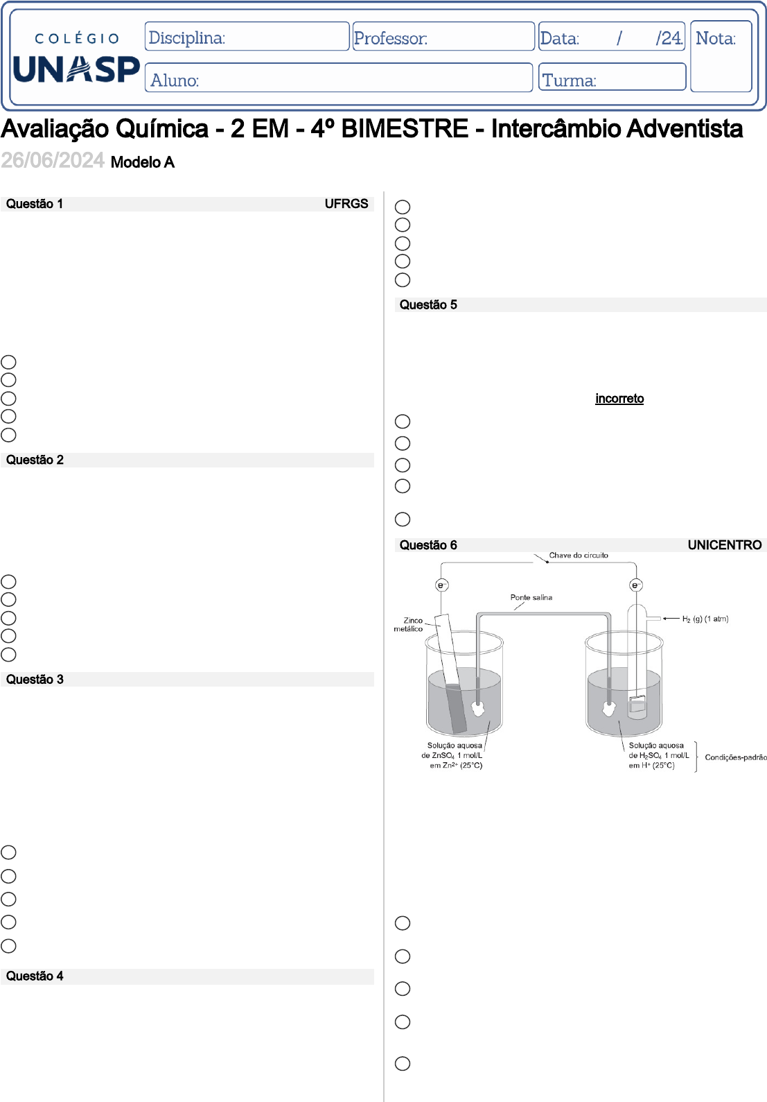 Avaliação Química - 2 EM - 4º BIMESTRE - Intercâmbio Adventista 26/06/2024 Modelo A UFRGSQuestão 1 Considere as seguintes afirmações a respeito de pilhas eletroquímicas, nas quais uma reação química produz um fluxo espontâneo de elétrons. I - Os elétrons fluem, no circuito externo, do ânodo para o cátodo. II - Os cátions fluem, numa ponte salina, do cátodo para o ânodo. III- A reação de oxidação ocorre no cátodo. Quais estão corretas? a Apenas I. b Apenas II. c Apenas III. d Apenas I e II. e I, II e III. Questão 2 Balanceie, por oxirredução, a reação abaixo: H2O2 + MnO4 -1 + H + → Mn +2 + H2O + O2 A soma total dos coeficientes dessa equação após o devido balanceamento é igual a a 22 b 24 c 28 d 19 e 32 Questão 3 Uma pilha foi construída utilizando eletrodos de cromo e zinco imersos em soluções de sulfato dos cátions divalentes desses metais. A tabela a seguir apresenta o potencial padrão de redução (E°red) dos metais usados como eletrodos na pilha. ELETRODO POTENCIAL DE REDUÇÃO E° Cromo -0,74V Zinco -0,76V A semirreação que ocorre no anodo desta pilha corresponde a: a Cr 3+ (aq) + 3 e − → Cr (s) b Cr (s) → Cr 3+ (aq) + 3 e − c Zn 0 (s) + 2 e − → Zn 2+ (aq) d Zn 2+ (aq) + 2 e − → Zn 0 (s) e 3 Zn 0 (s)→ 3 Zn 2+ (aq) + 6e − Questão 4 Observe a equação a seguir: K2Cr2O7 + H2SO4 + H2C2O4 ===== Cr2(SO4)3 + K2SO4 + CO2 + H2O Seus coeficientes são, respectivamente: a 1,4,3,2,2,6,7 b 1,4,3,1,1,6,7 c 1,4,2,2,1,6,7 d 2,8,3,2,2,6,7 e 1,3,4,1,1,7,6 Questão 5 O enxofre é um calcogênio presente em um grande número de substâncias, dentre as quais podemos citar: SF6 H2S S8 K2SO3 CH3SH Considerando as espécies acima, é incorreto afirmar que: a K2SO3 possui enxofre com número de oxidação 4+. b CH3SH possui enxofre com Nox 1- c S8 Possui Nox igual a 2- d Dos compostos citados, apenas o SF6 possui enxofre com Nox 6+ e Todas as alternativas. UNICENTROQuestão 6 Os estudos sobre os fenômenos da oxirredução tornaram habitual a produção de energia a partir das reações eletroquímicas provenientes de pilhas e de baterias. A grande vantagem desses dispositivos é que são transportadores de energia elétrica e podem ser levados facilmente para qualquer lugar. A figura representa duas meias-células da pilha de zinco e hidrogênio, tendo o hidrogênio potencial-padrão de redução igual a zero. Considerando-se as informações do texto e da ilustração, é correto afirmar: a A ponte salina permite o funcionamento da pilha por meio do fluxo de íons positivos, no sentido do ânodo. b O fluxo de elétrons se desloca do eletrodo de hidrogênio para o de zinco. c O potencial-padrão de redução do eletrodo de zinco é positivo em relação ao de hidrogênio. d Os íons H + (aq), na pilha, são reduzidos a hidrogênio, H2(g), no cátodo. e A diferença de potencial da pilha de zinco e hidrogênio é igual a zero. Questão 7 Analise a reação a seguir e assinale as alternativas em que o número de oxidação do nitrogênio está correto:: 3HNO2 ------ HNO3 + 2 NO + H2O (02) 3+ no ácido nítroso (04) 5+ no ácido nítrico (08) 2- no monóxido de nitrogênio (16) 3+, 5+ e 3+ na sequência da reação a 2+16 = 18 b 04+ 08 = 12 c 02+04 = 08 d 02+ 04 = 06 e 08 + 16 = 24 UEMAQuestão 8 Um professor, preocupado em estimular a curiosidade de seus alunos, para a observação dos fenômenos de transferência de elétrons, utiliza um experimento de construção de uma pilha galvânica. Analise a figura que o ilustra. EXPERIMENTO O material utilizado é de fácil obtenção, o que possibilita a apresentação do experimento numa feira de ciências na escola. Uma pilha ou célula galvânica pode ser caracterizada como um processo espontâneo no qual a energia química é transformada em energia elétrica. Dessa forma, a pilha fornece energia para um determinado sistema (uma lâmpada, por exemplo) até que a reação química se esgote. O experimento proposto pelo professor funciona do mesmo modo que uma pilha comercial pelo fato de que a o limão atua como um excelente catalisador da reação entre os metais. b o limão transmite a sua energia calórica armazenada para a lâmpada. c os dois metais, cravados no limão, apresentam uma diferença de potencial entre si. d a placa e o parafuso são oxidados pela acidez do limão, liberando energia. e a lâmpada e o limão, ânodo e cátodo, respectivamente, são os dois polos da pilha. Questão 9 Ajuste, por oxirredução, os coeficientes da reação: CrO –2 4 + I – + H + ------- Cr +3 + I2 + H2O Se você somar os coeficientes encontrados você terá: a 37 b 35 c 29 d 26 e 24 Questão 10 Os principais fenômenos estudados pela eletroquímica são a pilha e a eletrólise. Com relação a esses fenômenos, análise as proposições abaixo. I.O fenômeno da eletrólise e basicamente contrário ao da pilha, pois enquanto na pilha o processo químico e espontâneo ∆E > 0, o da eletrólise é não-espontâneo ∆e < 0 Assinale a alternativa correta. II. Em uma pilha a energia elétrica e convertida em energia química III. As pilhas comuns são dispositivos que aproveitam a transferência de elétrons em uma reação de oxirredução, produzindo uma corrente elétrica, através de um condutor. a Somente a III é verdadeira b Somente a II é verdadeira c Somente a I e III são verdadeiras d Somente a I e II são verdadeiras e Todas são verdadeiras https://educador.brasilescola.uol.com.br/estrategi as-ensino/pilhas-caseiras.htm.