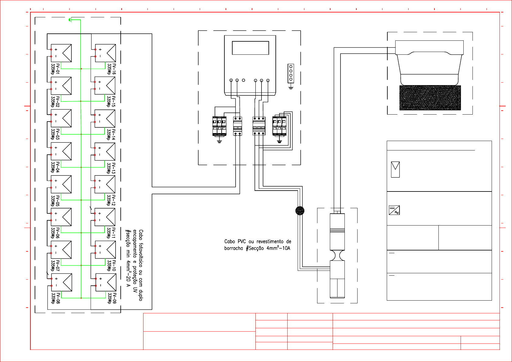 A B C 8 97654320 1 D F G H 13121110 E K 17161514 18 A B C D F G H DIAGRAMA FUNCIONAL CONTEÚDO Tatiane Costa TITULO: Projetista Data 3CVPotência bomba Inversor 3 HP 2,2kW Sistema solar de bombeamento de água - 3CV Centro de Estudos Avançados de Promoção Social e Ambiental Arquivo: Projeto Saúde e Alegria Projeto_Bombeamento_3CV_RV00 02 01 DE : FOLHA : Sistema de bombeamento de água solar - 3CV E I J K L I J L SIMBOLOGIA Vmpp: 37,3V Isc: 9,22A Impp: 8,89A Vm: 1000V DPS Classe II min=600V ou 1000V proteção UV (se possível) A extensão dos módulos até o conversor de Tolerância: 0% a +5% Voc: 47V Potência máxima (Pmax): 335Wp Tipo de célula: Silício Policristalino Dimensões painel: 1970 x 992 x 40mm Eficiência: 17,3% 220V 50/60Hz Alimentação 1 fase Corrente de saída nominal de 10A Inversor de frequência 3HP - 2,2kW Fotovoltaico ou com duplo encapamento, Cabo CC Conversor de frequência R S T U V W Armazenador de água + - + - + - Material do caderno de especificações técnicas de projetos off-grid Bomba de 3 CV - Trifásica/220V Chave de transferência opcional - Solar/Diesel Sistema de condicionamento de potência e proteção *Inserção de sensor de nível de água (bóia) com instalação de acordo com o manual do conversor de frequência 220V *verificar no manual do conversor de frequência o tipo de ligação (fase-fase) Sistema fotovoltaico 16 módulos de 335Wp Conexão mista (série/paralelo) Disjuntor 25 Ac.c. DPS 600 Vc.c. 40kA Disjuntor 15 Ac.a. DPS 275 Vc.a. 40kA/65kA Barra de aterramento Proteção CC Proteção CA min=40kA ou 65kA DPS Classe II 275V 40/65kA Disjuntor 15A frequência adotar cabo de secção min de 4mm² ou 6mm² Secção de 4mm² para distâncias acima de 50 até 160m Revestimento de PVC ou borracha (70°C) Cabo CA - Imax=12A 14/10/2019 Secção de 6mm² para distâncias acima de 160 até 250m Maiores distâncias ou correntes no circuito requer novo dimensionamento e projeto Tensão elétrica Trifásico/220V Disjuntor 25A