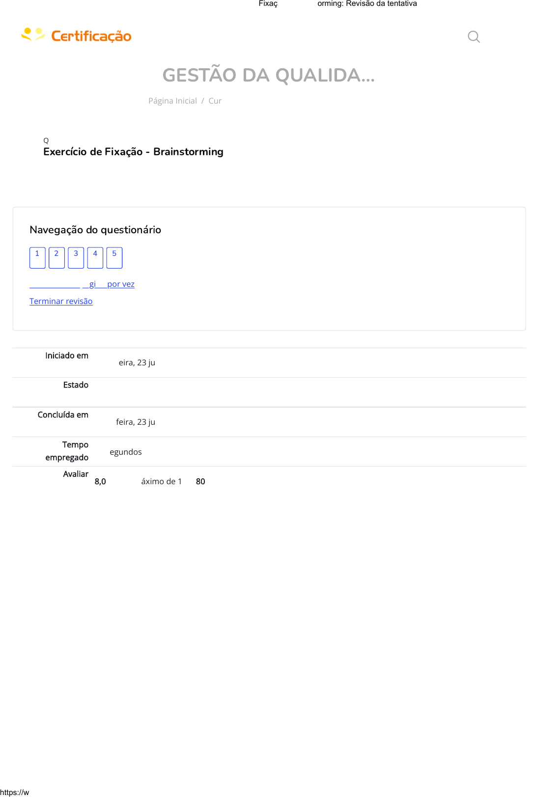 GESTÃO DA QUALIDA… Página Inicial / Cursos / Gestão D… / Brainstorm / Exercício … Iniciado em terça-feira, 23 jul. 2024, 17:32 Estado Finalizada Concluída em terça-feira, 23 jul. 2024, 17:33 Tempo empregado 53 segundos Avaliar 8,0 de um máximo de 10,0(80%) Navegação do questionário Mostrar uma página por vez Terminar revisão 1 2 3 4 5 QUESTIONÁRIO Exercício de Fixação - Brainstorming 23/07/2024, 17:34 Exercício de Fixação - Brainstorming: Revisão da tentativa https://www.certificacaotecnica.com.br/mod/quiz/review.php?attempt=7208681&cmid=106661#question-7215781-5 1/4 https://www.certificacaotecnica.com.br/ https://www.certificacaotecnica.com.br/course/index.php https://www.certificacaotecnica.com.br/course/view.php?id=3487 https://www.certificacaotecnica.com.br/mod/quiz/view.php?id=106661 https://www.certificacaotecnica.com.br/mod/quiz/review.php?attempt=7208681&cmid=106661&showall=0 https://www.certificacaotecnica.com.br/mod/quiz/view.php?id=106661 https://www.certificacaotecnica.com.br/ QUESTÃO Correto Atingiu 2,0 de 2,0 QUESTÃO Incorreto Atingiu 0,0 de 2,0 1 O brainstorming tem como objetivo gerar ideias e detalhá-las sem inibições, buscando a diversidade de opiniões e contribuindo para o desenvolvimento das equipes. Dentre as vantagens do processo, qual é aquela que diz respeito a ouvir o grupo e instituir as ideias apresentadas por ele? Escolha uma opção: a. Surgimento do sentimento de valorização. b. Superação de limites. c. Evolução da comunicação entre as pessoas. d. Estimulo à interação. e. Melhoria no desempenho dos pro�ssionais. Sua resposta está correta. A resposta correta é: Surgimento do sentimento de valorização. 2 O brainstorming tem por base o princípio "quanto mais ideias, melhor". Baxter (2008) a�rma que, por meio do brainstorming, é possível chegar a um patamar de 100 ideias em uma sessão com duração de uma ou duas horas. Nesse contexto, as ideias iniciais costumam ser evidentes e as melhores, normalmente, surgem na parte �nal da sessão. Dentre os métodos de brainstorming, qual é o tipo indicado quando pessoas não se conhecem? Escolha uma opção: a. Brainstorming combinado. b. Brainstorming livre c. Brainstorming estruturado. d. Brainstorming limitado. e. Post-it. Sua resposta está incorreta. A resposta correta é: Brainstorming estruturado. 23/07/2024, 17:34 Exercício de Fixação - Brainstorming: Revisão da tentativa https://www.certificacaotecnica.com.br/mod/quiz/review.php?attempt=7208681&cmid=106661#question-7215781-5 2/4 QUESTÃO Correto Atingiu 2,0 de 2,0 QUESTÃO Correto Atingiu 2,0 de 2,0 3 Carvalho (1999) a�rma que o conhecimento tem sido muito valorizado de uns anos para cá, sendo visto como matéria-prima essencial para organizações que querem se manter no mercado. Nesse contexto, o brainstorming assume importância estratégica cada vez maior. Para o autor, uma das vantagens na utilização do brainstorming é o(a) __________ dado(a) a todos os integrantes do grupo para que possam expressar ideias e opiniões. Assinale a alternativa que completa corretamente a frase: Escolha uma opção: a. longo tempo. b. crítica. c. individualidade. d. limitação. e. liberdade. Sua resposta está correta. A resposta correta é: liberdade. 4 A vantagem competitiva de uma empresa, em uma economia globalizada, está diretamente relacionada à capacidade dela de inovar não só em produtos e serviços, mas também em processos de trabalho, de modo a impedir que outras empresas abocanhem parte de seu mercado. Nesse sentido, a geração de ideias é o coração do processo de inovação. Para a geração de ideias, existem três categorias principais de técnicas. Como é chamada aquela que procura não se restringir ao problema existente? Escolha uma opção: a. Redução do problema. b. Expansão do problema. c. Período de preparação. d. Eliminação do problema. e. Digressão do problema. Sua resposta está correta. A resposta correta é: Expansão do problema. 23/07/2024, 17:34 Exercício de Fixação - Brainstorming: Revisão da tentativa https://www.certificacaotecnica.com.br/mod/quiz/review.php?attempt=7208681&cmid=106661#question-7215781-5 3/4 QUESTÃO Correto Atingiu 2,0 de 2,0 5 O brainstorming é uma técnica utilizada com a �nalidade de gerar um grande número de ideias, principalmente ideias inéditas, em um curto espaço de tempo, com foco na quantidade de ideias, na qual a qualidade delas não é prioridade. No entanto, algumas diretrizes devem ser seguidas para que o processo tenha sucesso. A diretriz em que não é recomendado qualquer comentário positivo ou negativo refere-se a: Escolha uma opção: a. evitar críticas, avaliações ou julgamentos . b. dispor de tempo su�ciente para listar todas as ideias. c. de�nir problema e objetivo. d. incumbir os membros do grupo que combinem ou modi�quem as ideias já apresentadas. e. encorajar cada membro do grupo a apresentar quaisquer ideias que surjam Sua resposta está correta. A resposta correta é: evitar críticas, avaliações ou julgamentos . ◄ Video Resumo Seguir para... Conteúdo de Estudo : Três Métodos Universais da GQ ► Quem somos Cursos Certi�cação Unidades Contato Copyright © 2023 CPET - Centro de Pro�ssionalização e Educação Técnica 23/07/2024, 17:34 Exercício de Fixação - Brainstorming: Revisão da tentativa https://www.certificacaotecnica.com.br/mod/quiz/review.php?attempt=7208681&cmid=106661#question-7215781-5 4/4 https://www.certificacaotecnica.com.br/mod/url/view.php?id=126959&forceview=1 https://www.certificacaotecnica.com.br/mod/lti/view.php?id=106662&forceview=1 https://www.cpet.com.br/quem-somos-cpet-cursos-tecnicos-a-distancia-ead/ https://www.cpet.com.br/course-cat/cursos/cursos-online/ https://www.cpet.com.br/certificacao-cpet/ https://www.cpet.com.br/unidades-cpet/ https://www.cpet.com.br/contato/ https://www.facebook.com/CPET-Centro-de-Profissionaliza%C3%A7%C3%A3o-e-Educa%C3%A7%