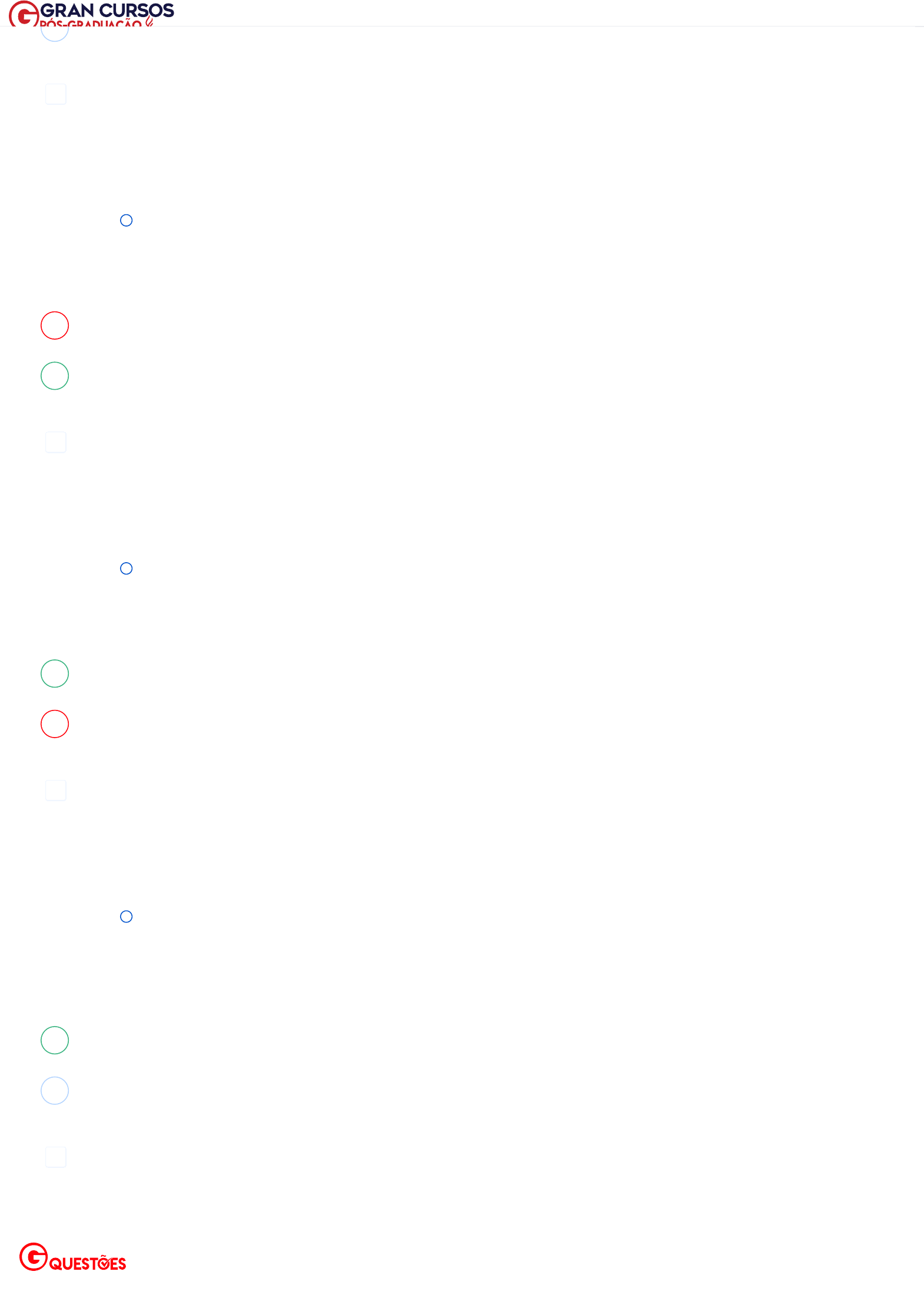 © 2023 - Um produto Gran Cursos Online. Professor 8 Q1828965 >> Administração Geral >> Gestão de Pessoas Errada Texto associado A gestão de equipes remotas é uma realidade não declinável do setor público, principalmente em razão das medidas de isolamento social decorrentes da pandemia da COVID-19, que contribui para firmar uma cultura de trabalho a distância embasada na confiança da administração e no seu compromisso com os servidores públicos. Professor 9 Q1828967 >> Administração Geral >> Gestão de Pessoas >> Trabalho em Equipe Errada Texto associado Os conflitos organizacionais de tarefa podem ser estimulados, desde que haja confiança e objetivos compartilhados entre os membros de uma equipe e que se refira a atividades criativas e inovadoras. Em todos os casos, os conflitos interpessoais não devem ser estimulados e sim evitados, pois se configuram como disfuncionais. Professor 10 Q1828968 >> Administração Geral >> Gestão de Pessoas Certa Texto associado A gestão da diversidade é uma questão importante quanto à gestão de pessoas no setor público, devendo considerar a inclusão de grupos vulnerabilizados, razão pela qual tem sido tendência a instituição de políticas de equidade que abarquem temas como gênero, raça, pessoas com deficiência, choque geracional e comunidade LGBTQIA+, entre outros. Professor E Errado C Certo SUA RESPOSTA E Errado RESPOSTA CORRETA C Certo RESPOSTA CORRETA E Errado SUA RESPOSTA C Certo SUA RESPOSTA E Errado