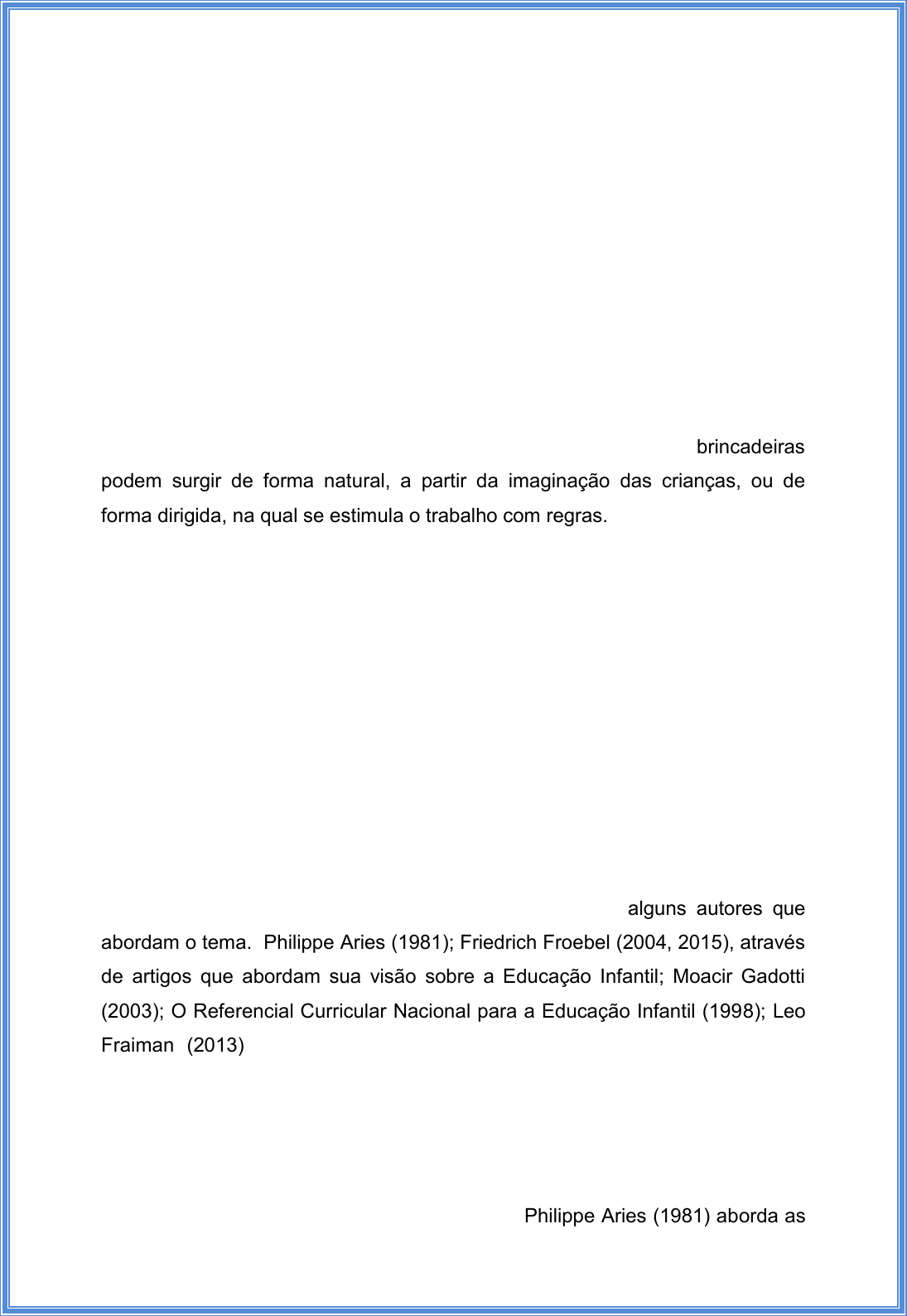 BRINCAR NA EDUCAÇÃO INFANTIL (Texto adaptado a partir de Trabalho de Conclusão do curso de Pedagogia) Jênifer Goularte Martins INTRODUÇÃO Sabe-se que a Educação Infantil deve aliar o cuidar e o brincar, porém, nesse trabalho, abordarei o brincar no desenvolvimento da criança. As brincadeiras na Educação Infantil devem estimular o autoconhecimento, formação de identidade, integração, cooperação, e outros sentidos necessários para a convivência em sociedade. Essas brincadeiras podem surgir de forma natural, a partir da imaginação das crianças, ou de forma dirigida, na qual se estimula o trabalho com regras. Este trabalho trata das questões que envolvem o ato de brincar e da importância dessa atividade para o desenvolvimento da criança na Educação Infantil. Ao escrever sobre “o papel do brincar na infância”, considero a importância das brincadeiras nessa etapa da vida das crianças. Esse tema foi escolhido por ter sido amplamente trabalhado durante meu período de estágio na Educação Infantil, experiência muito gratificante na trajetória do curso de Pedagogia. Também, corroborou para essa escolha, o fato de considerar o brincar uma ferramenta fundamental para o desenvolvimento da criança e do imaginário infantil. Para embasar teoricamente este ensaio, utilizarei alguns autores que abordam o tema. Philippe Aries (1981); Friedrich Froebel (2004, 2015), através de artigos que abordam sua visão sobre a Educação Infantil; Moacir Gadotti (2003); O Referencial Curricular Nacional para a Educação Infantil (1998); Leo Fraiman (2013) entre outras leituras de artigos pertinentes ao tema aqui trabalhado. O PAPEL DO BRINCAR NA INFÂNCIA Se percorrermos a história, poderemos perceber as diferentes representações sobre a criança e sua infância. Philippe Aries (1981) aborda as transformações no tempo a respeito do olhar sobre a criança. Na Idade Antiga a criança não era vista como indivíduo, sendo considerada incapaz, o que exigia cuidados. Na idade Média, segundo Aries (1981), a mortalidade infantil era bastante comum, o cuidado não era considerado importante. Ainda nessa época, faltava afeto e apego por parte dos adultos em relação às crianças. Na Idade Moderna a infância passa a ter mais atenção, voltada ao estudo, diferenciando crianças de adultos. Surgem leis para o trabalho infantil e políticas de direitos às crianças. Na contemporaneidade as políticas para o desenvolvimento das crianças se legitimam, e elas assumem seus próprios espaços na sociedade. Atualmente o acesso a educação para criança (0 a 6 anos) é oferecido pelo sistema público de educação, sendo parte integrante da Educação Básica no Brasil. Ao fazer parte da primeira etapa da educação básica, ela é concebida como questão de direito, de cidadania e de qualidade. As interações e a brincadeira são consideradas eixos fundamentais para se educar com qualidade. (BRASIL, 2012, p. 11). De acordo com o Referencial Curricular Nacional para Educação Infantil (vol. 1, 1998, p. 13), as práticas na Educação Infantil devem “promover e ampliar as condições necessárias para o exercício da cidadania das crianças brasileiras”. Acredito que o brincar seja a maneira mais apropriada para atingir esse objetivo, pois através das brincadeiras as crianças exercitam diversos valores, como cooperação, paciência, empatia, coragem, respeito, etc. Também, ao brincar, a criança desenvolve o poder de tomada de decisão e independência, escolhendo os brinquedos e brincadeiras, a forma de brincar, com quem vai interagir, se brincará sozinha, construindo sua identidade. Há diversas formas de brincar, mas sempre que a criança brinca está interagindo com alguém ou algo. A criança não brinca sozinha, ela tem um brinquedo, um ambiente, uma história, um colega, um professor que media essa relação e que faz do brincar algo criativo e estimulante, ou seja, a forma como o brincar é mediado pelo contexto da escola é importante para que seja de qualidade e realmente ofereça a oportunidade de diferentes aprendizagens para a criança.(NAVARRO, 2009, p. 2125). O ato de brincar deve ter a criança como protagonista, não o espaço ou o brinquedo. E, esse ambiente deve ser organizado e controlado pelo professor, de forma a proporcionar o brincar significativo, onde a criança possa desenvolver significativamente suas potencialidades. As brincadeiras propostas pelo professor, na Educação Infantil, devem ser de interesse das crianças, motivando-as e provocando seu interesse e curiosidade. Deve-se levar em consideração, sempre, o conhecimento prévio do aluno para então planejar uma atividade onde este possa fazer novas descobertas. Complementando o dito acima, o Referencial Curricular Nacional para a Educação Infantil esclarece que é preciso que o professor tenha consciência que na brincadeira as crianças recriam e estabilizam aquilo que sabem sobre as mais diversas esferas do conhecimento, em uma atividade espontânea e imaginativa”. (BRASIL, vol. 1, 1998, p. 29). Um grande estímulo ao desenvolvimento da criança, na Educação Infantil, através da brincadeira, de forma lúdica, é o jogo. Através do jogo, brinca-se com regras, proporcionando aprendizagem significativa. De acordo com Froebel (2004, p. 13), o pioneiro em considerar a importância do jogo na infância, o jogo seria também a principal fonte do desenvolvimento na primeira infância, que para ele é o período mais importante da vida humana, um período que constitui a fonte de tudo o que caracteriza o indivíduo, toda a sua personalidade. Por isso Froebel considera a brincadeira uma atividade séria e importante para quem deseja realmente conhecer a criança. O jogo é uma brincadeira capaz de estimular vários sentidos na criança, principalmente se jogado em grupo, no qual se tem regras a serem cumpridas. Ao mesmo tempo em que desafia a criança, também a diverte, fazendo-a lid