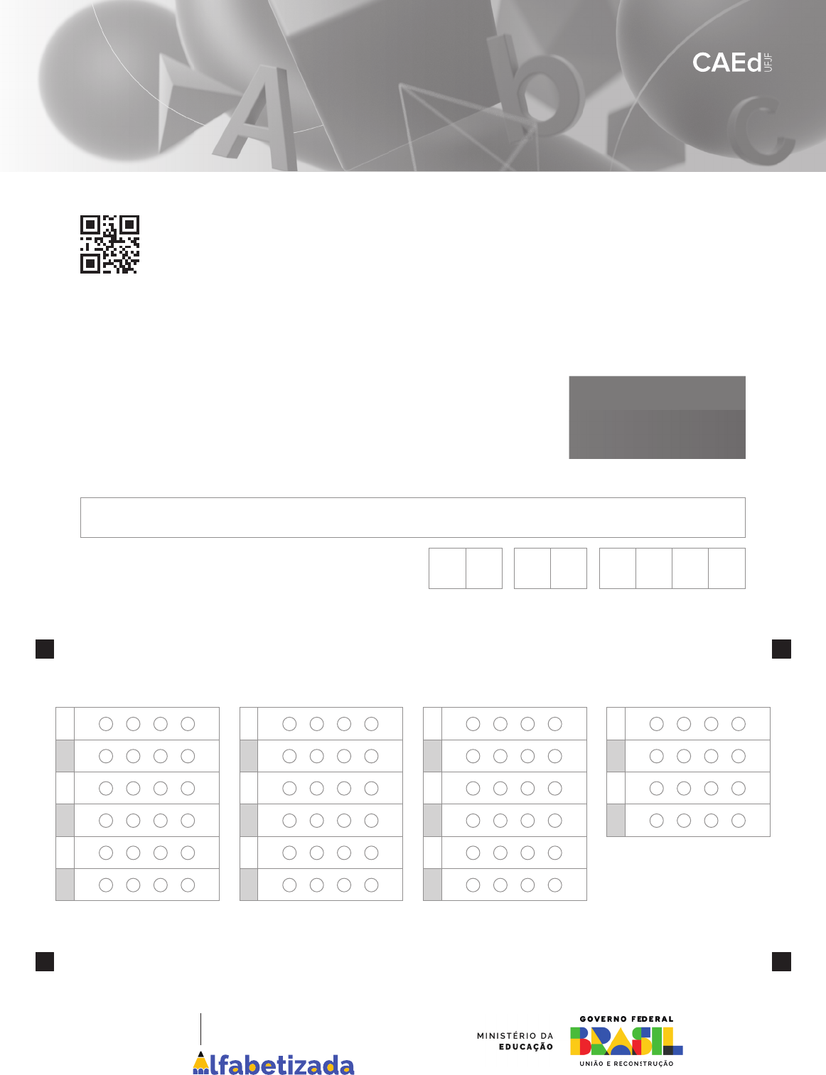 CADERNO Data de Nascimento do(a) estudante Nome do(a) estudante M 0 5 0 3 AVALIAÇÃO CONTÍNUA DA APRENDIZAGEM CICLO I 2024 1842M0503 5º ano do Ensino Fundamental MATEMÁTICA 44445544119977332299 01 DCBA 02 DCBA 03 DCBA 04 DCBA 05 DCBA 06 DCBA 07 DCBA 08 DCBA 09 DCBA 10 DCBA 11 DCBA 12 DCBA 13 DCBA 14 DCBA 15 DCBA 16 DCBA 17 DCBA 18 DCBA 19 DCBA 20 DCBA 21 DCBA 22 DCBA Criança Compromisso Nacional BL03M05 Leia e observe as informações do quadro abaixo para responder às quatro questões a seguir. A prefeitura de uma cidade fez um levantamento para conhecer a quantidade de moradores em cada uma de suas quatro regiões: oeste, leste, norte e sul. Os resultados desse levantamento estão apresentados nos cartões abaixo. Região oeste: 27 084 moradores Região leste: 8 506 moradores Região norte: 12 970 moradores Região sul: 10 239 moradores (M00044861_CEN) 01) (M00044863) Observe abaixo o cartão com a quantidade de moradores da região norte dessa cidade. Região norte: 12 970 moradores Qual é a ordem ocupada pelo algarismo 2 nesse número? A) Centena simples. B) Dezena de milhar. C) Unidade de milhar. D) Unidade simples. 02) (M00044862) Observe abaixo o cartão com a quantidade de moradores da região sul dessa cidade. Região sul: 10 239 moradores Esse número pode ser decomposto em A) dez dezenas, duzentas centenas, trinta dezenas e nove unidades. B) dez dezenas de milhar, duas centenas, três dezenas e nove unidades. C) nove dezenas de milhar, três unidades de milhar, duas centenas e uma unidade. D) uma dezena de milhar, duas centenas, três dezenas e nove unidades. M0503 1 BL03M05 M0503 2 03) (M00044861) Qual das quatro regiões dessa cidade possui a maior quantidade de moradores? A) Leste. B) Norte. C) Oeste. D) Sul. 04) (M00044864) Observe abaixo o cartão com a quantidade de moradores da região oeste dessa cidade. Região oeste: 27 084 moradores Qual é o valor posicional do algarismo 7 nesse número? A) 7 000. B) 700. C) 70. D) 7. BL04M05 Leia e observe as informações do quadro abaixo para responder às quatro questões a seguir. Os pais de Antônio e Frederico moram na cidade de Brasília. Já Antônio e Frederico moram em outras cidades. A distância de Brasília até a cidade onde Antônio mora é de 1 050 km, e a distância de Brasília até a cidade onde Frederico mora é de 890 km. (M00044866_CEN) 05) (M00044870) Antônio verificou que o preço das passagens aéreas de ida e volta entre sua cidade e Brasília é 1 030 reais por pessoa. Para calcular quanto gastaria com a compra dessas passagens para ele e sua família, efetuou a operação apresentada no quadro abaixo. 5 × 1 030 Quanto Antônio gastaria, em real, com a compra dessas passagens aéreas de ida e volta para ele e sua família? A) 5 015 reais. B) 5 050 reais. C) 5 150 reais. D) 5 550 reais. 06) (M00044868) Antônio fez uma viagem para Brasília para visitar seus pais e levou sua esposa e seus filhos. Por causa das crianças, ele realizou uma parada a cada 90 km que percorreu ao longo do trajeto de 1 050 km. Quantas paradas Antônio realizou nessa viagem antes de chegar ao seu destino? A) 102. B) 101. C) 12. D) 11. 07) (M00044869) No início do ano, Frederico visitou seus pais em Brasília de carro e levou dois amigos. No deslocamento de 890 km dessa viagem, a cada 90 km ocorreu um revezamento para dirigir o carro. Para determinar a quantidade de revezamentos, eles calcularam o resultado da operação apresentada no quadro abaixo. 890 ÷ 90 Quantos revezamentos ocorreram entre esses amigos para dirigir o carro nessa viagem? A) 9. B) 10. C) 90. D) 91. 08) (M00044867) Antônio viaja de sua cidade até Brasília quatro vezes ao ano para visitar seus pais. Com isso, ele realiza, por ano, 8 deslocamentos de 1 050 km, pois cada viagem envolve ida e volta. Qual o total de quilômetros que Antônio viaja por ano de sua cidade até Brasília para visitar seus pais? A) 1 058 km. B) 4 200 km. C) 8 040 km. D) 8 400 km. M0503 3 BL01M05 Leia e observe as informações do quadro abaixo para responder às quatro questões a seguir. A figura a seguir apresenta a vista parcial de uma sala de aula durante uma aula de Geometria. No quadro dessa sala, foi feito um desenho e, sobre a mesa da sala, foram colocados dois prismas. (M00044851_CEN) 09) (M00044852) Nessa aula, a professora levou dois prismas retos, feitos de papelão, e os deixou sobre a mesa. Inicialmente, ela apresentou o prisma de base triangular, representado pela figura abaixo, e informou que todas as suas arestas têm medidas iguais. Em seguida, a professora pediu a seus alunos que desenhassem uma planificação desse prisma. Um desenho que representa uma planificação desse prisma é A) B) C) D) M0503 4 BL01M05 M0503 5 10) (M00044853) Para o prisma em formato de bloco retangular, a professora propôs a tarefa de calcular a quantidade de papelão utilizado em sua montagem. Para isso, ela posicionou esse prisma sobre um plano com uma malha quadriculada, na qual cada quadradinho da malha mede 200 cm², conforme ilustrado na figura a seguir. 200 cm² Em seguida, ela desmontou o prisma de forma a obter uma de suas planificações, conforme indicado nas figuras abaixo. 2 0 0 c m ² 200 cm² Ao final, calculou‑se a área da planificação obtida. No mínimo, quantos centímetros quadrados de papelão foram utilizados para montar esse prisma? A) 1 200 cm2. B) 2 000 cm2. C) 2 200 cm2. D) 4 400 cm2. BL01M05 M0503 6 11) (M00044855) A última atividade proposta pela professora foi a fabricação de um novo prisma de acrílico. Para realizar essa fabricação, ela foi a uma loja comprar os materiais necessários. O preço total da compra desse material foi de 96 reais, e ela entregou ao caixa da loja a cédula e a moeda que estão representadas na figura abaixo. A quantia que a professora deve receber de troco está representada em A) B) C) D) BL01M05 M0503 7 12) (M00044854) Ainda nessa aula, a professora propôs aos estudantes que descobrissem de qual figura geomé