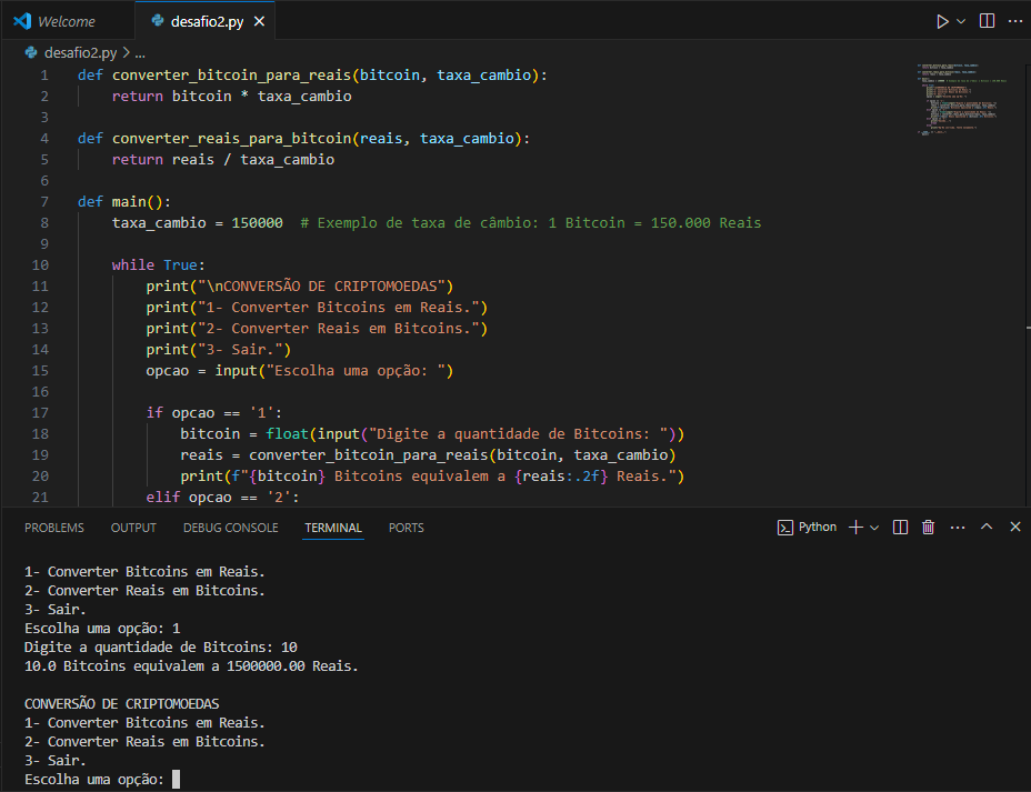 Welcome desafio2.py II desafio2.py 1 def 2 return bitcoin * taxa_cambio 3 4 def 5 return reais / taxa_cambio 6 7 def main() : 8 taxa_cambio = 150000 # Exemplo de taxa de câmbio: 1 Bitcoin = 150.000 Reais 9 10 while True: 11 print ("\nCONVERSÃO DE CRIPTOMOEDAS") 12 print ("1- Converter Bitcoins em Reais.") 13 print("2- Converter Reais em Bitcoins.") 14 print("3- Sair.") 15 opcao = input("Escolha uma opção: ") 16 17 if opcao == 18 bitcoin = float (input ("Digite a quantidade de Bitcoins: ")) 19 reais = taxa_cambio) 20 Bitcoins equivalem a {reais: Reais.") 21 elif opcao == PROBLEMS OUTPUT DEBUG CONSOLE TERMINAL PORTS Python + 1- Converter Bitcoins em Reais. 2- Converter Reais em 3- Sair. Escolha uma opção: 1 Digite a quantidade de Bitcoins: 10 10.0 Bitcoins equivalem a 1500000.00 Reais. CONVERSÃO DE CRIPTOMOEDAS 1- Converter Bitcoins em Reais. 2- Converter Reais em Bitcoins. 3- Sair. Escolha uma opção: