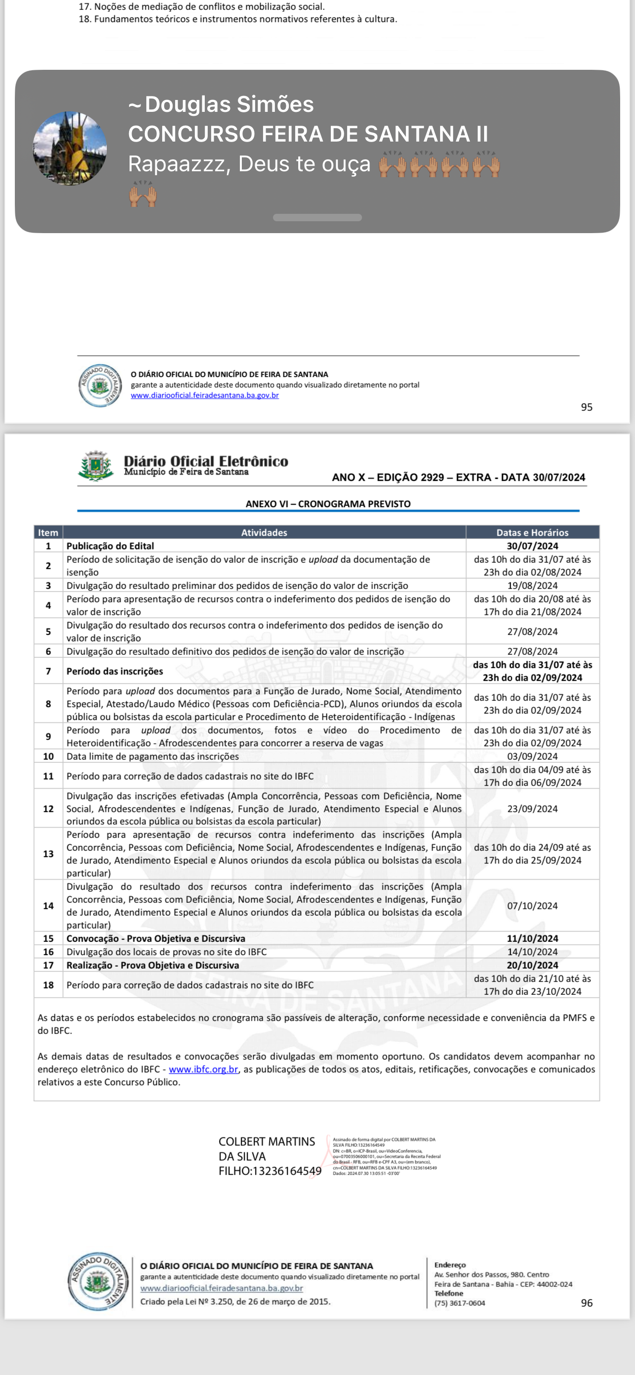 17. Noções de mediação de conflitos e mobilização social. 18. Fundamentos teóricos e instrumentos normativos referentes à cultura. Douglas Simões CONCURSO FEIRA DE SANTANA II Rapaazzz, Deus te ouça o DIÁRIO OFICIAL DO MUNICÍPIO DE FEIRA DE SANTANA garante autenticidade deste documento quando visualizado diretamente no portal 95 Diário Oficial Eletrônico Município de Feira de Santana ANO X EDIÇÃO 2929 EXTRA DATA 30/07/2024 ANEXO VI CRONOGRAMA PREVISTO Item Atividades Datas e Horários 1 Publicação do Edital 30/07/2024 Período de solicitação de isenção do valor de inscrição e upload da documentação de das 10h do dia 31/07 até às 2 isenção 23h do dia 02/08/2024 3 Divulgação do resultado preliminar dos pedidos de isenção do valor de inscrição 19/08/2024 Período para apresentação de recursos contra o indeferimento dos pedidos de isenção do das 10h do dia 20/08 até às 4 valor de inscrição 17h do dia 21/08/2024 Divulgação do resultado dos recursos contra o indeferimento dos pedidos de isenção do 5 27/08/2024 valor de inscrição 6 Divulgação do resultado definitivo dos pedidos de isenção do valor de inscrição 27/08/2024 das 10h do dia 31/07 até às 7 Período das inscrições 23h do dia 02/09/2024 Período para upload dos documentos para a Função de Jurado, Nome Social, Atendimento das 10h do dia 31/07 até às 8 Especial, Atestado/Laudo Médico (Pessoas com Deficiência-PCD), Alunos oriundos da escola 23h do dia 02/09/2024 pública ou bolsistas da escola particular e Procedimento de Heteroidentificação Indígenas Período para upload dos documentos, fotos e vídeo do Procedimento de das 10h do dia 31/07 até às 9 Heteroidentificação Afrodescendentes para concorrer a reserva de vagas 23h do dia 02/09/2024 10 Data limite de pagamento das inscrições 03/09/2024 das 10h do dia 04/09 até às 11 Período para correção de dados cadastrais no site do IBFC 17h do dia 06/09/2024 Divulgação das inscrições efetivadas (Ampla Concorrência, Pessoas com Deficiência, Nome 12 Social, Afrodescendentes e Indígenas, Função de Jurado, Atendimento Especial e Alunos 23/09/2024 oriundos da escola pública ou bolsistas da escola particular) Período para apresentação de recursos contra indeferimento das inscrições (Ampla Concorrência, Pessoas com Deficiência, Nome Social, Afrodescendentes e Indígenas, Função das 10h do dia 24/09 até as 13 de Jurado, Atendimento Especial e Alunos oriundos da escola pública ou bolsistas da escola 17h do dia 25/09/2024 particular) Divulgação do resultado dos recursos contra indeferimento das inscrições (Ampla Concorrência, Pessoas com Deficiência, Nome Social, Afrodescendentes e Indígenas, Função 14 07/10/2024 de Jurado, Atendimento Especial e Alunos oriundos da escola pública ou bolsistas da escola particular) 15 Convocação Prova Objetiva e Discursiva 11/10/2024 16 Divulgação dos locais de provas no site do IBFC 14/10/2024 17 Realização Prova Objetiva e Discursiva 20/10/2024 das 10h do dia 21/10 até às 18 Período para correção de dados cadastrais no site do IBFC 17h do dia 23/10/2024 As datas e os períodos estabelecidos no cronograma são passíveis de alteração, conforme necessidade e conveniência da PMFS e do As demais datas de resultados e convocações serão divulgadas em momento oportuno. Os candidatos devem acompanhar no endereço eletrônico do IBFC - as publicações de todos os atos, editais, retificações, convocações e comunicados relativos a este Concurso Público. COLBERT MARTINS forma digital MARTINS DA SILVA 13236164549 DA SILVA Receita Federal LHO:13236164549 OLBERT MARTINS 3236164549 Dados 2024.0 13:05:51 o DIÁRIO OFICIAL DO MUNICÍPIO DE FEIRA DE SANTANA Endereço garante autenticidade deste documento quando visualizado diretamente no portal Av. Senhor dos Passos, 980. Centro Feira de Santana Bahia CEP: 44002-024 Telefone Criado pela Lei 3.250, de 26 de março de 2015. (75) 3617-0604 96