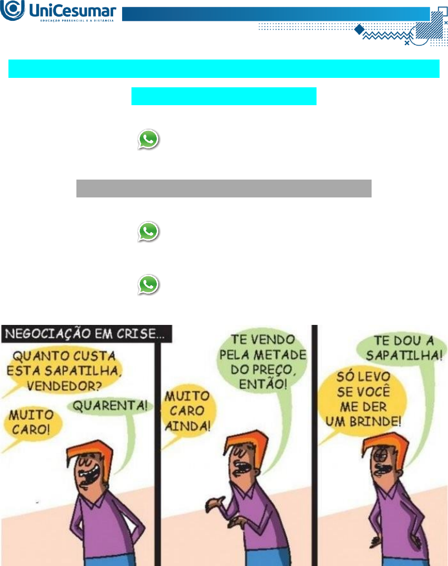 ATIVIDADE 1 – IMERSÃO PROFISSIONAL: TÉCNICAS DE NEGOCIAÇÃO - 53_2024 (21) 99887-9815 ASSESSORIA NOS SEUS TRABALHOS (21) 99887-9815 (21) 99887-9815 Observe a charge abaixo SEHN, Marcos Leandro. Negociação em crise. Disponível em: https://www.linke- din.com/pulse/negocia%C3%A7%C3%A3o-em-crise-5-dicas-para-negociar-bem-marcos- leandro-sehn?trk=portfolio_article-card_title. Acesso em: 01 jun. 2024. Ter habilidades de negociação é essencial em nossa rotina diária, pois seu uso vai muito além do mundo comercial e empresarial. Existem inúmeras outras áreas e situações pesso- ais onde essa competência se torna crucial. Além disso, algumas das abordagens tradicio- nalmente consideradas fundamentais em um processo de negociação estão sendo questionadas atualmente, com novas perspectivas ganhando mais importância Neste sentido, o comerciante da charge é um bom negociador? Quais dicas você apontaria para ser realizado um bom acordo? Orientações! Assista ao vídeo explicativo gravado pela professora, disponível no fórum; Leia novamente o que escreveu, amplie as ideias e conclua sua atividade; Realize uma cuidadosa correção ortográfica em seu texto antes de enviá-lo Bons Estudos!! OLÁ! SOMOS A HELP EDUCACIONAL! ELABORAMOS ESSE TRABALHO POR UM PREÇO ACESSÍVEL. ENTRE EM CONTATO CONOSCO (21) 99887-9815