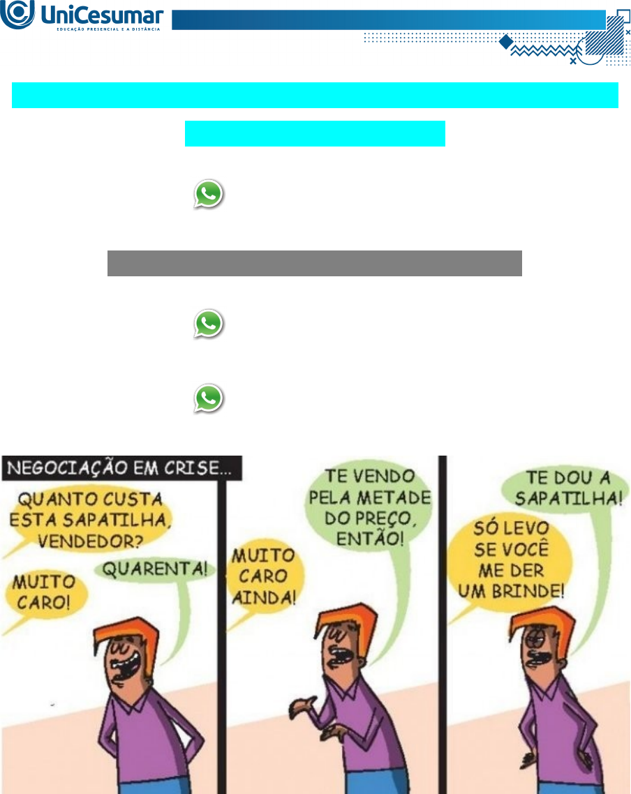 ATIVIDADE 1 – IMERSÃO PROFISSIONAL: TÉCNICAS DE NEGOCIAÇÃO - 53_2024 (21) 99887-9815 ASSESSORIA NOS SEUS TRABALHOS (21) 99887-9815 (21) 99887-9815 Observe a charge abaixo SEHN, Marcos Leandro. Negociação em crise. Disponível em: https://www.linkedin.com/pulse/negocia%C3%A7%C3%A3o-em-crise-5-dicas-para-negociar-bem-marcos-leandro-sehn?trk=portfolio_article-card_title. Acesso em: 01 jun. 2024 Ter habilidades de negociação é essencial em nossa rotina diária, pois seu uso vai muito além do mundo comercial e empresarial. Existem inúmeras outras áreas e situações pessoais onde essa competência se torna crucial. Além disso, algumas das abordagens tradicionalmente consideradas fundamentais em um processo de negociação estão sendo questionadas atualmente, com novas perspectivas ganhando mais importância. Neste sentido, o comerciante da charge é um bom negociador? Quais dicas você apontaria para ser realizado um bom acordo? Orientações! Assista ao vídeo explicativo gravado pela professora, disponível no fórum; Leia novamente o que escreveu, amplie as ideias e conclua sua atividade; Realize uma cuidadosa correção ortográfica em seu texto antes de enviá-lo. Bons Estudos!! OLÁ! SOMOS A HELP EDUCACIONAL! ELABORAMOS ESSE TRABALHO POR UM PREÇO ACESSÍVEL. ENTRE EM CONTATO CONOSCO (21) 99887-9815 image1.png image2.jpeg image3.png image4.png