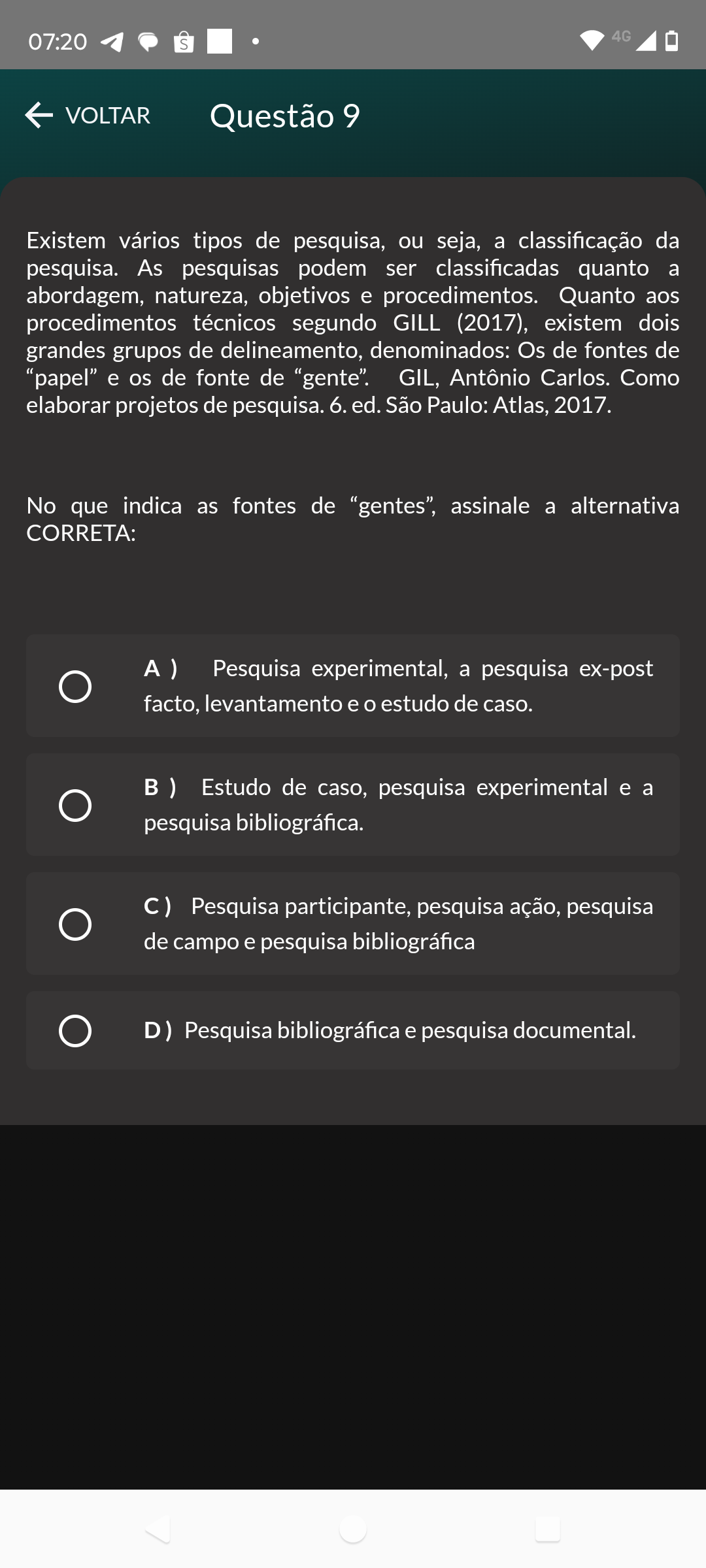 07:20 4G S VOLTAR Questão 9 Existem vários tipos de pesquisa, ou seja, a classificação da pesquisa. As pesquisas podem ser classificadas quanto a abordagem, natureza, objetivos e procedimentos. Quanto aos procedimentos técnicos segundo GILL (2017), existem dois grandes grupos de delineamento, denominados: Os de fontes de "papel" e os de fonte de "gente". GIL, Antônio Carlos. Como elaborar projetos de pesquisa. 6. ed. São Paulo: Atlas, 2017. No que indica as fontes de "gentes", assinale a alternativa CORRETA: A ) Pesquisa experimental, a pesquisa ex-post facto, levantamento e estudo de caso. B) Estudo de caso, pesquisa experimental e a pesquisa bibliográfica. C) Pesquisa participante, pesquisa ação, pesquisa de campo e pesquisa bibliográfica D) Pesquisa bibliográfica e pesquisa documental.