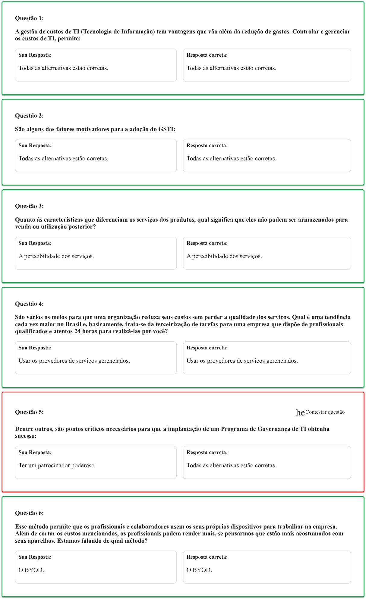Questão 1: A gestão de custos de TI (Tecnologia de Informação) tem vantagens que vão além da redução de gastos. Controlar e gerenciar os custos de TI, permite: Sua Resposta: Todas as alternativas estão corretas. Resposta correta: Todas as alternativas estão corretas. Questão 2: São alguns dos fatores motivadores para a adoção do GSTI: Sua Resposta: Todas as alternativas estão corretas. Resposta correta: Todas as alternativas estão corretas. Questão 3: Quanto às características que diferenciam os serviços dos produtos, qual significa que eles não podem ser armazenados para venda ou utilização posterior? Sua Resposta: A perecibilidade dos serviços. Resposta correta: A perecibilidade dos serviços. Questão 4: São vários os meios para que uma organização reduza seus custos sem perder a qualidade dos serviços. Qual é uma tendência cada vez maior no Brasil e, basicamente, trata-se da terceirização de tarefas para uma empresa que dispõe de profissionais qualificados e atentos 24 horas para realizá-las por você? Sua Resposta: Usar os provedores de serviços gerenciados. Resposta correta: Usar os provedores de serviços gerenciados. Questão 5: Dentre outros, são pontos críticos necessários para que a implantação de um Programa de Governança de TI obtenha sucesso: Sua Resposta: Ter um patrocinador poderoso. Resposta correta: Todas as alternativas estão corretas. helContestar questão Questão 6: Esse método permite que os profissionais e colaboradores usem os seus próprios dispositivos para trabalhar na empresa. Além de cortar os custos mencionados, os profissionais podem render mais, se pensarmos que estão mais acostumados com seus aparelhos. Estamos falando de qual método? Sua Resposta: O BYOD. Resposta correta: O BYOD. Questão 7: É uma técnica que especifica, com detalhes, as regras de como o serviço deverá ser prestado, e as possíveis multas, caso o nível de serviço acordado não seja cumprido pelo fornecedor do serviço. A afirmação corresponde ao: Sua Resposta: Service Level Agreement (SLA) ou Acordo de Nível de Serviço. Resposta correta: Service Level Agreement (SLA) ou Acordo de Nível de Serviço. Questão 8: Qual princípio decorre da função social do contrato e da própria manifestação livre da vontade das partes? Fixa tal princípio que não é lícito, o arrependimento após a formação do contrato. Sua Resposta: Princípio da Obrigatoriedade ou Irretratabilidade (pacta sunt servanda). Resposta correta: Princípio da Obrigatoriedade ou Irretratabilidade (pacta sunt servanda). Questão 9: É um modelo para permitir o acesso conveniente, sob demanda, a uma rede com um conjunto compartilhado de recursos de computação configuráveis (exemplos: redes, servidores, armazenamento, aplicações e serviços), que podem ser rapidamente provisionados e liberados com o mínimo de esforço gerencial e interação com o provedor de serviço. Essa afirmativa é referente ao: Sua Resposta: Cloud computing. Resposta correta: Cloud computing. Questão 10: Quando a infraestrutura de nuvem pode ser disponibilizada em uma nuvem comunitária, significa que Sua Resposta: A infraestrutura de nuvem é provisionada para uso exclusivo de uma comunidade de clientes de organizações que compartilham preocupações comuns em termos de missão, requisitos de segurança, política e considerações de conformidade. Resposta correta: A infraestrutura de nuvem é provisionada para uso exclusivo de uma comunidade de clientes de organizações que compartilham preocupações comuns em termos de missão, requisitos de segurança, política e considerações de conformidade.