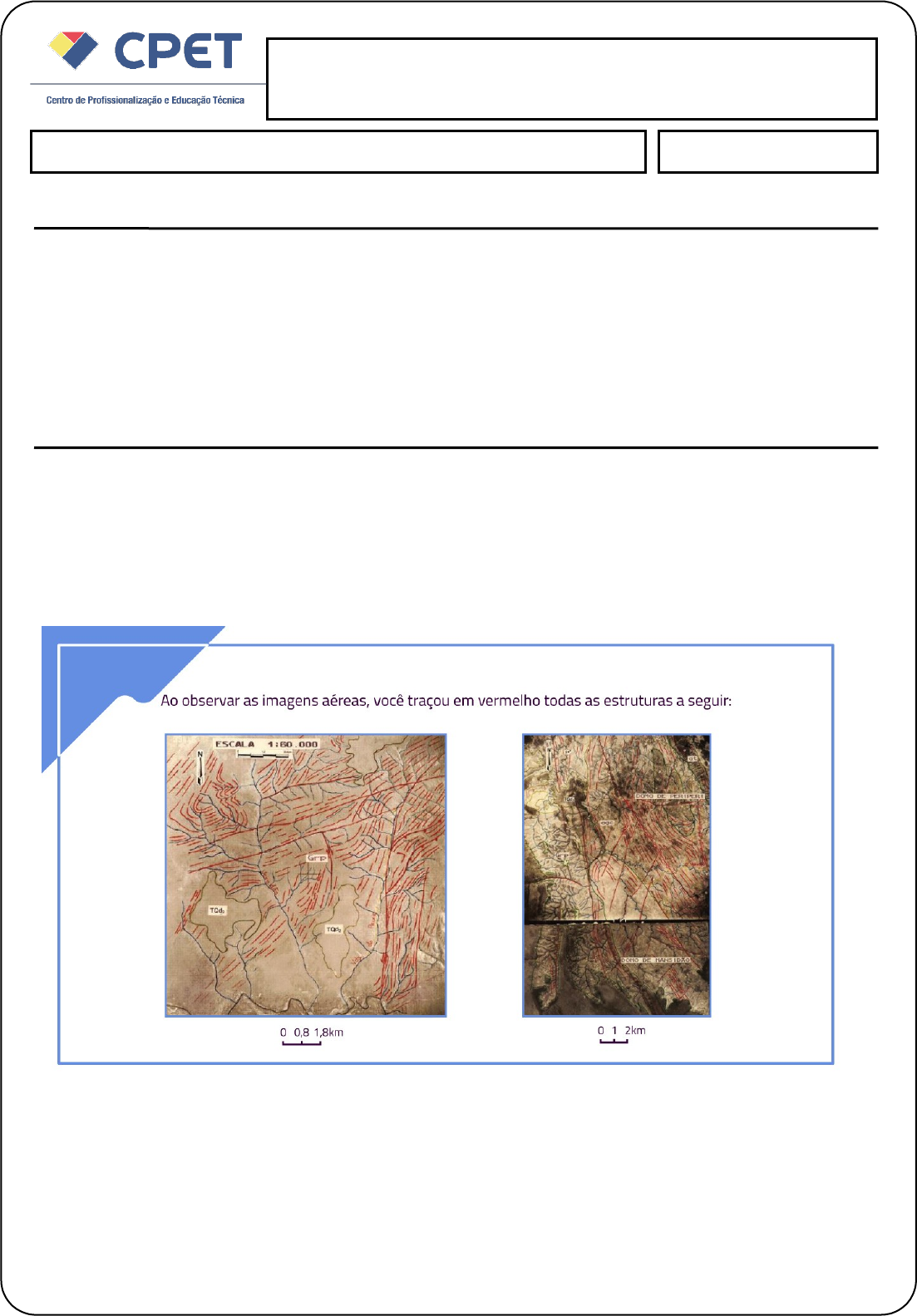 Prospecção geofísica e geoquímica- sg Aluno (a): Data: INSTRUÇÕES: · Este Laboratório contém questões, totalizando 10 (dez) pontos. · Você deve preencher dos dados no Cabeçalho para sua identificação · Nome / Data de entrega · As perguntas e respostas devem ser retiradas do Roteiro e digitadas logo abaixo. · Ao terminar, grave o arquivo em PDF com o nome do Laboratório Escolhido. · Envio o arquivo pelo sistema. A prospecção mineral tem na análise da fotogeologia uma de suas técnicas mais utilizadas, permitindo analisar o terreno com larga visão e observar estruturas cuja percepção, em campo, seria muito complicada. Ao observar as imagens aéreas, você traçou, em vermelho, todas essas estruturas, conforme as imagens a seguir: Que estruturas podem ser observadas na imagem de forma a guiar a prospecção? Como elas se relacionam? A drenagem apresenta relação com o controle estrutural do local? O que isso tem a ver com a prospecção mineral?