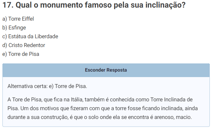 17. Qual monumento famoso pela sua inclinação? a) Torre Eiffel b) Esfinge c) Estátua da Liberdade d) Cristo Redentor e) Torre de Pisa Esconder Resposta Alternativa certa: e) Torre de Pisa. A Tore de Pisa, que fica na Itália, também é conhecida como Torre Inclinada de Pisa. Um dos motivos que fizeram com que a torre fosse ficando inclinada, ainda durante a sua construção, é que o solo onde ela se encontra é arenoso, macio.