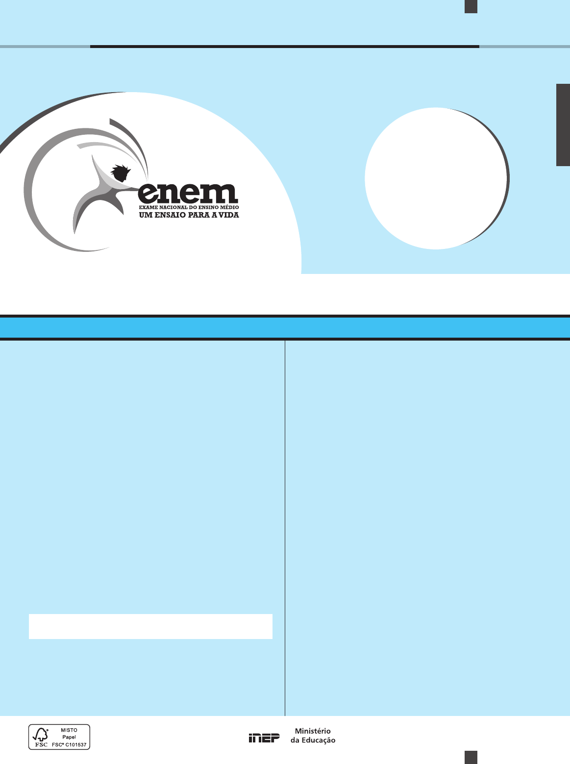 2013 *AZUL25DOM1* LEIA ATENTAMENTE AS INSTRUÇÕES SEGUINTES PROVA DE REDAÇÃO E DE LINGUAGENS, CÓDIGOS E SUAS TECNOLOGIAS PROVA DE MATEMÁTICA E SUAS TECNOLOGIAS EXAME NACIONAL DO ENSINO MÉDIO A COR DA CAPA DO SEU CADERNO DE QUESTÕES É AZUL. MARQUE-A EM SEU CARTÃO-RESPOSTA Eu sou do tamanho daquilo que sinto. 2º DIA CADERNO 7 AZUL 1 Este CADERNO DE QUESTÕES contém a Proposta de Redação e 90 questões numeradas de 91 a 180, dispostas da seguinte maneira: a. as questões de número 91 a 135 são relativas à área de Linguagens, Códigos e suas Tecnologias; b. as questões de número 136 a 180 são relativas à área de Matemática e suas Tecnologias. ATENÇÃO: as questões de 91 a 95 são relativas à língua estrangeira. Você deverá responder apenas às questões relativas à língua estrangeira (inglês ou espanhol) escolhida no ato de sua inscrição. 2 Confi ra se o seu CADERNO DE QUESTÕES contém a quantidade de questões e se essas questões estão na ordem mencionada na instrução anterior. Caso o caderno esteja incompleto, tenha qualquer defeito ou apresente divergência, comunique ao aplicador da sala para que ele tome as providências cabíveis. 3 Verifi que, no CARTÃO-RESPOSTA e na FOLHA DE REDAÇÃO, que se encontra no verso do CARTÃO-RESPOSTA, se os seus dados estão registrados corretamente. Caso haja alguma divergência, comunique-a imediatamente ao aplicador da sala. 4 ATENÇÃO: após a conferência, escreva e assine seu nome nos espaços próprios do CARTÃO-RESPOSTA e da FOLHA DE REDAÇÃO com caneta esferográfi ca de tinta preta. 5 ATENÇÃO: transcreva no espaço apropriado do seu CARTÃO-RESPOSTA, com sua caligrafi a usual, considerando as letras maiúsculas e minúsculas, a seguinte frase: 6 Marque no CARTÃO-RESPOSTA, no espaço apropriado, a opção correspondente à cor desta capa. 7 Não dobre, não amasse nem rasure o CARTÃO-RESPOSTA, pois ele não poderá ser substituído. 8 Para cada uma das questões objetivas, são apresentadas 5 opções identificadas com as letras A, B, C, D e E. Apenas uma responde corretamente à questão. 9 No CARTÃO-RESPOSTA, preencha todo o espaço compreendido no círculo correspondente à opção escolhida para a resposta. A marcação em mais de uma opção anula a questão, mesmo que uma das respostas esteja correta. 10 O tempo disponível para estas provas é de cinco horas e trinta minutos. 11 Reserve os 30 minutos fi nais para marcar seu CARTÃO- RESPOSTA. Os rascunhos e as marcações assinaladas no CADERNO DE QUESTÕES não serão considerados na avaliação. 12 Somente serão corrigidas as redações transcritas na FOLHA DE REDAÇÃO. 13 Quando terminar as provas, acene para chamar o aplicador e entregue este CADERNO DE QUESTÕES e o CARTÃO-RESPOSTA/FOLHA DE REDAÇÃO. 14 Você poderá deixar o local de prova somente após decorridas duas horas do início da aplicação e poderá levar seu CADERNO DE QUESTÕES ao deixar em defi nitivo a sala de prova nos 30 minutos que antecedem o término das provas. 15 Você será eliminado do Exame, a qualquer tempo, no caso de: a. prestar, em qualquer documento, declaração falsa ou inexata; b. perturbar, de qualquer modo, a ordem no local de aplicação das provas, incorrendo em comportamento indevido durante a realização do Exame; c. se comunicar, durante as provas, com outro participante verbalmente, por escrito ou por qualquer outra forma; d. portar qualquer tipo de equipamento eletrônico e de comunicação após ingressar na sala de provas; e. utilizar ou tentar utilizar meio fraudulento, em benefício próprio ou de terceiros, em qualquer etapa do Exame; f. utilizar livros, notas ou impressos durante a realização do Exame; g. se ausentar da sala de provas levando consigo o CADERNO DE QUESTÕES antes do prazo estabelecido e/ou o CARTÃO-RESPOSTA/FOLHA DE REDAÇÃO a qualquer tempo; h. não cumprir com o disposto no edital do Exame. 2013 LC - 2º dia | Caderno 7 - AZUL - Página 2 2013 PROPOSTA DE REDAÇÃO A partir da leitura dos textos motivadores seguintes e com base nos conhecimentos construídos ao longo de sua formação, redija texto dissertativo-argumentativo na modalidade escrita formal da língua portuguesa sobre o tema “Efeitos da implantação da Lei Seca no Brasil”, apresentando proposta de intervenção, que respeite os direitos humanos. Selecione, organize e relacione, de forma coerente e coesa, argumentos e fatos para defesa de seu ponto de vista. Qual o objetivo da “Lei Seca ao volante”? De acordo com a Associação Brasileira de Medicina de Tráfego (Abramet), a utilização de bebidas alcoólicas é responsável por 30% dos acidentes de trânsito. E metade das mortes, segundo o Ministério da Saúde, está relacionada ao uso do álcool por motoristas. Diante deste cenário preocupante, a Lei 11.705/2008 surgiu com uma enorme missão: alertar a sociedade para os perigos do álcool associado à direção. Para estancar a tendência de crescimento de mortes no trânsito, era necessária uma ação enérgica. E coube ao Governo Federal o primeiro passo, desde a proposta da nova legislação à aquisição de milhares de etilômetros. Mas para que todos ganhem, é indispensável a participação de estados, municípios e sociedade em geral. Porque para atingir o bem comum, o desafio deve ser de todos. Disponível em: www.dprf.gov.br. Acesso em: 20 jun. 2013. Disponível em: www.brasil.gov.br. Acesso em: 20 jun. 2013. LEI SECA EM NÚMEROS Vítimas de acidente no Grande Rio Fonte: ISP - RJ -27% -6,2% Média Nac. de redução vítimas fatais Fonte: DataSUS Atendimento Hospitalar - 13% Fonte: Secretaria Municipal de Saúde (RJ) Aprovaram o uso dos bafômetros 97% Fonte: IBPS Disponível em: www.operacaoleisecarj.rj.gov.br. Acesso em: 20 jun. 2013 (adaptado). Repulsão magnética a beber e dirigir A lei da física que comprova que dois polos opostos se atraem em um campo magnético é um dos conceitos mais populares desse ramo do conheci