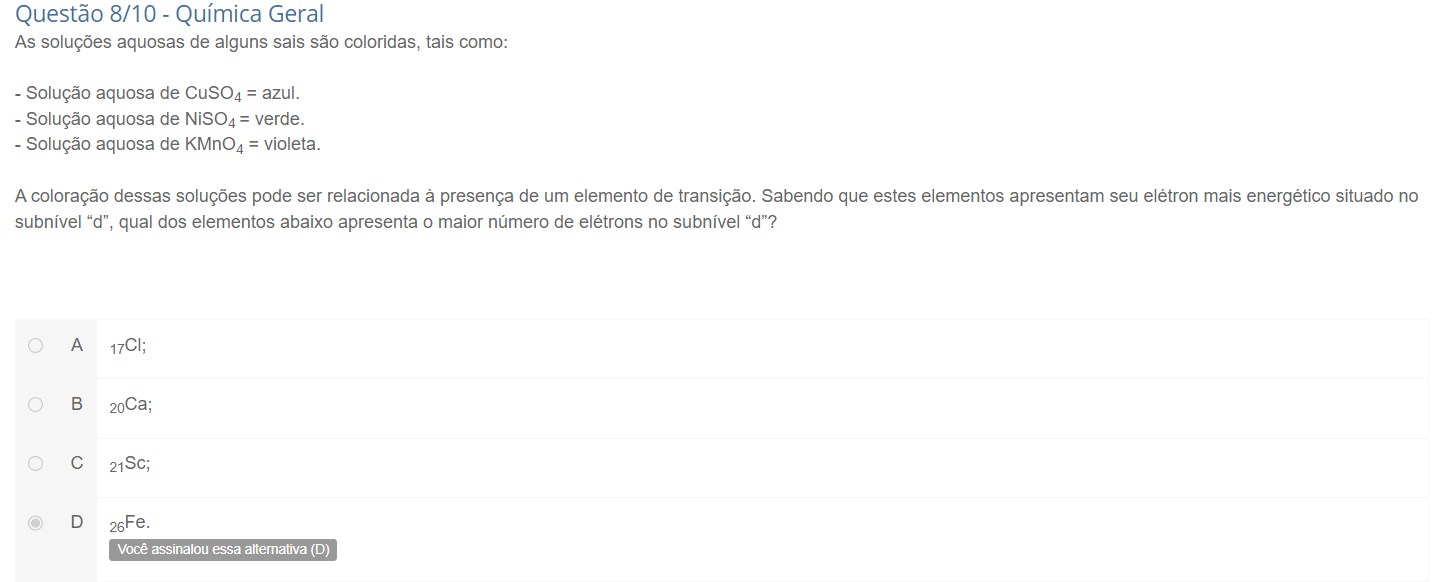 Questão 8/10 - Química Geral As soluções aquosas de alguns sais são coloridas, tais como: - Solução aquosa de CuSO4 = azul. - Solução aquosa de NiSO4 = verde. - Solução aquosa de KMnO4 = violeta. A coloração dessas soluções pode ser relacionada à presença de um elemento de transição. Sabendo que estes elementos apresentam seu elétron mais energético situado no subnível "d", qual dos elementos abaixo apresenta maior número de elétrons no subnível "d"? A 17CI; B 20Ca; C 21Sc; D 26Fe. Você assinalou essa alternativa (D)