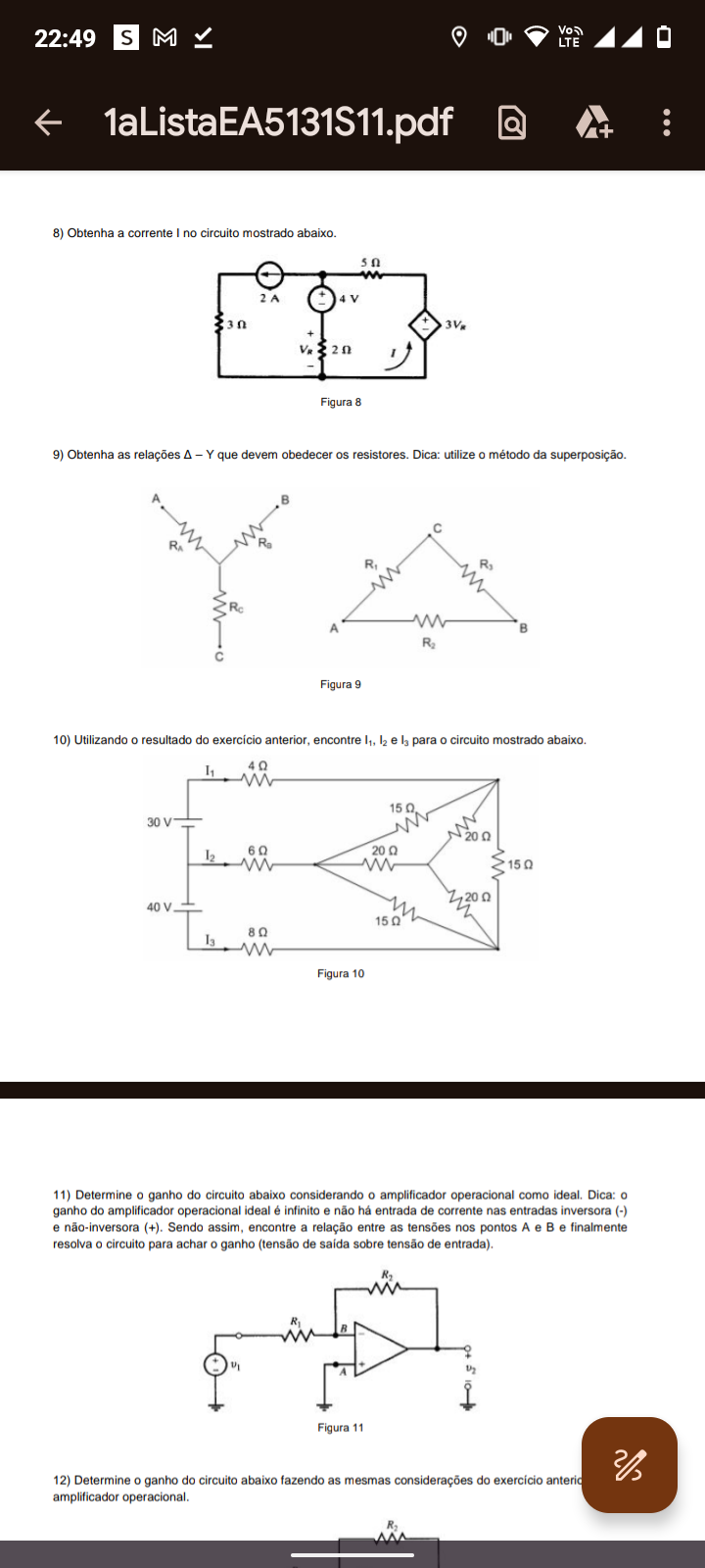 22:49 S M Vo LTE 1aListaEA5131S11.pdf 8) Obtenha a corrente I no circuito mostrado abaixo. 5 2 A + 4 + 20 - Figura 8 9) Obtenha as relações A Y que devem obedecer os resistores. Dica: utilize método da superposição. A B C R3 Rc A B R2 C Figura 9 10) Utilizando o resultado do exercício encontre l2 e l3 para circuito mostrado abaixo. I 40 30 V 20 o 60 20 15 40 V 15 80 Figura 10 11) Determine ganho do circuito abaixo considerando amplificador operacional como ideal. Dica: o ganho do amplificador operacional ideal é infinito e não há entrada de corrente nas entradas inversora (-) e não-inversora (+). Sendo assim, encontre a relação entre as tensões nos pontos A e B e finalmente resolva o circuito para achar ganho (tensão de saída sobre tensão de entrada). R. + A Figura 11 12) Determine o ganho do circuito abaixo fazendo as mesmas considerações do exercício anterio amplificador