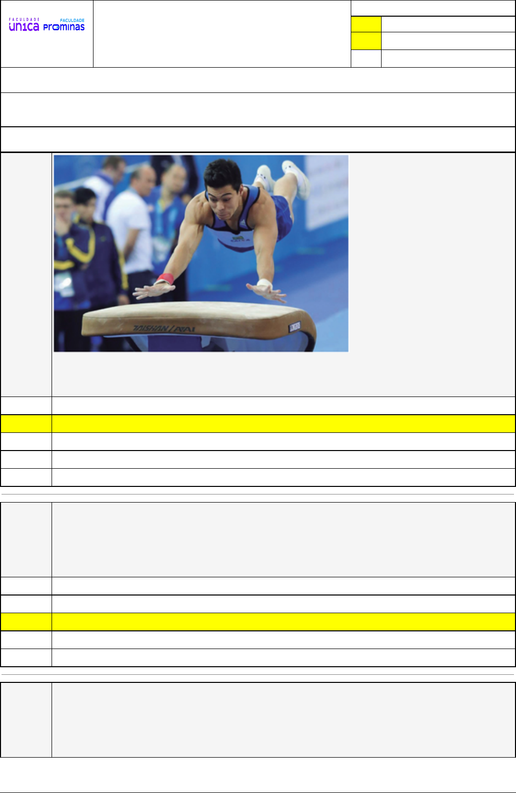 Pincel Atômico - 31/07/2024 11:13:45 1/4 JOSÉ FERNANDES DE OLIVEIRA NETO Avaliação Online (SALA EAD) - Capitulos/Referencias 4,5,6 Atividade finalizada em 06/07/2024 13:16:40 (2062386 / 1) LEGENDA Resposta correta na questão # Resposta correta - Questão Anulada X Resposta selecionada pelo Aluno Disciplina: BIOMECÂNICA E CINESIOLOGIA [1051032] - Avaliação com 10 questões, com o peso total de 30,00 pontos [capítulos - 4,5,6] Turma: Segunda Graduação: Bacharelado em Educação Física p/ Licenciados em Educação Física - Grupo: MAIO/2024 - SEGBACEDFIS/MAI24 [115714] Aluno(a): 91604563 - JOSÉ FERNANDES DE OLIVEIRA NETO - Respondeu 9 questões corretas, obtendo um total de 27,00 pontos como nota [360383_1592 21] Questão 001 Com base na imagem apresentada, assinale a opção em que se apresentam corretamente a medida cinética que se pode realizar no momento de aterrissagem do ginasta com uma plataforma de força colocada logo abaixo da área de proteção. Velocidade. X Força de reação do solo. Velocidade de reação. Velocidade de deslocamento. Tempo de reação. [360383_1648 83] Questão 002 (CESGRANRIO 2014) Um engradado com massa de 40 kg deve ser empurrado deslizando sobre uma superfície horizontal cujo coeficiente de atrito dinâmico vale 0,6. Considerando g = 10 m/s², o engradado apresentará um movimento com aceleração constante de 1,2 m/s² se a força, em N, nele atuante no sentido do movimento, for igual a: 192. 380. X 288. 144. 240. [360383_1648 99] Questão 003 A instalação de laboratórios de análise biomecânica é necessária nos clubes de futebol para a avaliação de habilidades dos atletas. Métodos como mensuração da força de contato, ângulos e velocidades das articulações durante os movimentos de salto, corrida e chute são importantes para melhorar o desempenho do atleta. Com base nessa informação, assinale a alternativa correta. Pincel Atômico - 31/07/2024 11:13:45 2/4 A cinemetria é um método aplicado na análise qualitativa, pois permite a identificação da atividade muscular em ambiente 2 D. A análise biomecânica do chute no futebol é realizada em segundo plano, pois os atletas já têm predomínio na realização dessa técnica. A antropometria é responsável pela análise da força de reação do solo, das forças de contato e de apoio, muito utilizadas no futebol. A plataforma de força é uma das ferramentas mais utilizadas para identificar aspectos da flexibilidade dos jogadores e suas técnicas do futebol. X A eletromiografia verifica a atividade muscular e detecta o nível de fadiga muscular que ocorre no atleta durante o treinamento. [360383_1648 96] Questão 004 Para realizar a alavancagem, as alavancas apresentam três pontos em sua constituição: o eixo (E), a força (F) e a resistência (R). Sendo assim, a disposição ou a localização dos três pontos em relação um ao outro determinam o tipo de alavanca e aplicação para a qual ela é mais adequada. Sabendo disso, como estão as disposições dos três pontos nas alavancas interfixa e na interpotente, respectivamente? E - F - R e E - F - R. E - F - R e F - E - R. F - E - R e E - R - F. X F - E - R e E - F - R. E - R - F e F - E - R. [360383_1591 94] Questão 005 O arremesso é uma habilidade motora complexa que envolve a interação de diferentes partes do corpo, coordenadas entre si, para aplicar princípios biomecânicos em uma ação que resulta em transferência de força significativa à bola. Considera-se como proficiente um arremesso por sobre o ombro, quando verifica-se antecipação do antebraço atrás do úmero. constata-se que o passo contralateral é curto. X ocorre a rotação segmentar do tronco, em que o quadril gira, seguido da coluna, ombro, úmero e antebraço. tem-se a antecipação do úmero atrás do tronco. a força de membros inferiores é maior que de membros superiores. [360384_1591 98] Questão 006 Leia atentamente o trecho a seguir a respeito de diferentes forças: A força __________ é definida como a ação de aceleração da gravidade sobre a massa do indivíduo. Em contrapartida, a força de __________ é equivalente ao peso do volume da água deslocada pela imersão de um corpo em meio fluido. Assinale a alternativa que apresenta o preenchimento correto das lacunas apresentadas. de empuxo; força peso. centrípeta; força propulsiva. peso; força centrípeta. X peso; força de empuxo. propulsiva; força centrípeta. Pincel Atômico - 31/07/2024 11:13:45 3/4 [360384_1591 99] Questão 007 Quando se analisa com um olhar da Cinesiologia e Biomecânica, um gesto esportivo ganha o embasamento matemático, físico, bioquímico, dentre outros. Em relação à física, diversas forças são atuantes tanto no corpo humano, quando este realiza o gesto esportivo, quanto em objetos quando há a existência destes na modalidade (flechas, discos, dardo, bolas, tacos, etc.) Sabendo destas forças atuantes nos gestos esportivos, qual dos esportes contém todas as forças atuantes no corpo humano citadas abaixo: Força peso, Força de reação do solo, Força resultante, Força de atrito do solo, Força de atrito do ar; Aceleração. Queda no Judô; Sumô; Paraquedismo esportivo; Manobra no skate. X Corrida de 100 metros; Maratona aquática; Ginástica olímpica de solo; Lançamento de dardo. Revezamento 4x100 metros no atletismo; Maratona; Lançamento do dardo; Salto em distância. Ciclismo indoor; Lançamento de disco; Corrida com barreira; Futebol de campo. Natação estilo livre 100 metros; Salto em altura; Tacada do beisebol; Salto mortal na Ginástica Olímpica. [360384_1592 06] Questão 008 O trabalho muscular baseia-se, portanto, na transformação de energia química em energia mecânica. A energia desprendida nas reações químicas é transferida para as moléculas de proteína dos filamentos de actina e miosina, fazendo com que elas mudem de posição e provoquem, em consequência, a contração muscular. Na cinesiologia aplicad