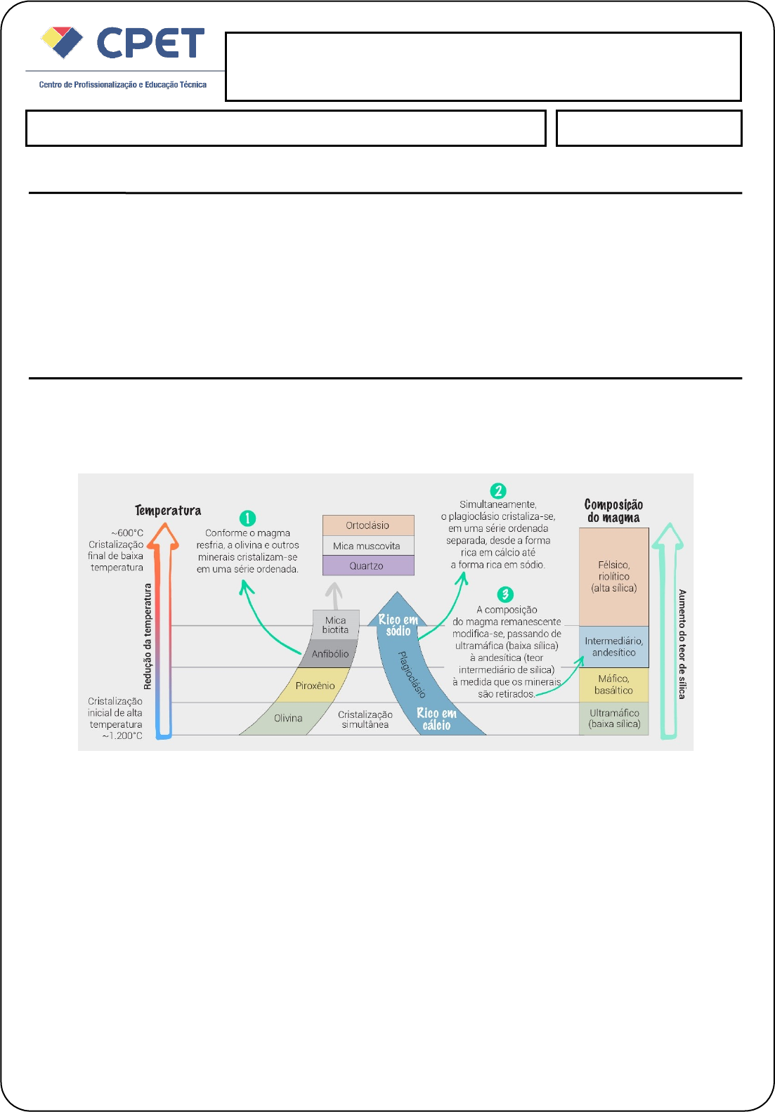Geologia I - sg Aluno (a): Gabriel Linhares de Sousa Data:01/08/2024 INSTRUÇÕES: · Este Laboratório contém questões, totalizando 10 (dez) pontos. · Você deve preencher dos dados no Cabeçalho para sua identificação · Nome / Data de entrega · As perguntas e respostas devem ser retiradas do Roteiro e digitadas logo abaixo. · Ao terminar, grave o arquivo em PDF com o nome do Laboratório Escolhido. · Envio o arquivo pelo sistema. A cristalização fracionada é o processo por meio do qual os cristais formados a partir de um magma em resfriamento são segregados do líquido remanescente. Essa segregação acontece de várias formas, seguindo uma sequência normalmente descrita como Série de Reação de Bowen: No cenário mais simples, os cristais formados em uma câmara magmática depositam-se no assoalho desta, sendo assim, impedidos de reagir com o líquido remanescente. Os cristais que já haviam se formado são, deste modo, segregados do magma remanescente que continua seu processo de cristalização à medida que se resfria. 1) Diga observando o gráfico, as temperaturas de concreção da Olivina e do Quartzo. a) 1000 e 500 b) 900 e 600 c) 1100 e 550 d) 1200 e 600 e) NRA 2) Quem é mais pobre em cálcio, Piroxênio ou Anfibólio? Piroxênio 3) O que significa ser ultramáfico? "Ultramáfico" é um termo usado em geologia para descrever um tipo de rocha ígnea que é particularmente rica em minerais máficos e tem um baixo teor de sílica. As rochas ultramáficas são compostas principalmente por minerais como olivina, piroxênio e, às vezes, anfibólio. No gráfico "Ultramáfico" image1.png image2.jpeg