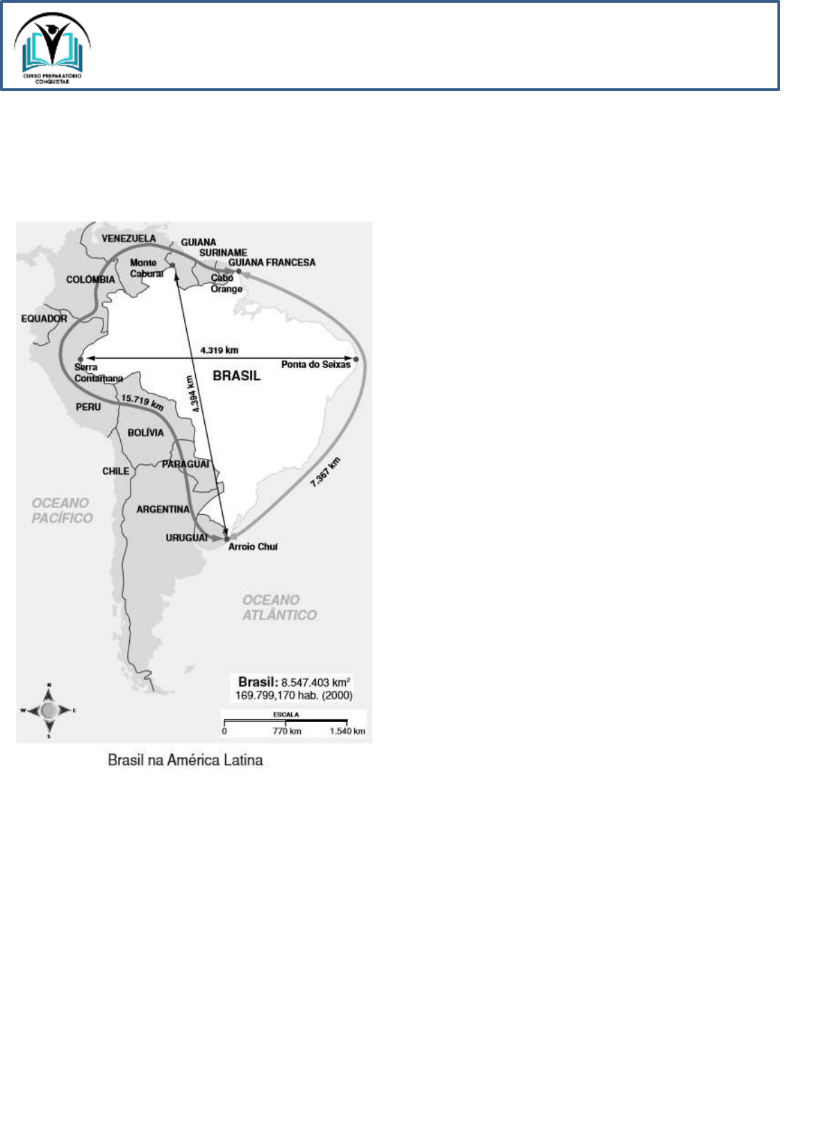 Curso Preparatório Conquistar. Turma: ESsA Professora: Danieli Sampaio. Disciplina: Geografia Nome: _________________________________________ Data: 30/04/2024 Território brasileiro e áreas fronteiriças - Resumo O Brasil, com 8.515.767,049 km², é um país de dimensões continentais. Entre todos os países de dimensões continentais, é o único cujo território é totalmente habitável. No Brasil, não há nenhuma cadeia montanhosa suficientemente elevada e nenhuma região desértica que possam dificultar, ou mesmo impedir, sua ocupação populacional. Em nenhuma região a pluviosidade média anual é inferior a 300 mm – e o limite convencionado para caracterizar uma zona desértica é de 250 mm. Não há altitudes que ultrapassem 3.200 m; nada de geleiras ou neves eternas. E as quedas de neve, para tristeza de muitos, ocorrem apenas em algumas regiões serranas do Sul. Assim, todas as regiões têm uma grande importância no presente e, certamente, um enorme valor potencial no futuro. Nesse sentido, pode-se dizer que o Brasil é um país com um futuro promissor. Entre todos os países do mundo é o que tem a maior capacidade de aproveitamento espacial. A grande extensão territorial brasileira possibilita a expansão da agricultura e pecuária, graças à diversidade de zonas climáticas. O potencial de recursos vegetais e minerais é bastante amplo. Mas a mesma extensão territorial traz consigo uma série de problemas, como as grandes distâncias a serem vencidas por rodovias e ferrovias, cujas construções são custosas. A distância entre São Paulo e Porto Alegre, por exemplo, corresponde à distância entre Lisboa, em Portugal, e Frankfurt, na Alemanha. Essa grande distância a ser percorrida encarece os custos de produção e transporte, cria problemas de diferenciação social, política e econômica entre as várias regiões do país. Com um formato semelhante ao de um triângulo de cabeça para baixo, nosso país está situado na porção centro- oriental da América do Sul, entre as latitudes +5º 16’ 20” N e – 33º 47’ 32” S. Isto significa que 93% do seu território está localizado no hemisfério sul. Apresenta distâncias enormes, mas notavelmente equilibradas, de um extremo a outro. A maior extensão no sentido norte-sul (4.394 km) é pouco maior que no sentido leste-oeste (4.319 km). Ao norte, o ponto extremo se localiza na nascente do rio Ailã, no monte do Caburaí, estado de Roraima (5º 16’ de latitude norte). No extremo sul, está o arroio Chuí, na divisa entre o Uruguai e o Brasil (33º 45’ de latitude sul). A oeste, a nascente do rio Moa, na serra de Contamana ou Divisor, na fronteira do estado do Acre com o Peru (73º 50’ de longitude oeste), e a leste, a ponta do Seixas, na Paraíba (34º 45’ de longitude oeste). Seu centro geográfico fica na margem esquerda do rio Jarina, perto de Barra do Garças, em Mato Grosso. O Brasil tem 23.086 km de fronteiras, sendo cerca de 15.719 km terrestres e 7.367 km marítimas. A fronteira atlântica se estende da foz do rio Oiapoque, no cabo Orange (AP) no Norte, ao arroio Chuí (RS), no Sul. Apenas dois países sul-americanos não têm fronteiras com nosso país: o Chile e o Equador. As fronteiras terrestres são dos mais variados tipos, mas com predomínio das naturais (rios, lagos e serras). O Brasil faz fronteiras: - Ao NORTE, com a Guiana Francesa, Suriname, Guiana, Venezuela e Colômbia; - Ao SUL, com o Uruguai e Argentina; e - A OESTE, com o Paraguai, Bolívia e Peru. Por causa da grande extensão Leste-Oeste, o território brasileiro, incluindo as ilhas oceânicas, estende-se por quatro fusos horários, sendo três sobre sua parte continental. EXERCÍCIOS 01. Com Extensão territorial de 8.515.767,049 km², o Território brasileiro ocupa 48% do subcontinente sul- americano. Sua grande dimensão e localização proporcionam fronteiras com quase todos os países da América do Sul. Marque a alternativa que indica as duas únicas nações sul-americanas que não fazem fronteira com o Brasil. a) Argentina e Uruguai b) Equador e Chile c) Colômbia e Suriname d) Chile e Panamá e) Paraguai e Venezuela 02. Uma das fronteiras mais movimentadas do Brasil, cujo marco divisório é a Ponte da Amizade, passando sobre o Rio Paraná, separa o país do: a) Uruguai b) Bolívia c) Equador d) Paraguai e) Peru 3. Sobre o território brasileiro, assinale a alternativa INCORRETA: a) o Brasil é um país com dimensões continentais. b) a extensão do território brasileiro denuncia a grande distância de seus pontos extremos. c) a localização do Brasil indica-se por longitudes negativas, no hemisfério ocidental. d) a grande variação de latitudes explica a homogeneidade climática do país. 4. As fronteiras brasileiras, todas elas posicionadas na América do Sul, totalizam 23.102 quilômetros de extensão. Desse total, mais de 15 mil quilômetros encontram-se em terras emersas, fazendo fronteira com todos os países sul- americanos, exceto: a) Venezuela e Colômbia b) Chile e Equador c) Uruguai e Guiana Francesa d) Panamá e Peru 5. Uma das fronteiras mais movimentadas do Brasil, cujo marco divisório é a Ponte da Amizade, passando sobre o Rio Paraná, separa o país do a) Uruguai b) Bolívia c) Equador d) Paraguai e) Peru 6. O país que apresenta o maior trecho fronteiriço com o território brasileiro é: a) Suriname b) Chile c) Bolívia d) Paraguai e) Argentina 1B 2D 3D 4B 5D 6C