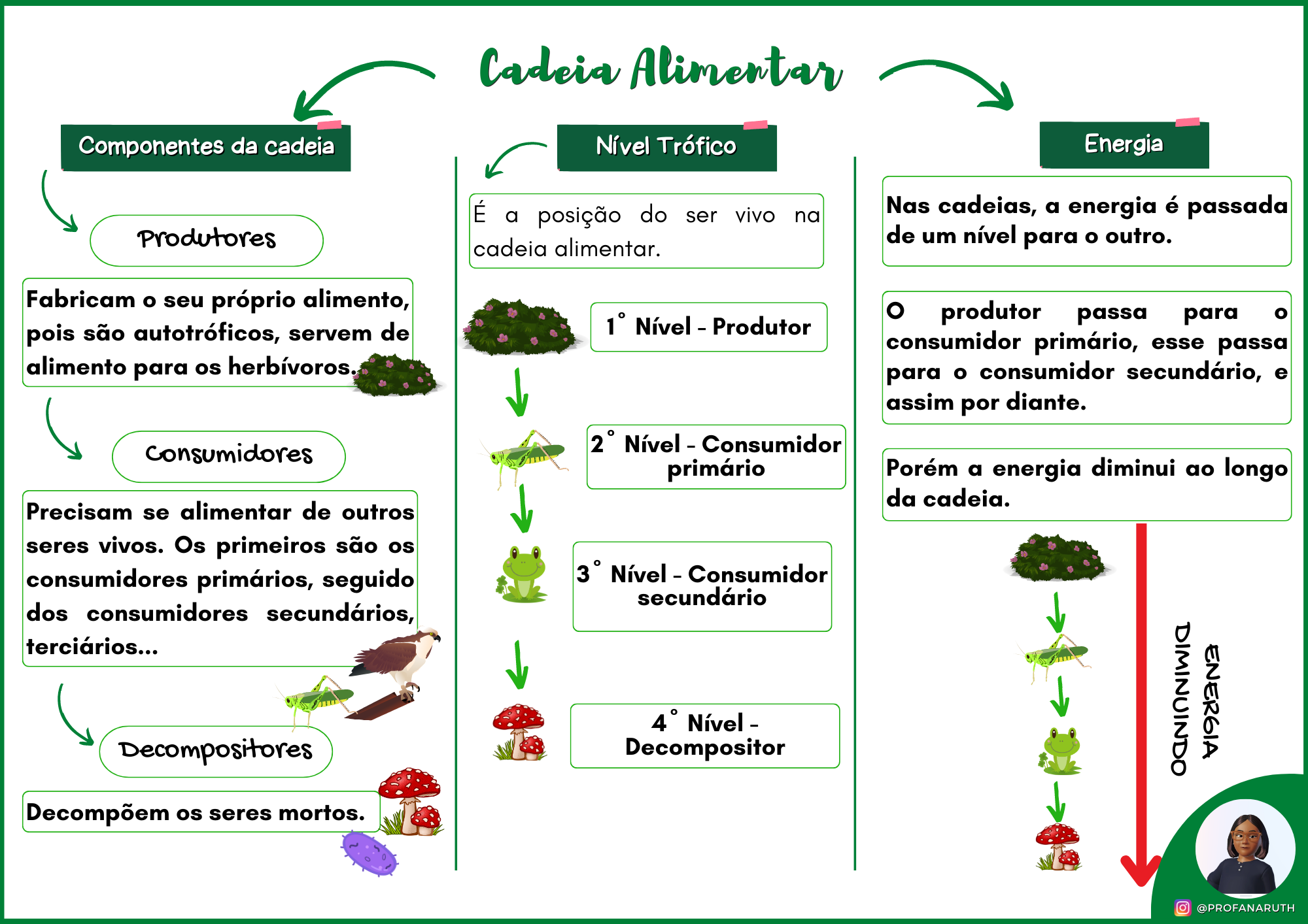 Cadeia Alimentar Componentes da cadeia Nível Trófico Energia É a posição do ser vivo na Nas cadeias, a energia é passada Produtores cadeia alimentar. de um nível para o outro. Fabricam o seu próprio alimento, pois são servem de 1° Nível - Produtor produtor passa para o consumidor primário, esse passa alimento para os herbívoros. para o consumidor secundário, e assim por diante. 2° Nível - Consumidor primário Porém a energia diminui ao longo Precisam se alimentar de outros da cadeia. seres vivos. Os primeiros são os consumidores primários, seguido Nível - Consumidor secundário dos consumidores secundários, terciários.. 4° Nível - Decompositores Decompositor Decompõem os seres mortos. O @PROFANARUTH