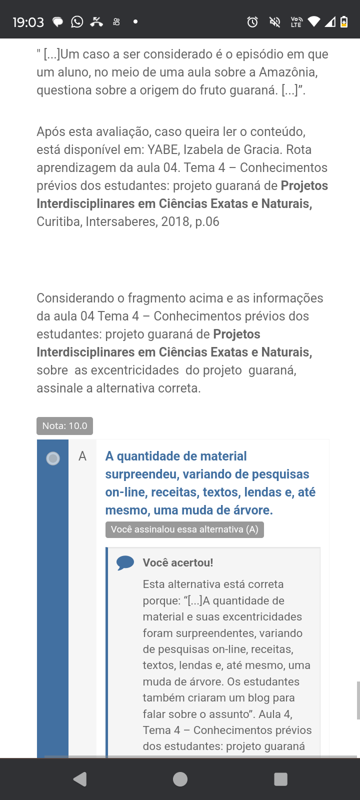 19:03 LTE [...]Um caso a ser considerado é o episódio em que um aluno, no meio de uma aula sobre a Amazônia, questiona sobre a origem do fruto guaraná. [...]". Após esta avaliação, caso queira ler o conteúdo, está disponível em: YABE, Izabela de Gracia. Rota aprendizagem da aula 04. Tema 4 - Conhecimentos prévios dos estudantes: projeto guaraná de Projetos Interdisciplinares em Ciências Exatas e Naturais, Curitiba, Intersaberes, 2018, p.06 Considerando o fragmento acima e as informações da aula 04 Tema 4 - Conhecimentos prévios dos estudantes: projeto guaraná de Projetos Interdisciplinares em Ciências Exatas e Naturais, sobre as excentricidades do projeto guaraná, assinale a alternativa correta. Nota: 10.0 A A quantidade de material surpreendeu, variando de pesquisas on-line, receitas, textos, lendas e, até mesmo, uma muda de árvore. Você assinalou essa alternativa (A) Você acertou! Esta alternativa está correta porque: "[...]A quantidade de material e suas excentricidades foram surpreendentes, variando de pesquisas on-line, receitas, textos, lendas e, até mesmo, uma muda de árvore. Os estudantes também criaram um blog para falar sobre o assunto". Aula 4, Tema 4 - Conhecimentos prévios dos estudantes: projeto guaraná