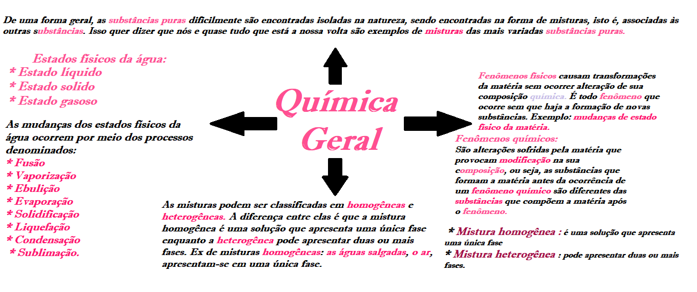 De uma forma geral, as substâncias puras dificilmente são encontradas isoladas na natureza, sendo encontradas na forma de misturas, isto é, associadas às outras substâncias. Isso quer dizer que nós e quase tudo que está a nossa volta são exemplos de misturas das mais variadas substâncias puras. Estados físicos da água: Estado líquido Fenômenos fisicos causam transformações Estado solido da matéria sem ocorrer alteração de sua Estado gasoso Química composição química. É todo fenômeno que ocorre sem que haja a formação de novas substâncias. Exemplo: mudanças de estado As mudanças dos estados físicos da fisico da matéria. água ocorrem por meio dos processos Geral Fenômenos químicos: denominados: São alterações sofridas pela matéria que * Fusão modificação na sua * Vaporização composição, ou seja, as substâncias que formam a matéria antes da ocorrência de * Ebulição um fenômeno químico são diferentes das * Evaporação As misturas podem ser classificadas em homogêneas e substâncias que compõem a matéria após * Solidificação o heterogêneas. A diferença entre elas é que a mistura * Liquefação homogênea é uma solução que apresenta uma única fase * Mistura homogênea : é uma solução que apresenta * Condensação enquanto a heterogênea pode apresentar duas ou mais uma única fase Sublimação. fases. Ex de misturas homogêneas: as águas salgadas, o ar, * Mistura heterogênea : pode apresentar duas ou mais apresentam-se em uma única fase. fases.