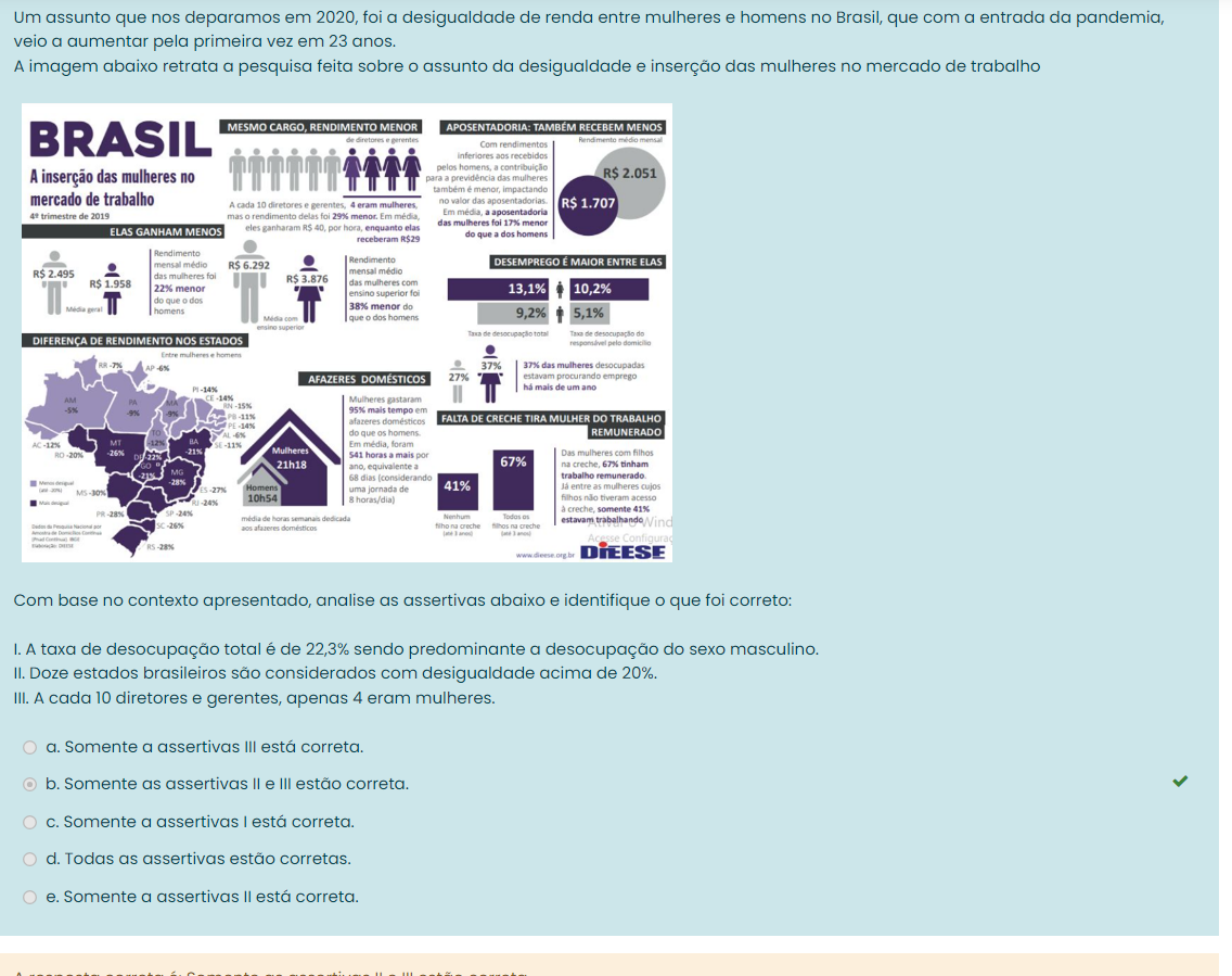 Um assunto que nos deparamos em 2020, foi a desigualdade de renda entre mulheres e homens no Brasil, que com a entrada da pandemia, veio a aumentar pelo primeira vez em 23 anos. A imagem abaixo retrata a pesquiso feita sobre assunto da desigualdade e inserção das mulheres no mercado de trabalho BRASIL MESMO RENDIMENTO MENOR APOSENTADORIA: TAMBÉM RECEBEM MENOS de mensal Com rendimentos inferiores aos recebidos pelos homens A inserção das mulheres no para previdência das mulheres R$ 2.051 menor impactando mercado de trabalho A cada 10 diretores gerentes eram mulheres no valor das R$ 1.707 trimestre de 2019 mas rendimento delas foi 29% Em Em aposentadoria das mulheres foi 17% menor ELAS GANHAM MENOS eles ganharam por enquanto elas receberam do que dos homens Rendimento Rendimento mensal médio DESEMPREGO E ENTRE ELAS R$ mensal médio das mulheres R$ 1.958 das mulheres com 22% menor superior foi 13,1% 10,2% do dos Média 38% menor do homens Média com que dos homens 9,2% 5,1% ensing superior desocupação total de do DIFERENCA DE RENDIMENTO NOS ESTADOS pelo Entre -6% 37% 37% das mulheres desocupadas AFAZERES DOMÉSTICOS 27% estavam procurando emprego mais de um ano AM CE -14% PA Mulheres gastaram -15% -5% 95% mais tempo em afazeres domésticos FALTA DE CRECHE TIRA MULHER DO TRABALHO -14% do que os homens REMUNERADO -12% MI Em foram -20% -26% 21% Mulheres 541 horas mais por Das mulheres com filhos 21h18 ano equivalente a 67% na 67% tinham MG 68 dias (considerando trabalho remunerado -27% Homens uma jornada de 41% entre as mulheres cujos MS-30% 10h54 filhos não tiveram acesso -24% somente 41% -28% -24% média de horas semanais dedicada Nenhum estavam trabalhando -26% aos afazeres domésticos creche creche -28% Com base no contexto apresentado, analise as assertivas abaixo e identifique o que foi correto: I. A taxa de desocupação total é de 22,3% sendo predominante a desocupação do sexo masculino. II. Doze estados brasileiros são considerados com desigualdade acima de III. A cada 10 diretores e gerentes, apenas 4 eram mulheres. a. Somente a assertivas III está correta. b. Somente as assertivas II e III estão C. Somente a assertivas I está d. Todas as assertivas estão corretas. e. Somente a assertivas II está correta.