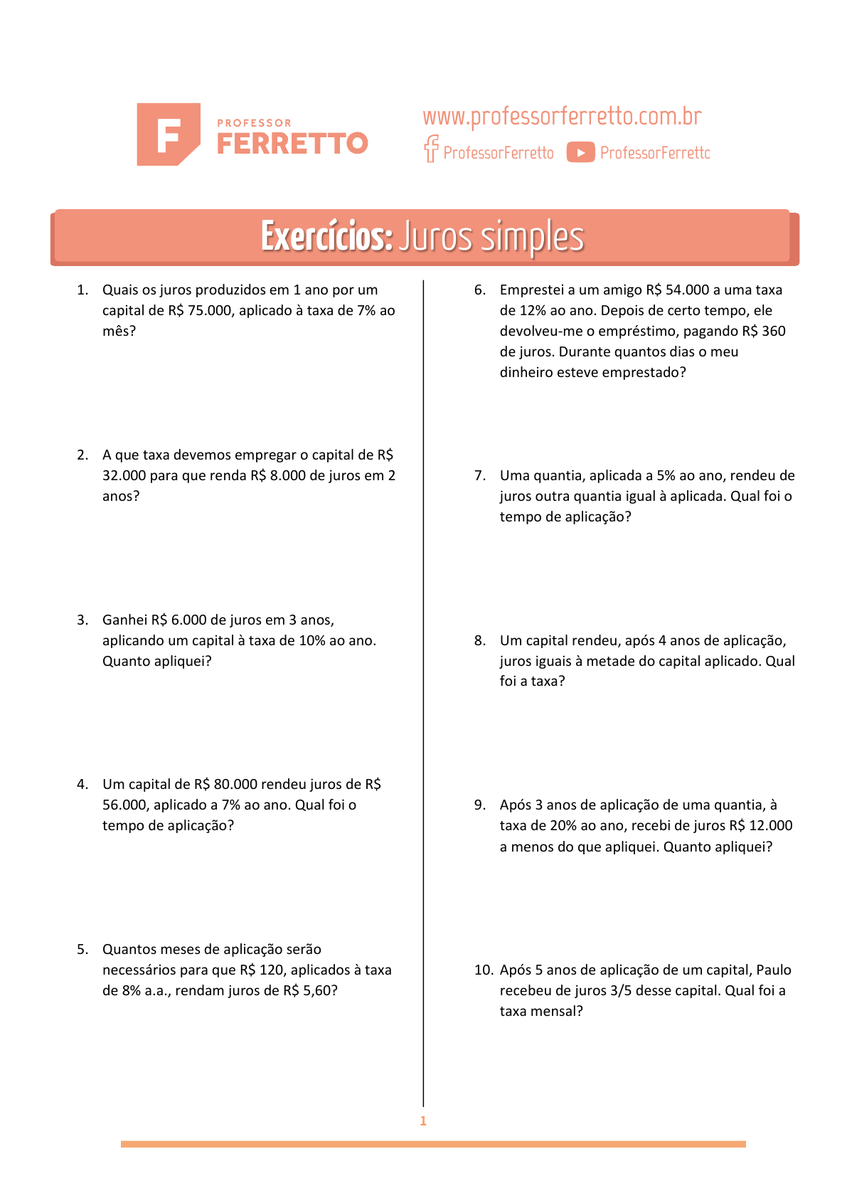 1 1. Quais os juros produzidos em 1 ano por um capital de R$ 75.000, aplicado à taxa de 7% ao mês? 2. A que taxa devemos empregar o capital de R$ 32.000 para que renda R$ 8.000 de juros em 2 anos? 3. Ganhei R$ 6.000 de juros em 3 anos, aplicando um capital à taxa de 10% ao ano. Quanto apliquei? 4. Um capital de R$ 80.000 rendeu juros de R$ 56.000, aplicado a 7% ao ano. Qual foi o tempo de aplicação? 5. Quantos meses de aplicação serão necessários para que R$ 120, aplicados à taxa de 8% a.a., rendam juros de R$ 5,60? 6. Emprestei a um amigo R$ 54.000 a uma taxa de 12% ao ano. Depois de certo tempo, ele devolveu-me o empréstimo, pagando R$ 360 de juros. Durante quantos dias o meu dinheiro esteve emprestado? 7. Uma quantia, aplicada a 5% ao ano, rendeu de juros outra quantia igual à aplicada. Qual foi o tempo de aplicação? 8. Um capital rendeu, após 4 anos de aplicação, juros iguais à metade do capital aplicado. Qual foi a taxa? 9. Após 3 anos de aplicação de uma quantia, à taxa de 20% ao ano, recebi de juros R$ 12.000 a menos do que apliquei. Quanto apliquei? 10. Após 5 anos de aplicação de um capital, Paulo recebeu de juros 3/5 desse capital. Qual foi a taxa mensal? Exercícios: Juros simples www.professorferretto.com.br ProfessorFerretto ProfessorFerretto 2 11. Um capital duplica-se em 4 anos. A que taxa foi empregado esse capital? 12. Uma pessoa que emprega 2/3 de seu capital a 24% ao ano, e o resto a 1% ao mês. No fim de 2 anos, recebe R$ 48.000 de juros. Qual o capital empregado? 13. Um capital, aplicado por 4 anos, aumentou de 2/5. Qual a taxa que foi aplicado? 14. Um capital de R$ 15.000 foi aplicado a juros simples à taxa bimestral de 3%. Para que seja obtido um montante de R$ 19.050, o prazo dessa aplicação deverá ser de: 15. Uma geladeira é vendida à vista por R$ 1.000 ou em duas parcelas, sendo a primeira com uma entrada de R$ 200 e a segunda, dois meses após, no valor de R$ 880. Qual a taxa mensal de juros simples utilizada? 16. Quanto se deve aplicar a 12% ao mês, para que se obtenha os mesmos juros simples que os produzidos por R$ 400.000 emprestados a 15% ao mês, durante o mesmo período? 17. Um capital aplicado a 5% ao mês a juro simples, triplicará em: 18. Empreguei metade do meu capital, à taxa de 20% ao ano, durante 3 anos. A outra metade, empreguei à taxa de 30% ao ano durante 2 anos. O total de juros que recebi foi de R$ 60.000. Logo, o capital inicial foi de: 19. Que prazo um capital aplicado à taxa de juros simples de 8% a.m. duplica? 20. Um capital foi aplicado a juros simples e, ao completar um período de 1 ano e 4 meses, produziu um montante equivalente a 7/5 de seu valor. A taxa mensal dessa aplicação foi de: 21. Um fogão é vendido por R$ 600.000 à vista ou com uma entrada de 22% e mais um pagamento de R$ 542.880, após 32 dias. Qual a taxa de juros mensal envolvida na operação? GABARITO: 1. R$ 63.000 2. 12,5% ao ano 3. R$ 20.000 4. 10 anos 5. 7 meses 6. 20 dias 7. 20 anos 8. 12,5% ao ano 9. R$ 30.000 10. 1% 11. 25% ao ano 12. R$ 120.000 13. 10% ao ano 14. 1 ano e 6 meses 15. 5% 16. R$ 500.000 17. 40 meses 18. R$ 100.000 19. 12,5 meses 20. 2,5% 21. 15%