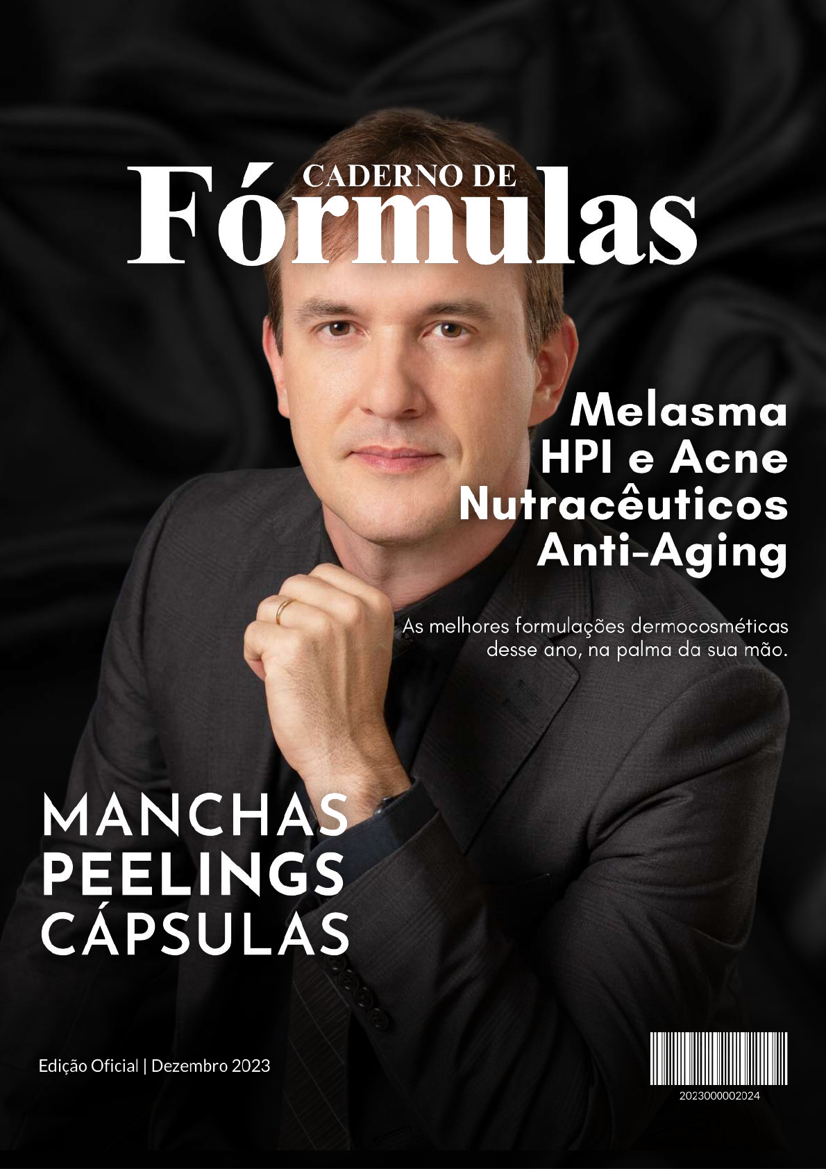 @profmarc iogu idoni Edição 1 .0 PROF. DR. MARCIO GUIDONI Prof. D r. M arcio G uidoni Farmacêutico-Bioquímico CRF 1749-ES Doutorado em Ciências Farmacêuticas Mestrado em Ciências Farmacêuticas MBA em desenvolvimento de produtos cosméticos Especialista em Química e Manipulação Farmacêutica DEZEMBRO 2023 Esse é um dos motivos para que a busca por uma pele mais clara e homogênea, se tornasse ainda mais frequente na saúde estética. Usar clareadores de pele é uma excelente estratégia no combate dessas manchas. Mas é importante lembrar que nenhuma fórmula deve ser usada sem supervisão de um profissional da área da saúde. O uso indevido pode acarretar danos à pele. Nas páginas a seguir, você irá conferir meu top 7 de formulações dermocosméticas para te auxiliar nesses procedimentos! É muito comum os pacientes manchados relatarem sentimentos de vergonha, baixa autoestima, insatisfação e a falta de motivação para sair de casa. Devido a esse contexto, as manchas causam um impacto negativo na qualidade de vida dos pacientes, afetando seu bem-estar psicológico e emocional, que muitas vezes os motiva a procurar algum procedimento estético. Fórmulas para manchas na pele Edição 1.0 | Página 2 FÓRMULA MELASMA - USO DIURNO Ácido Mandélico 5%, Belides 3%, Ácido Ascórbico 10%, Niacinamida PC 3%, Alfa Bisabolol 1%, Gel Creme QSP. Aplicar uma fina camada na face, antes do protetor solar. Esta fórmula não deve ser usada sem supervisão de um profissional da área da saúde. O uso indevido pode acarretar danos à pele. FÓRMULA HOME CARE - MANCHA NAS MÃOS Ácido Glicólico 10%, Ácido Lático 5%, Alfa Arbutin 4%, Inaclear 0,5%, Hidrocortisona 0,5%, Loção 30ml. Aplicar a noite e lavar pela manhã. Esta fórmula não deve ser usada sem supervisão de um profissional da área da saúde. O uso indevido pode acarretar danos à pele. MANCHAS DE ACNE EM PELES MORENAS Azeloglicina 6%, Melaslow 2%, Alfa Bisabolol 2%, Creme 30gr. Aplicar a noite. Recomendo o uso por um período de 2 a 3 meses. Esta fórmula não deve ser usada sem supervisão de um profissional da área da saúde. O uso indevido pode acarretar danos à pele. Edição 1.0 | Página 3 Desonida 0,05%, POMC Block 1%, Sepiwhite 1%, Belides 3%, Ácido Kójico Dipalmitato 3%, Ácido Tranexâmico 3%, Alfa Arbutin 5%, Physavie 0,5%, Base Second Skin QSP 30g. Aplicar a noite, lavar pela manhã. Esta fórmula não deve ser usada sem supervisão de um profissional da área da saúde. O uso indevido pode acarretar danos à pele. H PI D E A T A F Ó R M U L A S PA R A U SO N O T U R N O FÓRMULAS PARA HPI DE ATA USO NOTURNO Edição 1.0 | Página 4 MANCHAS NAS MÃOS REJUVENESCIMENTO Jessner Modificado(1 a 2 camadas) Ácido Retinóico 5% ou Vitamina C 40% Aplicar o Jessner Modificado em até 2 camadas, sem remover. Logo em seguida, aplicar o Ácido Retinóico ou Vitamina C por 4 horas. Refazer a cada 30 dias. Essa fórmula deve ser feita/aplicada somente em consultório, por um profissional habilitado. Esta fórmula não deve ser usada sem supervisão de um profissional da área da saúde. O uso indevido pode acarretar danos à pele. FÓRMULA PARA DERMATITE ATÓPICA MANCHAS HPI DE ATA USO DIURNO Cerassomosides 2%, Sensamone 1%, Betacariofileno 0,5%, Alfa Bisabolol 4%, Alantoína 2%, Gel Creme 30gr. Aplicar nos locais, 2x ao dia. Esta fórmula não deve ser usada sem supervisão de um profissional da área da saúde. O uso indevido pode acarretar danos à pele. VC-IP 5%, Niacinamida PC 3%, Ácido Ferúlico 2%, Whitonyl 1%, Inaclear 1%, Lumiskin 2%, Physavie 0,5%, Base Second Skin QSP 30g. Aplicar pela manhã, antes do filtro solar. Esta fórmula não deve ser usada sem supervisão de um profissional da área da saúde. O uso indevido pode acarretar danos à pele. Edição 1.0 | Página 5 FÓRMULAS PARA PRÉ E PÓS PEELINGS O peeling químico é uma técnica estética que utiliza ácidos para renovar a camada superficial da pele. Ele pode ser utilizado para tratar diversas condições, como manchas, acne, linhas finas e rugas. A aplicação do peeling químico pode ser feita em diversas áreas do corpo, como rosto, pescoço, colo, mãos e dorso dos pés. Mas é importante que o paciente siga as orientações pré e pós-procedimento para garantir os melhores resultados e minimizar possíveis efeitos colaterais. Essas são etapas fundamentais no gerenciamento da pele do seu paciente. O pré peeling é uma associação de ativos, que irá preparar a pele para receber a ação do peeling, em consultório. Já o pós peeling serve para recuperar a pele do paciente (imediatamente e alguns dias depois). Nas páginas a seguir, você irá conferir meu top 3 de formulações dermocosméticas para te auxiliar nesses procedimentos! Edição 1.0 | Página 6 PÓS PEELING DE ATA/TCA TARDIO Ácido Retinóico 0,05%, Alfa Arbutin 5%, Niacinamida PC 3%, Sepiwhite 1%, VCPMG 5%, TGP2 Peptide 1%, Physavie 1%, Gel Creme qsp 30g. Aplicar na face à noite e reaplicar sobre as manchas. Lavar pela manhã. Esta fórmula não deve ser usada sem supervisão de um profissional da área da saúde. O uso indevido pode acarretar danos à pele. PÓS PEELING TARDIO HOME CARE - ACNE Ácido Salicílicio 2%, Ácido Lactobiônico 3%, Ácido Mandélico 4%, Cosmacol ELI 5%, Acneol SR 1%, Alfa Bisabolol 2%. Essa fórmula é indicada para pacientes acneicos e/ou acne da mulher adulta. Esta fórmula não deve ser usada sem supervisão de um profissional da área da saúde. O uso indevido pode acarretar danos à pele. PRÉ PEELING SUAVE Gluconolactona 10%, Ácido Kójico 3%, Niacinamida 3%, Ácido Ferúlico 1%, Alfa Bisabolol 1%, Creme 15gr. Aplicar a noite e lavar pela manhã, durante 15 dias antes do peeling. Esta fórmula não deve ser usada sem supervisão de um profissional da área da saúde. O uso indevido pode acarretar danos à pele. Edição 1.0 | Página 7 Fórmulas em Cápsulas Os nutracêuticos têm se tornado cada vez mais importantes na saúde est