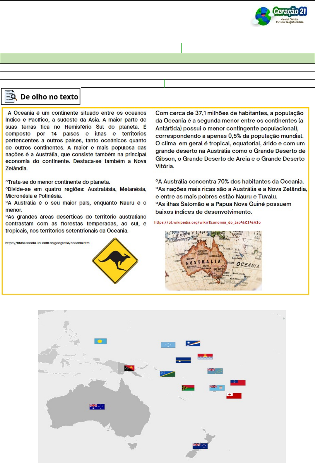 ESCOLA/COLÉGIO: ______________________________________________________ ALUNO (A): _______________________________________________________________ GEOGRAFIA ANO: 9º ANO ATIVIDADE 01 – 3º/4º BIMESTRE Objeto de conhecimento: OCEANIA. Habilidade: (EF09GE03) ;(EF09GE08) e (EF09GE09.) Data: Turma: OCEANIA Mapa da Oceania QUESTÃO 01 (EF09GE09) Qual o total de habitantes na Oceania? ______________________________________________________________________________________________________________________________________________________________________________ _______________________________________________________________________________________ QUESTÃO 02 (EF09GE09) Segundo o texto qual a porcentagem da população global que vive neste continente? ______________________________________________________________________________________________________________________________________________________________________________ _______________________________________________________________________________________ https://i.pinimg.com/originals/64/92/9d/64929d2e96e26196624f929100b810a1.jpg QUESTÃO 03 (EF09GE08) Descreva os aspectos gerais da Oceania: ______________________________________________________________________________________________________________________________________________________________________________ _______________________________________________________________________________________ QUESTÃO 04 (EF09GE08) De acordo com o texto qual o total de países deste continente? ______________________________________________________________________________________________________________________________________________________________________________ _______________________________________________________________________________________ QUESTÃO 05 (EF09GE03) leia as questões e responda: A) Verifique no texto qual o país mais populoso da Oceania? _______________________________________________________________________________________ _______________________________________________________________________________________ B) Quais as quatro sub-regiões do continente estudado? _______________________________________________________________________________________ _______________________________________________________________________________________ Mapa da Austrália e Nova Zelândia. https://www.guiageo.com/oceania.htm QUESTÃO 07 (EF09GE09) Marque F (FALSO) ou V (VERDADEIRO) para as alternativas: ( ) A Austrália concentra 70% dos habitantes da Oceania. ( ) As nações mais ricas não são a Austrália e a Nova Zelândia, e entre as mais pobres estão Nauru e Tuvalu ( ) A Austrália é o seu maior país, enquanto Nauru é o segundo maior. ( ) Divide-se em quatro regiões: Austrália, Melanésia, Micronésia e Polinésia. QUESTÃO 08 (EF09GE09) Leia e marque uma alternativa sobre a Oceania: ( ) Possui o menor contingente populacional, correspondendo a apenas 0,5% da população mundial. ( ) A Austrália concentra 90% dos habitantes da Oceania. ( ) É composto por 14 países em territórios continentais. ( ) A Oceania é um continente situado entre os oceanos Índico e Atlântico. QUESTÃO 09 (EF09GE08) Observe a charge pense e dê sua opinião obre ela: https://fonte83.com.br/incendios-na-australia-e/ QUESTÃO 10 (EF09GE09) Busque e circule as palavras chave no Caça Palavras : OCEANIA-AUSTRÁLIA-CONTINENTE-PACÍFICO : GABARITO QUESTÃO 01: Com cerca de 37,1 milhões de habitantes, a população da Oceania é a segunda menor entre os continentes. QUESTÃO 02: Apenas 0,5% da população mundial. QUESTÃO 03: A Oceania é um continente situado entre os oceanos Índico e Pacífico, a sudeste da Ásia. A maior parte de suas terras fica no Hemisfério Sul. QUESTÃO 04: No total são 14 países em ilhas e territórios. QUESTÃO 05: A) A maior e mais populosa das nações é a Austrália. B)Divide-se em quatro regiões: Australásia, Melanésia, Micronésia e Polinésia. QUESTÃO 06: ( V) (F) (F) (F) QUESTÃO 07: (X) ( ) ( ) ( ) QUESTÃO 08: Resposta pessoal do aluno. QUESTÃO 09: image5.png image6.png image7.png image8.jpeg image9.png image10.png image1.jpeg image2.png image3.png image4.jpeg
