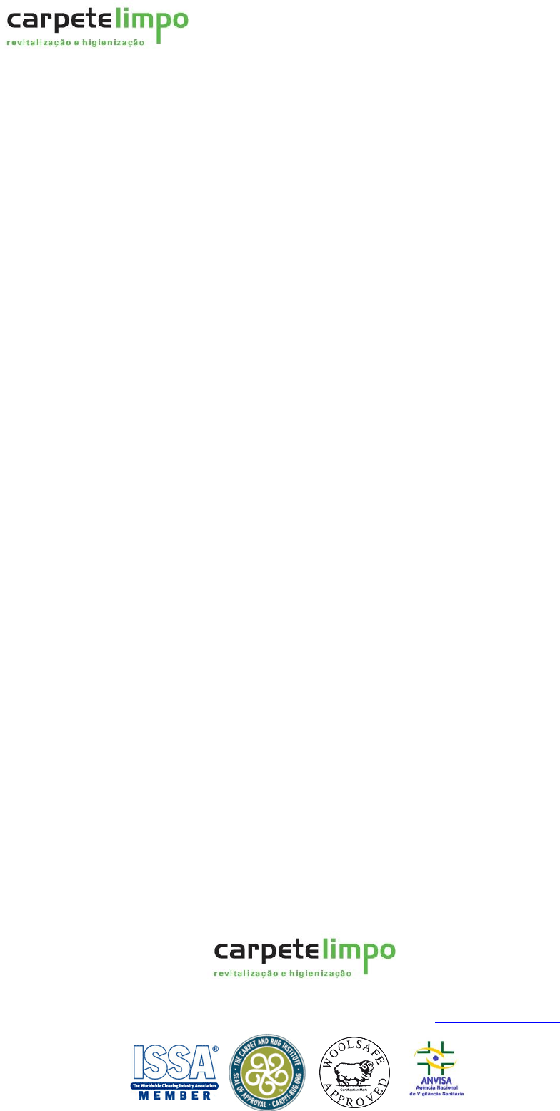 Frederico Muniz de Almeida – ME (CarpeteLimpo) CNPJ: 10.352.743/0001-84 Insc. Municipal: 230.785/001-X Insc. Estadual: 001795953.0084 Belo Horizonte MG- Tel.: (31) 3264-4479 Cel.: (31) 8789-7884 Visite nosso site: www.carpetelimpo.com.br 1/8 Belo Horizonte, 2022 MEMORIAL DESCRITIVO Prestação de Serviços de Higienização e Limpeza de Carpetes Utilizando o Sistema à Seco. http://www.carpetelimpo.com.br/ Frederico Muniz de Almeida – ME (CarpeteLimpo) CNPJ: 10.352.743/0001-84 Insc. Municipal: 230.785/001-X Insc. Estadual: 001795953.0084 Belo Horizonte MG- Tel.: (31) 3264-4479 Cel.: (31) 8789-7884 Visite nosso site: www.carpetelimpo.com.br 2/8 Índice 1. Objeto 2. Escopo dos Serviços 2.1 O processo de Higienização e Limpeza a Seco 3. Especificações Técnicas 3.1 Máquinas e Equipamentos 3.2 Produtos 3.3 Serviço http://www.carpetelimpo.com.br/ Frederico Muniz de Almeida – ME (CarpeteLimpo) CNPJ: 10.352.743/0001-84 Insc. Municipal: 230.785/001-X Insc. Estadual: 001795953.0084 Belo Horizonte MG- Tel.: (31) 3264-4479 Cel.: (31) 8789-7884 Visite nosso site: www.carpetelimpo.com.br 3/8 1. Objeto O escopo descrito neste memorial refere-se a contratação de serviços de higienização e limpeza de carpetes, utilizando o método de limpeza a seco. 2. Escopo dos Serviços 2.1 O Processo de Higienização e Limpeza a Seco O processo de limpeza de carpetes a seco deverá ser realizado através de um sistema de higienização que utiliza a combinação de fatores químicos e mecânicos. Este sistema de limpeza consiste na aplicação de um produto do tipo micro-cristais, devendo ser o mesmo com um pH neutro exclusivo para carpetes , além da utilização de máquinas específicas para escovação do produto no carpete e sua extração mecânica. As partículas do produto com milhares de micro-cristais combinadas com uma mistura única de substâncias ativo-laváveis, deverão dissolver e absorver completamente os diferentes tipos de sujidade contidos no carpete, tais como fuligem, poeiras entre outras, revitalizando assim as cores, brilho e o volume das fibras do carpete. Após a aplicação e escovação das micro-cristais, as mesmas deverão ser extraídas do carpete, através do sistema de aspiraçao mecanica das máquinas de limpeza a seco. Este processo deverá maximizar o efeito da limpeza com as micro-cristais, através da dupla rotação de escovas da máquina, cuja função é espalhar o produto por toda a extensão do carpete http://www.carpetelimpo.com.br/ Frederico Muniz de Almeida – ME (CarpeteLimpo) CNPJ: 10.352.743/0001-84 Insc. Municipal: 230.785/001-X Insc. Estadual: 001795953.0084 Belo Horizonte MG- Tel.: (31) 3264-4479 Cel.: (31) 8789-7884 Visite nosso site: www.carpetelimpo.com.br 4/8 permitindo uma limpeza homogênea, alem de desembaraçar e levantar as fibras do carpete, restaurando-as e permitindo a penetração das micro- cristais da base até a superfície das fibras, garantindo assim uma limpeza profunda e restaurativa. Este processo de limpeza deverá deixar o carpete completamente seco após o término da limpeza. Após a extração das pártículas de micro-cristais, deverá ser aplicado no carpete um tratamento de higienização, eliminando com eficiência os germes, ácaros, bactérias e fungos. 3. Especificações Técnicas Para realização dos serviços de limpeza de carpete utilizando o sistema a seco, será necessário a utilização das seguintes máquinas, equipamentos e produtos: 3.1 Máquinas e equipamentos - Máquina para limpeza de carpete a seco Fabricante Carpet Cleaner Reinigungssysteme GmbH, com as seguintes características e especificações: peso de 21,3 kg, largura de 540 mm, alturas de 230 mm e 1.080 mm, motor de 600W / 230V / 50Hz, rotação das escovas de 400U/min e voltagem de 110V. http://www.carpetelimpo.com.br/ Frederico Muniz de Almeida – ME (CarpeteLimpo) CNPJ: 10.352.743/0001-84 Insc. Municipal: 230.785/001-X Insc. Estadual: 001795953.0084 Belo Horizonte MG- Tel.: (31) 3264-4479 Cel.: (31) 8789-7884 Visite nosso site: www.carpetelimpo.com.br 5/8 Este equipamento é dotado de 02 (duas) escovas cilíndricas horizontais e paralelas, com rotação invertida, garantindo a estabilidade da maquina durante seu funcionamento. Estas escovas devem possuir as seguintes dimensões: diâmetro de 110 mm e comprimento de 480mm e com cerdas de 30 mm de comprimento, sendo esta medida de extrema importância para penetração correta na fibra no carpete, garantindo a escovação até sua base. Além das escovas acima citadas, esta máquina deverá possuir os seguintes acessórios: 02 (dois) coletores de sujeira do tipo “Renovator”, 01 (um) protetor de poeira com rodas, 01 (um) protetor de poeira sem rodas e 01 (um) carrinho para transporte. Figura 1 – Máquina para limpeza de carpete a seco http://www.carpetelimpo.com.br/ Frederico Muniz de Almeida – ME (CarpeteLimpo) CNPJ: 10.352.743/0001-84 Insc. Municipal: 230.785/001-X Insc. Estadual: 001795953.0084 Belo Horizonte MG- Tel.: (31) 3264-4479 Cel.: (31) 8789-7884 Visite nosso site: www.carpetelimpo.com.br 6/8 - Aspiradores de Pó Aspirador de pó vertical com 2000W de potência. Potente escova elétrica rotativa com tecnologia cyclone faz com que a sujeira aspirada fique totalmente compactada dentro do recipiente otimizando a limpeza, classificação de filtragem de classe HEPA - Pulverizador Pulverizador elétrico/ bateria de compressão prévia de 15 litros de capacidade. - EXTENSÃO ELETRICA Cabo de energia elétrica para ligar a maquina as tomadas 3.2 Produtos Para realização do serviço de higienização e limpeza, deverão ser utilizados os seguintes produtos: Composto Cristal Cleaner Limpador , pH 7, com a seguinte composição: veiculo orgânico natural, tensoativo não iônico, solvente, atenuador de espuma, controlador de pH, essência e conservante. Para maiores detalhes técnicos do composto, vide ficha FISPQ e Literatura do Produto, em anexo. -- Produto CAPT IND http://w
