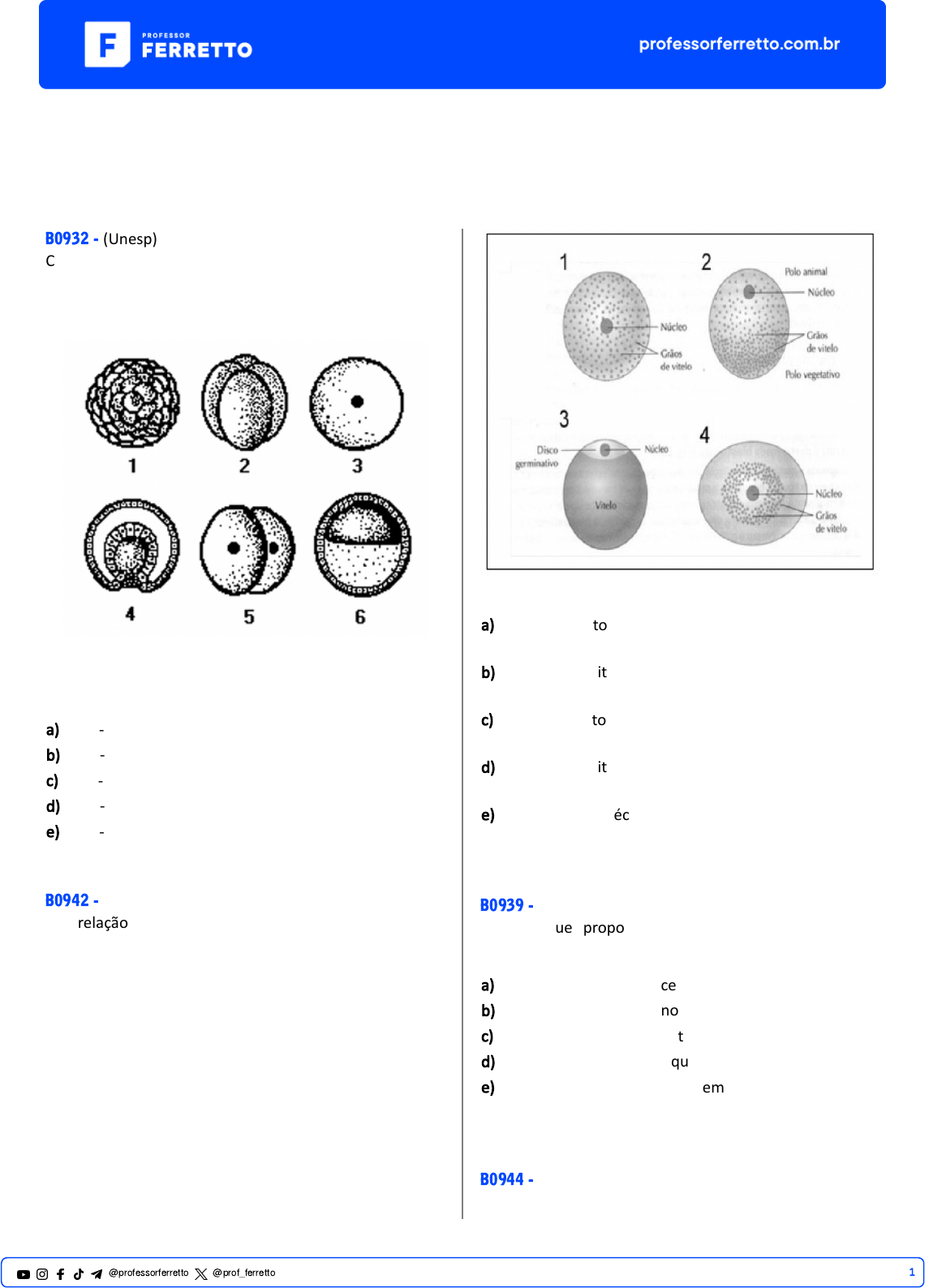 Embriologia Animal Introdução à Embriologia B0932 - (Unesp) Considere os esquemas, numerados de 1 a 6, que mostram os diferentes estágios que ocorrem durante o processo de clivagem. Observe que eles não estão na sequência correta de acontecimentos. Em qual alterna�va o desenvolvimento embrionário está em ordem sequencial totalmente correta? a) 3 - 6 - 1 - 4 - 5 - 2. b) 5 - 3 - 1 - 4 - 6 - 2. c) 3 - 5 - 2 - 1 - 6 - 4. d) 1 - 3 - 5 - 6 - 4 - 2. e) 3 - 1 - 5 - 2 - 6 - 4. B0942 - (Fps) Em relação à distribuição dos grânulos de vitelo na maioria das células-ovo dos animais, observe a figura abaixo e classifique os ovos de acordo com a quan�dade e distribuição do vitelo. a) 1. Ovo Isolécito; 2. Ovo Centrolécito; 3. Ovo Telolécito; 4. Ovo Heterolécito. b) 1. Ovo Telolécito; 2. Ovo Heterolécito; 3. Ovo Isolécito; 4. Ovo Centrolécito. c) 1. Ovo Isolécito; 2. Ovo Heterolécito; 3. Ovo Telolécito; 4. Ovo Centrolécito. d) 1. Ovo Telolécito; 2. Ovo Isolécito; 3. Ovo Heterolécito; 4. Ovo Centrolécito. e) 1. Ovo Centrolécito; 2. Ovo Heterolécito; 3. Ovo Telolécito; 4. Ovo Isolécito. B0939 - (Unipê) O fator que proporciona a diferenciação entre ovos oligolécitos e telolécito irá influenciar a) na presença ou não do celoma. b) na presença ou não da notocorda. c) no modo de formação do tubo neural. d) no �po de segmentação que o ovo irá sofrer. e) no número de folhetos embrionários formados, durante a embriogênese. B0944 - (Facisa) 1@professorferretto @prof_ferretto No citoplasma das células-ovo de pra�camente todas as espécies animais encontram-se substâncias nutri�vas cons�tuídas basicamente de proteínas e lipídios, na forma de grânulos de “vitelo”. Tal conteúdo tem a finalidade de nutrir as células embrionárias no início do desenvolvimento. O �po de segmentação que ocorrerá na célula-ovo está diretamente relacionado à sua quan�dade de vitelo. Tomando por base a quan�dade e a distribuição de vitelo, podemos classificar os ovos em quatro �pos: (1) oligolécitos, (2) mesolécitos, (3) megalécitos e (4) centrolécitos. Nesse contexto, analise as proposições a seguir e estabeleça a associação correta com os �pos de ovos u�lizando os respec�vos números de 1 a 4 correspondentes acima enumerados. (_) Quan�dade rela�vamente pequena de vitelo, de distribuição mais ou menos homogênea no citoplasma; presente em cordados, equinodermos, moluscos, anelídeos, nematódeos e platelmintos. (_) Quan�dade rela�vamente grande de vitelo, distribuída de forma heterogênea no citoplasma; maior concentração de vitelo em um dos polos – polo vegeta�vo; o polo oposto, com menos vitelo, denomina- se polo animal; �picos dos an�bios. (_) Quan�dade grande de vitelo, ocupando pra�camente quase toda a célula; presente em aves, répteis, peixes e moluscos cefalópodes. (_) Quan�dade rela�vamente grande de vitelo concentrada na região central da célula; presente na maioria dos artrópodes. A sequência correta de associação é a) 4, 3, 1, 2. b) 4, 3, 2, 1. c) 1, 2, 4, 3. d) 1, 3, 2, 4. e) 1, 2, 3, 4. B0946 - (Uel) As células-ovo, ou zigoto, possuem substâncias nutri�vas armazenadas no citoplasma, que cons�tuem o vitelo. Assinale a alterna�va que relaciona corretamente as células-ovo à quan�dade e distribuição do vitelo, aos grupos animais que as apresentam e ao �po de segmentação. a) Ovos isolécitos, que possuem pouco vitelo distribuído de maneira uniforme, estão presentes em mamíferos e apresentam segmentação holoblás�ca. b) Ovos heterolécitos, que possuem uma quan�dade grande de vitelo restrita à região central, estão presentes nos moluscos e apresentam segmentação meroblás�ca. c) Ovos telolécitos, que possuem pouco vitelo distribuído de maneira uniforme, estão presentes em anelídeos e apresentam segmentação superficial. d) Ovos centrolécitos, que possuem uma quan�dade moderada de vitelo distribuída de maneira uniforme, estão presentes nos an�bios e apresentam segmentação holoblás�ca. e) Ovos mesolécitos, que possuem uma grande massa de vitelo na região central, estão presentes nos insetos e apresentam segmentação meroblás�ca. B0937 - (Fip) A úl�ma fase do desenvolvimento embrionário, onde ocorre a diferenciação dos tecidos e órgãos, denomina- se: a) Gastrulação. b) Neurulação. c) Organogênese. d) Clivagem. e) Segmentação. B0938 - (Uel) Na charge, existe a dúvida do que é esquerda e do que é direita, porém um dos mais importantes fenômenos do 2@professorferretto @prof_ferretto processo embrionário dos animais é o desenvolvimento dos três eixos corporais, entre os quais o eixo direito- esquerdo. Com raras exceções, todo embrião animal desenvolve esses eixos embrionários, que definem a estrutura corporal do futuro organismo. Assinale a alterna�va que apresenta, corretamente, em que momento, nos seres humanos, o eixo direito-esquerdo é definido durante o desenvolvimento embrionário. a) Durante a fase de clivagem. b) Durante a formação da blástula. c) Na gastrulação. d) Na histogênese. e) No estágio de mórula. B0943 - (Uece) Numere a coluna B, de acordo com a coluna A, relacionando os �pos de óvulos aos animais que os produzem. COLUNA A 1. Oligolécito 2. Heterolécito 3. Centrolécito 4. Telolécito COLUNA B (_) Artrópodes (_) An�bios (_) Aves (_) Equinodermos Assinale a alterna�va que contém a sequência correta, de cima para baixo. a) 3; 2; 4; 1. b) 2; 3; 1; 4. c) 1; 3; 4; 2. d) 4; 2; 3; 1. B0941 - (Upe) Com relação ao �po de óvulo encontrado nos seres humanos, é correto afirmar que ele é a) telolécito, como o da maioria dos mamíferos. b) alécito, pois a nutrição do embrião se processará via placenta. c) alécito, com grande quan�dade de vitelo na região central, o que provoca uma segmentação holoblás�ca igual. d) centrolécito, o que se jus�fica pelo consumo 