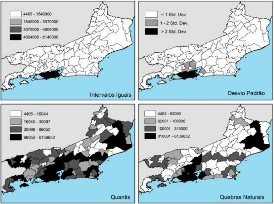 CEDERJ - Faculdade de Geografia Disciplina: Cartografia Temática Atividade à Distância 2 – Atividade em Grupo de no máximo 4 pessoas Lista de Exercícios: 1- Segundo o tipo e o nível de complexidade das informações a serem representadas, podemos classificar a cartografia como: Cartografia de Inventário, Cartografia Analítica ou Cartografia de Síntese. Diferencie cada uma destas ramificações da Cartografia Temática, e dê exemplos de cada uma delas. 2- Diferencie os mapas temáticos qualitativos dos quantitativos. Procure exemplos para cada um destes mapas, e ilustre a sua resposta. 3- Quais cuidados devemos ter ao analisar um mapa temático quantitativo? Explique a razão que faz com que os mapas abaixo sejam diferentes.