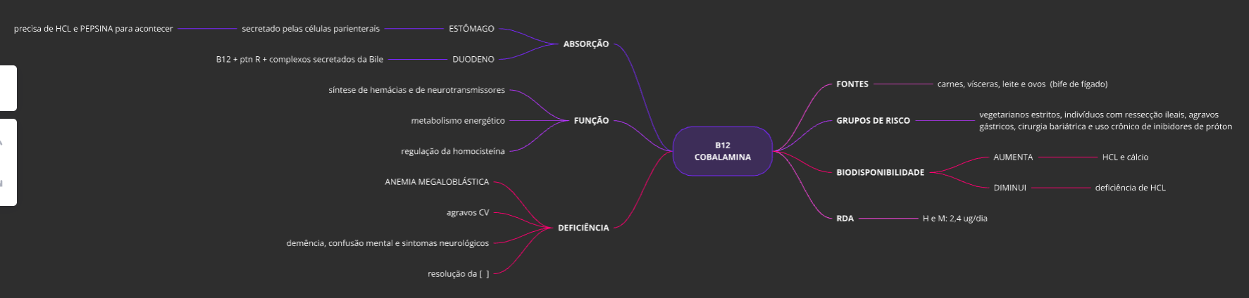EPSINA para acontecer secretado pelas células parienterais ESTÔMAGO ABSORÇÃO B12 + ptn complexos secretados da Bile DUODENO FONTES carnes, visceras, leite e ovos (bife de síntese de hemácias e de neurotransmissores metabolismo energético FUNÇÃO vegetarianos estritos, indivíduos com ressecção ileais, agravos GRUPOS DE RISCO gástricos, cirurgia bariátrica e uso crônico de inibidores de prót B12 regulação da COBALAMINA AUMENTA HCL e cálcio BIODISPONIBILIDADE ANEMIA MEGALOBLÁSTICA deficiência de HCL agravos CV RDA H e 2.4 ug/dia DEFICIÊNCIA confusão mental e sintomas neurológicos resolução da