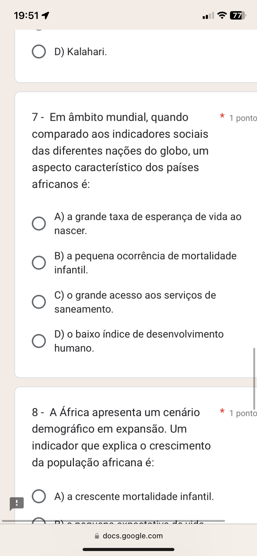 19:51 77 D) Kalahari. - Em âmbito mundial, quando * 1 ponto comparado aos indicadores sociais das diferentes nações do globo, um aspecto característico dos países africanos é: A) a grande taxa de esperança de vida ao nascer. B) a pequena ocorrência de mortalidade infantil. C) o grande acesso aos serviços de saneamento. D) o baixo índice de desenvolvimento humano. - A África apresenta um cenário * 1 ponto demográfico em expansão. Um indicador que explica o crescimento da população africana é: A) a crescente mortalidade infantil. docs.google.com