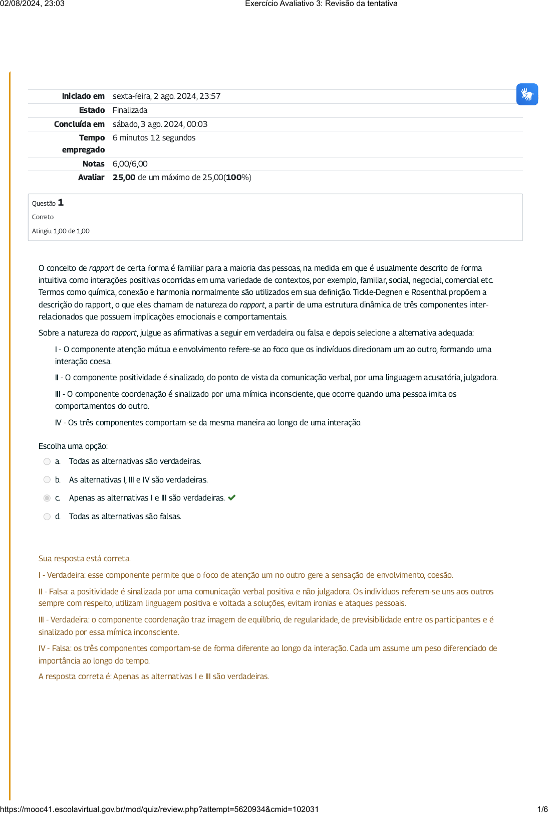 Iniciado em sexta-feira, 2 ago. 2024, 23:57 Estado Finalizada Concluída em sábado, 3 ago. 2024, 00:03 Tempo empregado 6 minutos 12 segundos Notas 6,00/6,00 Avaliar 25,00 de um máximo de 25,00(100%) Questão 1 Correto Atingiu 1,00 de 1,00 O conceito de rapport de certa forma é familiar para a maioria das pessoas, na medida em que é usualmente descrito de forma intuitiva como interações positivas ocorridas em uma variedade de contextos, por exemplo, familiar, social, negocial, comercial etc. Termos como química, conexão e harmonia normalmente são utilizados em sua de�nição. Tickle-Degnen e Rosenthal propõem a descrição do rapport, o que eles chamam de natureza do rapport, a partir de uma estrutura dinâmica de três componentes inter- relacionados que possuem implicações emocionais e comportamentais. Sobre a natureza do rapport, julgue as a�rmativas a seguir em verdadeira ou falsa e depois selecione a alternativa adequada: I - O componente atenção mútua e envolvimento refere-se ao foco que os indivíduos direcionam um ao outro, formando uma interação coesa. II - O componente positividade é sinalizado, do ponto de vista da comunicação verbal, por uma linguagem acusatória, julgadora. III - O componente coordenação é sinalizado por uma mímica inconsciente, que ocorre quando uma pessoa imita os comportamentos do outro. IV - Os três componentes comportam-se da mesma maneira ao longo de uma interação. Escolha uma opção: a. Todas as alternativas são verdadeiras. b. As alternativas I, III e IV são verdadeiras. c. Apenas as alternativas I e III são verdadeiras. d. Todas as alternativas são falsas. Sua resposta está correta. I - Verdadeira: esse componente permite que o foco de atenção um no outro gere a sensação de envolvimento, coesão. II - Falsa: a positividade é sinalizada por uma comunicação verbal positiva e não julgadora. Os indivíduos referem-se uns aos outros sempre com respeito, utilizam linguagem positiva e voltada a soluções, evitam ironias e ataques pessoais. III - Verdadeira: o componente coordenação traz imagem de equilíbrio, de regularidade, de previsibilidade entre os participantes e é sinalizado por essa mímica inconsciente. IV - Falsa: os três componentes comportam-se de forma diferente ao longo da interação. Cada um assume um peso diferenciado de importância ao longo do tempo. A resposta correta é: Apenas as alternativas I e III são verdadeiras. 02/08/2024, 23:03 Exercício Avaliativo 3: Revisão da tentativa https://mooc41.escolavirtual.gov.br/mod/quiz/review.php?attempt=5620934&cmid=102031 1/6 Questão 2 Correto Atingiu 1,00 de 1,00 Em termos de estrutura do rapport durante o desenvolvimento de uma relação os componentes permanecem os mesmos ao longo do tempo, porém, a importância relativa deles se altera. Se pensarmos em um grá�co, no eixo vertical temos o grau de importância de cada um desses componentes para o rapport e no eixo horizontal, temos o tempo de interação. Sobre o comportamento dos componentes nesse grá�co, marque a alternativa correta: Escolha uma opção: a. O componente atenção e envolvimento tem pouco grau de importância no início da interação. b. No início da interação, o componente positividade tem alto grau de importância, enquanto a coordenação tem pouco grau de importância. c. Interações mais longas fazem com que a coordenação permaneça com pouco grau de importância. d. O componente positividade se comporta de maneira constante ao longo da interação. Sua resposta está correta. a) Incorreta: o componente atenção e envolvimento possui alto grau de importância do início ao �nal da interação. b) Correta: como as forças avaliativas são muito fortes no início da interação, é razoável esperar que o desenvolvimento do rapport seja destacado mais pela presença de positividade do que de coordenação, visto que as pessoas ainda não se conhecem bem. c) Incorreta: com o passar do tempo e a aquisição de familiaridade entre as partes, há uma mudança de comportamentos, que se tornam menos rígidos. A comunicação melhora. A con�ança aumenta. A interação melhora. A coordenação aumenta progressivamente e faz com que os envolvidos assumam comportamentos e posturas semelhantes, escutem-se sem interrupções, estabeleçam falas e raciocínios com sincronia. d) Incorreta: à medida que o tempo passa a positividade vai surtindo seus efeitos juntamente com a atenção e torna-se algo mais natural, não mais possuindo um peso tão elevado. A resposta correta é: No início da interação, o componente positividade tem alto grau de importância, enquanto a coordenação tem pouco grau de importância. 02/08/2024, 23:03 Exercício Avaliativo 3: Revisão da tentativa https://mooc41.escolavirtual.gov.br/mod/quiz/review.php?attempt=5620934&cmid=102031 2/6 Questão 3 Correto Atingiu 1,00 de 1,00 As pesquisas mostram que os cinco primeiros minutos de contato são fundamentais para o estabelecimento do rapport. São nesses momentos iniciais que percebemos o outro e somos percebidos. Sobre os comportamentos que auxiliam na construção do rapport, assinale a alternativa INCORRETA: Escolha uma opção: a. O espelhamento consiste na mimetização (imitação) do comportamento, das atitudes do outro. b. O sorriso gera sensações positivas tanto no outro, quanto em nós mesmos. c. Um bate-papo inicial é perda de tempo e não promove efeito algum no relacionamento. d. Em termos de contato visual, o “olhar de poder” causa desconforto no outro. Sua resposta está correta. a) Correta: o espelhamento é a imitação sutil de comportamentos, posturas, gestos, palavras, voz, tom e velocidade, com a intenção de gerar uma sensação de identidade, de coordenação, de conexão. b) Correta: um sorriso sincero, no momento apropriado, causa uma reação positiva, especialmente em negociações, principalmente naqueles estágios iniciais da interação, quando as pess