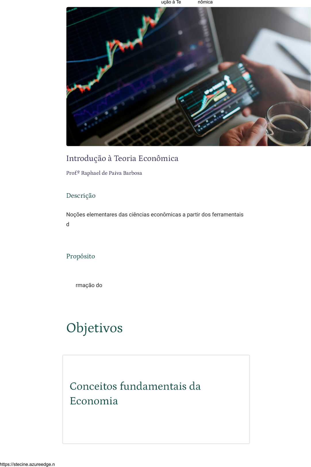 Introdução à Teoria Econômica Prof.º Raphael de Paiva Barbosa Descrição Noções elementares das ciências econômicas a partir dos ferramentais da Microeconomia, da Macroeconomia e do desenvolvimento econômico. Propósito Apresentar o funcionamento das firmas, a composição dos mercados e a formação dos grandes agregados econômicos, além dos reflexos dessas variáveis no cotidiano das organizações. Objetivos Módulo 1 Conceitos fundamentais da Economia Reconhecer os conceitos fundamentais da Economia. 15/06/24, 00:56 Introdução à Teoria Econômica https://stecine.azureedge.net/repositorio/00212ge/00158/index.html?brand=estacio# 1/59 Módulo 2 Microeconomia e comportamentos dos mercados Identificar os ferramentais básicos da Microeconomia na compreensão do comportamento de mercados distintos. Módulo 3 Agregados macroeconômicos Reconhecer os principais agregados macroeconômicos. Introdução Certamente em algum momento de sua vida você já se deparou com alguns dos questionamentos da próxima imagem. Todos esses questionamentos se referem ao campo de estudos da Economia, que estuda o funcionamento das atividades econômicas da sociedade global. Para compreender essa área de conhecimento, é necessário conhecer os conceitos fundamentais da Economia, os ferramentais básicos da Microeconomia e os principais agregados macroeconômicos.  15/06/24, 00:56 Introdução à Teoria Econômica https://stecine.azureedge.net/repositorio/00212ge/00158/index.html?brand=estacio# 2/59 1 - Conceitos fundamentais da Economia Ao �nal deste módulo, você será capaz de reconhecer os conceitos fundamentais da Economia. Conceitos fundamentais O estudo introdutório da Economia tem o intuito de estimular a busca por respostas para os principais problemas econômicos, demonstrar as principais teorias e correntes econômicas e sua aplicabilidade em questões práticas na vida dos indivíduos e no funcionamento das organizações. 15/06/24, 00:56 Introdução à Teoria Econômica https://stecine.azureedge.net/repositorio/00212ge/00158/index.html?brand=estacio# 3/59 Mas você sabe quando a economia moderna surgiu? De acordo com Pinho e Vasconcellos (2017), o marco inicial da economia moderna surgiu entre os séculos XVIII e XIX. Nessa época, foram fundamentados diversos princípios econômicos, desenvolvidos a partir de três tipos de concepções. Veja a seguir: Pinho e Vasconcellos Diva Benevides Pinho é doutora em Economia pela Faculdade de Economia pela FEA-US. Marco Antonio Sandoval de Vasconcellos doutor em Economia pela Faculdade de Economia, Administração e Contabilidade da Universidade de São Paulo (FEA/USP). Mecanicista Os economistas desse grupo explicavam as leis econômicas de maneira similar ao comportamento da Física, empregando, inclusive, a mesma terminologia (estática, dinâmica, elasticidade, fluidez etc.). Organicista 15/06/24, 00:56 Introdução à Teoria Econômica https://stecine.azureedge.net/repositorio/00212ge/00158/index.html?brand=estacio# 4/59 Os economistas desse grupo afirmavam que as leis econômicas se comportavam como um órgão vivo e usavam a mesma terminologia da Biologia (órgãos, funções, circulação, fluxos). Humanista Para os economistas desse grupo, a Economia é uma ciência social e reflete as atitudes do ser humano, cheias de aspectos psicológicos, e a preocupação em fixar relações de causa e efeito entre os fenômenos sociais. Como pudemos ver nas três concepções, a Economia possui uma forte inter-relação com outras ciências — Matemática, Estatística, Política, História, Geografia e Sociologia —, embora tenha o seu núcleo de estudo muito bem delimitado. Essa particularidade possibilita ao estudante interagir com vários outros domínios do conhecimento científico, empregando o seu ferramental teórico visto na Economia para avaliar de forma sistemática o comportamento humano em sociedade. Diante de tantas concepções, como podemos de�nir a Economia? Segundo Samuelson e Nordhaus (2004): A Economia pode ser definida como a ciência que estuda a forma como as sociedades utilizam os recursos escassos para produzir bens com valor e de como os distribuem entre os vários indivíduos. Observe que, nessa definição, estão presentes três conceitos fundamentais: Samuelson e Nordhaus Paul Anthony Samuelson se formou em Economia, em Chicago e é autor do livro A Teoria Geral do Emprego, do Juro e da Moeda, por meio do qual revolucionou o pensamento econômico. William D. Nordhaus é professor na Universidade de Yale e é o criador do 15/06/24, 00:56 Introdução à Teoria Econômica https://stecine.azureedge.net/repositorio/00212ge/00158/index.html?brand=estacio# 5/59 modelo de avaliação integrado, modelo quantitativo que descreve a interação global entre a economia e o clima. Escassez Representa o objeto da economia e consiste em uma restrição física, afinal, temos meios de produção e recursos insuficientes para atender aos desejos e necessidades de todos os seres humanos. E�ciência Está relacionada à combinação ótima dos insumos produtivos (trabalho, capital e terra) para obter a máxima produção e ao uso racional dos meios disponíveis para alcançar um objetivo previamente determinado. Equidade É a distribuição justa da prosperidade econômica entre os membros da sociedade. A desigualdade de renda é consequência de uma baixa equidade. Atualmente, podemos perceber que a equidade talvez seja o grande desafio de ser colocado em prática de forma ampla. Alguns economistas, para explicar a situação da desigualdade de renda, afirmam ser preciso esperar o bolo crescer para depois distribuir, pois não se pode distribuir o que não foi produzido. Mas o que isso signi�ca? Vamos utilizar os três conceitos mencionados para fundamentar a explicação. Para muitos economistas, a relação entre eficiência e equidade no sistema econômico representa um trade-off, situação em que há um conflito