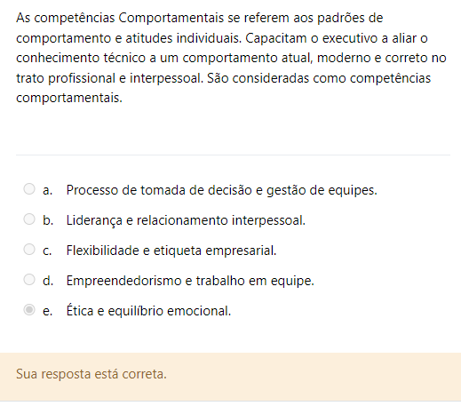 As competências Comportamentais se referem aos padrões de comportamento e atitudes individuais. Capacitam executivo a alian conhecimento técnico a um comportamento atual, moderno e correto no trato profissional e interpessoal. São consideradas como competências comportamentais. a. Processo de tomada de decisão e gestão de equipes. b. Liderança e relacionamento interpessoal. Flexibilidade e etiqueta empresarial. d. Empreendedorismo e trabalho em equipe. e. Ética e equilíbrio emocional. Sua resposta está correta.