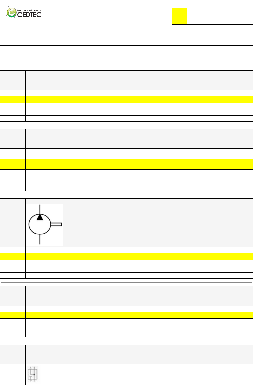 Pincel Atômico - 03/08/2024 13:02:40 1/3 PILATOS ARIMATEIA DA PAIXAO Avaliação Online - Todos Capitulos/Referencias (Curso Online - Automático) Atividade finalizada em 29/07/2024 21:34:24 (2423450 / 1) LEGENDA Resposta correta na questão # Resposta correta - Questão Anulada X Resposta selecionada pelo Aluno Disciplina: HIDRÁULICA E PNEUMÁTICA [1208386] - Avaliação com 10 questões, com o peso total de 70,00 pontos [capítulos - Todos] Turma: Qualificação: Hidráulica e Pneumática - Grupo: QONLINE - Qidr0A220724 [135559] Aluno(a): 91113241 - PILATOS ARIMATEIA DA PAIXAO - Respondeu 7 questões corretas, obtendo um total de 49,00 pontos como nota [350034_1061 2] Questão 001 Qual a vazão em l/min de bomba hidráulica de 100 cm³/rot quando acionada por um motor elétrico de 1800 RPM? 150 lts/min X 180 lts/min 200 lts/min 100 lts/min 210 lts/min [350034_7034 ] Questão 002 Quais as características do método cascata? Requer experiência em implementação ,limita-se a circuitos de porte médio , seu emprego é inadequado em circuitos compostos ,possui garantia operacional. X Requer experiência em implementação ,limita-se a circuitos de porte médio,seu emprego é inadequado em circuitos compostos e não possui garantia operacional. Não requer experiência em implementação , limita-se a circuitos de porte grande ,seu emprego é inadequado em circuitos compostos e não possui garantia operacional. Requer experiência em implementação ,limita-se a circuitos de porte médio,seu emprego é inadequado em circuitos simples e possui garantia operacional. [350034_1448 12] Questão 003 O símbolo abaixo representa qual componente hidráulico? Balança hidráulica X Bomba hidráulica Válvula direcional Válvula limitadora de pressão Cilindro hidráulico [350034_1447 88] Questão 004 Com são representados os circuitos hidráulicos? Através de texto descritivo X Através de símbolos que representam os componentes do sistema Através de código numero Através de desenho descritivo com todas as especificações do sistema Não e possível representar um circuito hidráulico [350034_1038 0] Questão 005 Referente aos tipos de centros possíveis em uma válvula direcional, quais das figuras a seguir indica o tipo de centro Tandem? Pincel Atômico - 03/08/2024 13:02:40 2/3 X [350035_1447 75] Questão 006 Calcule a foça aplicada pelo cilindro de 100 mm de diâmetro e pressão de 20 N/mm² 157 N 25 mil Kg 57 mil N 100 kg X 157 mil N [350035_4787 5] Questão 007 São causas de filtro de ar de reservatório de baixa qualidade ou entupido: Deformação de componentes, aumento de temperatura do óleo. Vazão irregular, Contaminação do óleo Contaminação do óleo, deformação do reservatório. X Entrada de água no reservatório, aumento de temperatura do óleo. Cavitação, vazão irregular2 [350035_1038 4] Questão 008 A forma de trabalho dos atuadores promovem sua classificação. Essas classificações são previamente conhecidas. Dentre as alternativas abaixo, tem uma que não representa uma forma classificar os atuadores. Escolha esta alternativa Motores hidráulicos unidirecionais Atuadores lineares de simples ação Motores hidráulicos bidirecionais X Motores hidráulicos tridimensionais Atuadores lineares de dupla ação [350033_7864 ] Questão 009 Com relação ao diagrama pneumático exposto na figura apresentada, é correto afirmar que: X A válvula V1 possui 5 vias e 2 posições, com acionamento elétrico com detente e retorno por mola O atuador linear A é do tipo dupla ação com amortecimento fixo nos finais de curso S1 e S2 são botões pulsadores, respectivamente, do tipo NF e NA para ligar e desligar o circuito A válvula V1 possui 5 vias e 2 posições, com acionamento combinado elétrico e muscular e com retorno por ação de mola. A válvula V1 possui 5 vias e 2 posições, com acionamento elétrico e retorno por ação de mola. Pincel Atômico - 03/08/2024 13:02:40 3/3 [350033_7865 ] Questão 010 Com relação ao diagrama pneumático exposto na figura apresentada, é correto afirmar que: Marque a opção correta quanto ao tipo de acionamento exposto na figura acima. Comando elétrico de autorretenção e comportamento desligar dominante Comando elétrico de autorretenção e comportamento ligar dominante X Comando elétrico com acionamento bimanual Comando elétrico de Manual e comportamento ligar dominante Comando elétrico bimanual com acionamento temporizado através de Y1