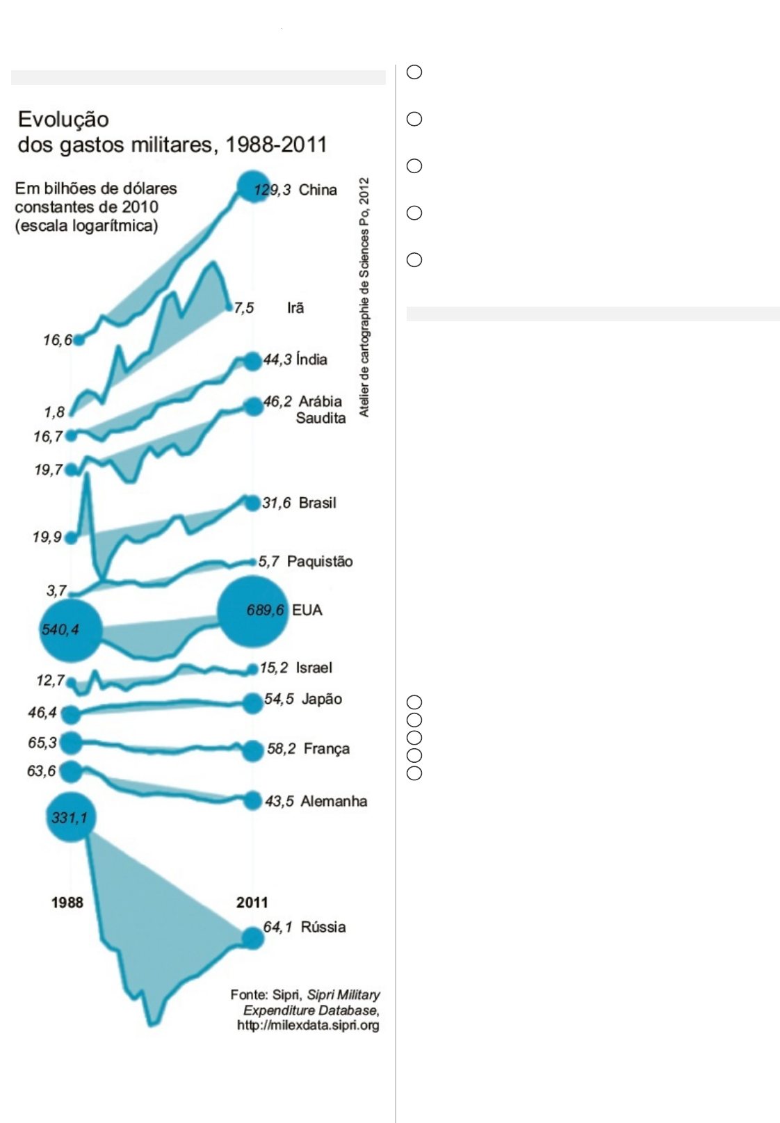 Simulado 30 questões PUC-SPQuestão 1 Veja o gráfico: O gráfico ajuda a perceber aspectos importantes do quadro geopolítico e econômico mundial. A esse respeito é correto dizer que a b c d e o perfil dos gastos militares da China e da Rússia é inversamente proporcional aos índices de crescimento de suas economias. a relativa tendência de estabilidade de gastos militares de Israel e da Arábia Saudita é um bom indicativo do caminho seguro em direção à paz no Oriente Médio. os EUA mantêm a primazia dos gastos militares em função da força da lógica geopolítica que associa interesses econômicos e proteção militar. ainda se notam, no perfil dos gastos militares dos países, elementos que podem ser interpretados como resquícios do período da Guerra Fria. o crescimento expressivo de gastos militares do Brasil no período coincide com a agressiva ação geopolítica do Brasil, na América do Sul e na África. FUVEST a b c d e Questão 2 O mundo tem vivido inúmeros conflitos regionais de repercussão global que, por um lado, envolvem intervenções de tropas de diferentes países e, por outro lado, resultam em discussões na Organização das Nações Unidas. Considere as seguintes afirmações: I. Povos primitivos precisam ser tutelados pela diplomacia internacional ou reprimidos por forças de nações desenvolvidas, para que conflitos locais ou regionais não perturbem o equilíbrio mundial. II. Razões estratégicas, de localização geográfica, de orientação política ou de concentração de recursos naturais, fazem com que certas regiões ou países sejam alvo de interesses, preocupações e intervenções internacionais. III. Diferenças étnicas, culturais, políticas ou religiosas, com raízes históricas, têm resultado em preconceito, desrespeito e segregação, gerando tensões que repercutem em conflitos existentes entre diferentes nações. O envolvimento global em conflitos regionais é, corretamente, explicado em I, apenas. II, apenas. I e III, apenas. II e III, apenas. I, II e III. Assunto: geopolítica e globalização · UNICENTRO a b c d e Questão 3 O Tratado de Parceria do Pacífico (TPP) é um mega-acordo de comércio entre 12 países, em vigor desde 2006. Sua origem é um pequeno acordo de livre comércio entre Brunei, Chile, Cingapura e Nova Zelândia. Começou a despertar a atenção das empresas e dos governos, quando os Estados Unidos anunciaram o interesse em fazer parte desse acordo de comércio. Mais países se somaram às negociações (Austrália, Peru, Vietnã, Malásia, Canadá, México e Japão). Em outubro de 2015, na reunião ministerial entre os países-membros do TPP [...], as negociações foram concluídas. O próximo passo será a ratificação do acordo por meio de aprovação em seus parlamentos ou congressos no prazo de dois anos. (MIYAZAKI, 2016, p. 10). A partir da análise do texto e dos conhecimentos sobre o comércio internacional, é correto afirmar: Os países participantes do acordo não apresentam disparidades econômicas. O TPP faz sentido para os países-membros porque eles se completam e podem trocar recursos naturais por bens de valor agregado. A soma dos PIBs dessas economias corresponde a 80% da do PIB mundial, tornando esse acordo muito ameaçador para o comércio internacional. O TPP está restrito aos aspectos relativos ao comércio de alimentos e de petróleo. O Brasil não participa do comércio com esses países porque a produção brasileira não suporta a concorrência, principalmente em setores, como o de grãos e da pecuária de corte. ENEM PPL a b c d e Questão 4 Ninguém vive sem ocupar espaço, sem respirar, sem alimentar-se, sem ter um teto para abrigar-se e, na Modernidade, sem o que se incorporou na vida cotidiana: luz, telefone, televisão, rádio, refrigeração dos alimentos etc. A humanidade não vive sem ocupar espaço, sem utilizar-se cada vez mais intensamente das riquezas naturais que são apropriadas privadamente. RODRIGUES, A. M. Desenvolvimento sustentável: dos conflitos de classes para os conflitos de gerações. In: SILVA. J. B. et al. (Orgs.). Panorama da geografia brasileira. São Paulo: Annablume, 2006 (fragmento). O texto defende que duas mudanças provocadas pela ação humana na Modernidade são o(a) alteração no modo de vida das comunidades e a delimitação dos problemas ambientais em escala local. surgimento de novas formas de apropriação dos territórios e a utilização pública dos recursos naturais. incorporação de novas tecnologias no processo produtivo e a aceleração dos problemas ambientais. aumento do consumo de bens e mercadorias e a utilização de mão de obra nas unidades produtivas. esgotamento das reservas naturais e a desaceleração da produção de bens de consumo humano. PUC-SP a b c d Questão 5 As pessoas mais pobres do mundo vêm de muitas terras longínquas e acabam perecendo no Triângulo de Afar, na Etiópia, um dos desertos mais quentes da Terra. (...) Em algumas das sepulturas de imigrantes sem dúvida jazem somalis: refugiados de guerra. Outras provavelmente contêm desertores da Eritréia. Ou oromos etíopes enfraquecidos pela seca. (...) Há quanto tempo depomos nossos ossos nessas trilhas desoladas do Chifre da África? (National Geographic – 08/2019 – especial migrações). As afirmações seguintes adotam caminhos distintos na evolução sobre o que foi dito acima. Assinale a única alternativa que segue um caminho CORRETO. Os refugiados somalis são uma consequência de grupos terroristas que atuam no país, sendo o mais importante deles o Boko Haram, grupo fundamentalista islâmico xiita. O Triângulo de Afar, ou Depressão de Afar, abrange Etiópia, Eritréia, Djibuti e avança pelo Sahel até a base da cadeia do Atlas, em território líbio. Possui as temperaturas médias mais elevadas do mundo, sobretudo no deserto de Danakil. Entre os países que formam o Chifre da África, estão Etiópia, Eritréia e Somália. Este 