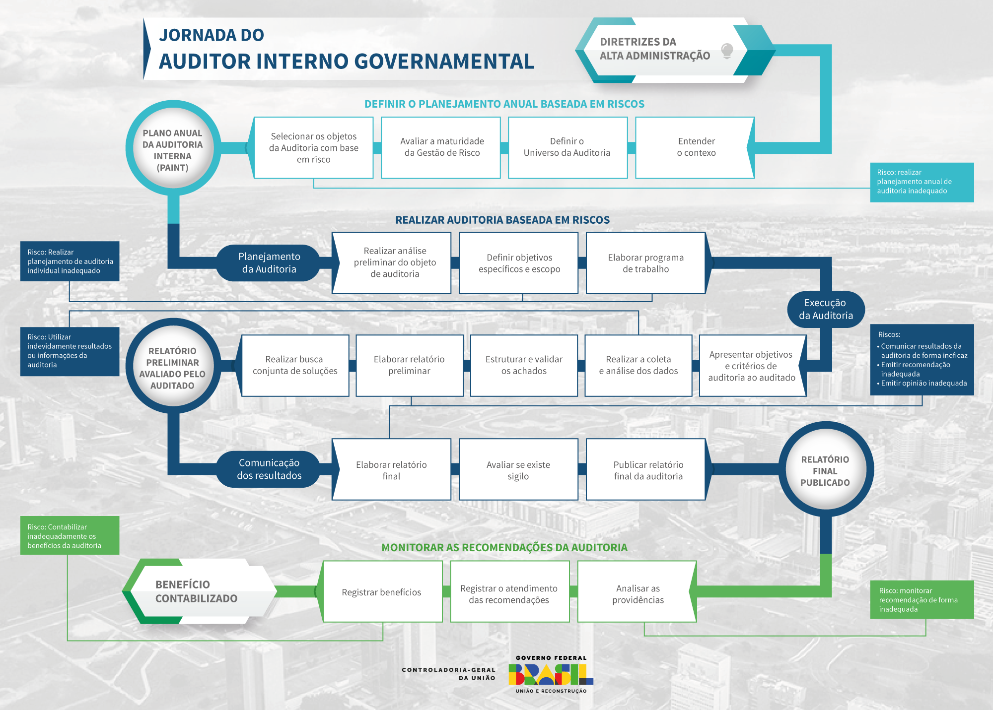 JORNADA DO DIRETRIZES DA AUDITOR INTERNO GOVERNAMENTAL ALTA ADMINISTRAÇÃO DEFINIR PLANEJAMENTO ANUAL BASEADA EM RISCOS PLANO ANUAL Selecionar os objetos DA AUDITORIA a maturidade Definir o Entender da Auditoria com base INTERNA da Gestão de Risco Universo da Auditoria o contexo em risco (PAINT) Risco: realizar planejamento anual de auditoria inadequado REALIZAR AUDITORIA BASEADA EM RISCOS Risco: Realizar Realizar análise planejamento de auditoria Planejamento preliminar do objeto Definir objetivos Elaborar programa individual inadequado da Auditoria de auditoria específicos e escopo de trabalho Execução da Auditoria Risco: Utilizar Riscos: indevidamente resultados Comunicar resultados da RELATÓRIO ou informações da Realizar a coleta Apresentar objetivos auditoria de forma ineficaz PRELIMINAR Realizar busca Elaborar relatório Estruturar e validar auditoria e critérios de Emitir recomendação AVALIADO PELO conjunta de soluções preliminar os achados e análise dos dados auditoria ao auditado inadequada AUDITADO Emitir opinião inadequada Comunicação RELATÓRIO Elaborar relatório se existe Publican relatório FINAL dos resultados final sigilo final da auditoria PUBLICADO Risco: Contabilizar inadequadamente os benefícios da auditoria MONITORAR AS RECOMENDAÇÕES DA AUDITORIA BENEFÍCIO Registrar o atendimento Analisar as Registrar benefícios Risco: monitorar CONTABILIZADO das recomendações providências recomendação de forma inadequada GOVERNO FEDERAL CONTROLADORIA-GERAL DA UNIAO RECONSTRUÇÃO